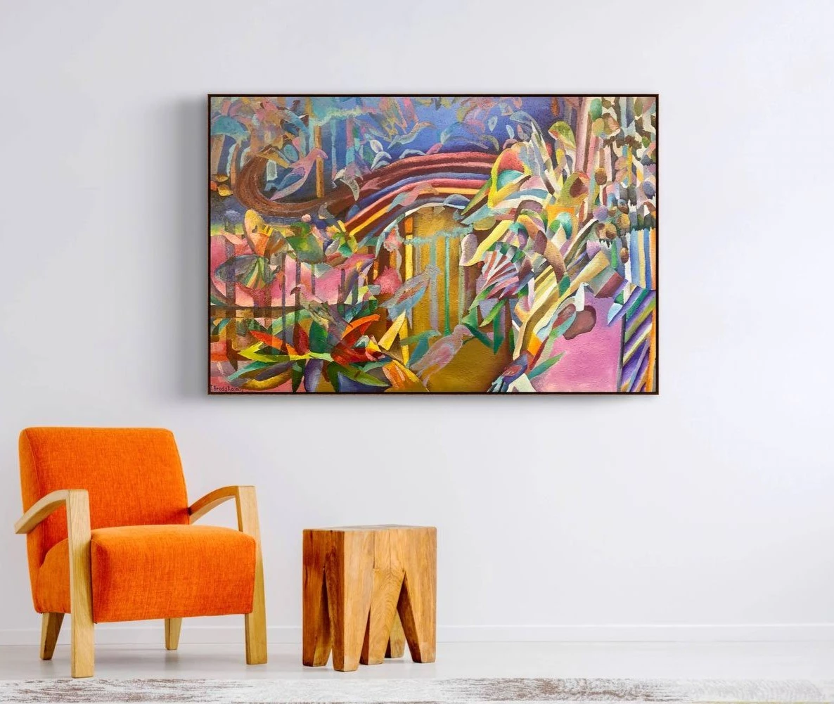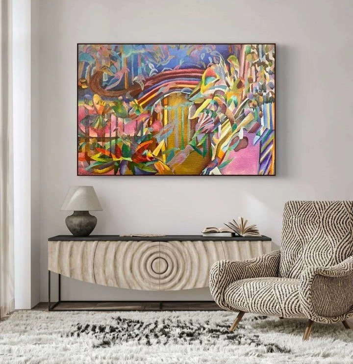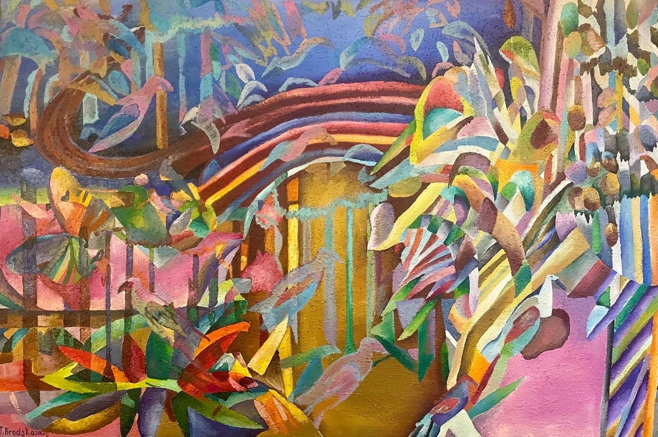 Тропические цветы и птицы поместились на этот холст. Они осели среди песка и масла. В призрачных кружевах рассвета.