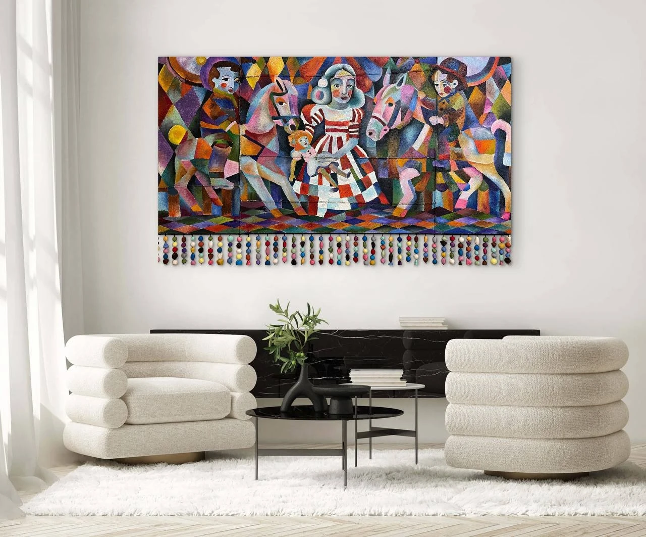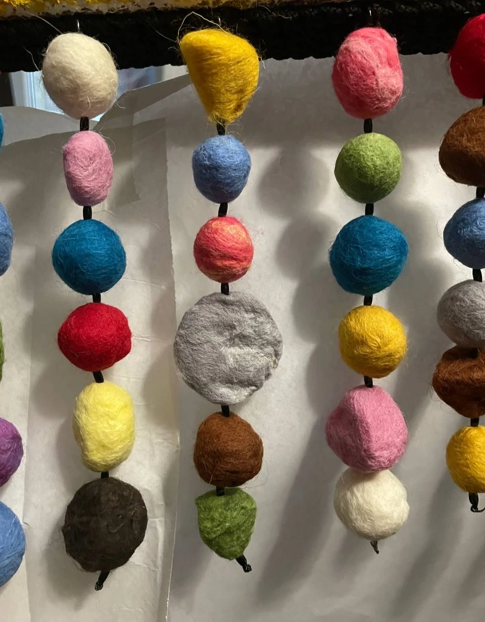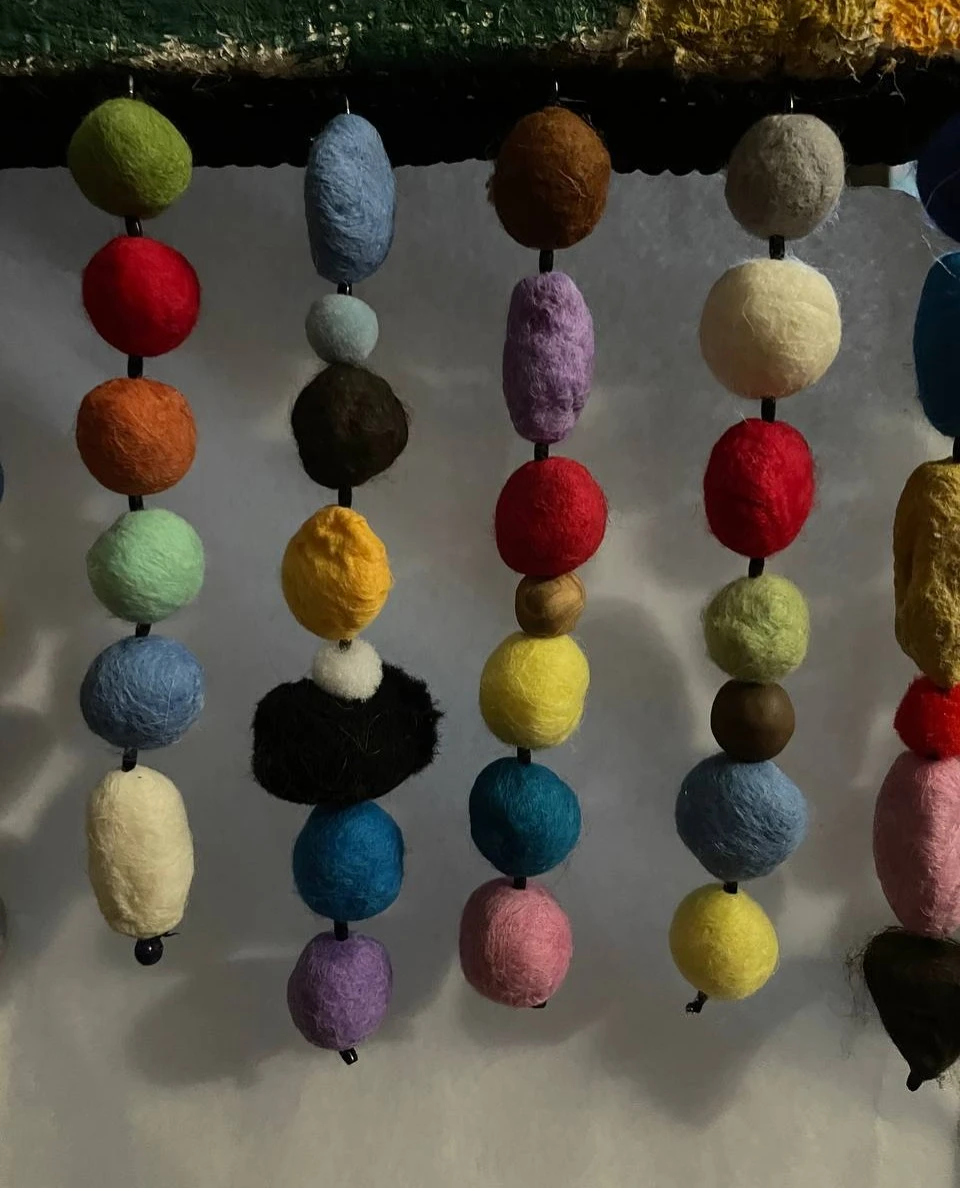 Грубая поверхность не даёт забыть о времени: песок царапает, брезент не хочет лежать ровно, но швы крепко держат лоскуты полотна. А внизу, под рамой, свисают разноцветные войлочные шарики — как конфетти, которые когда-то падали из под купола.