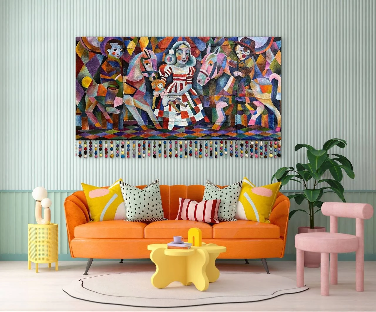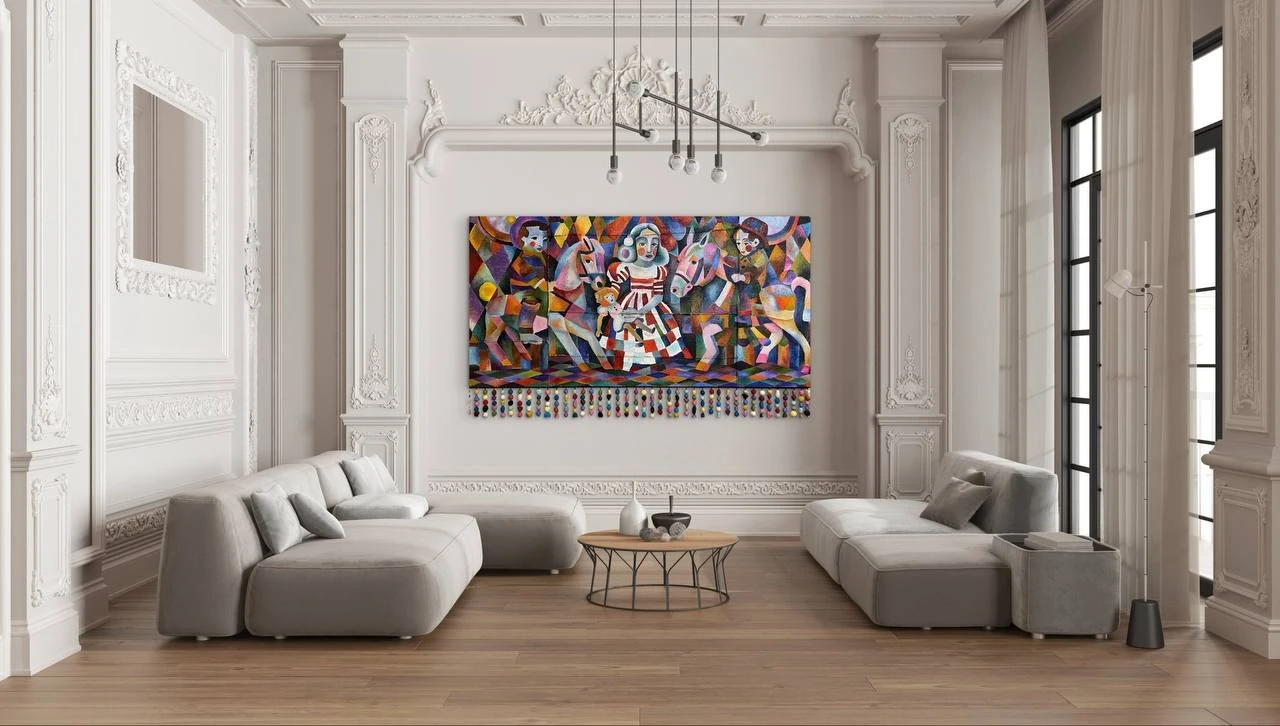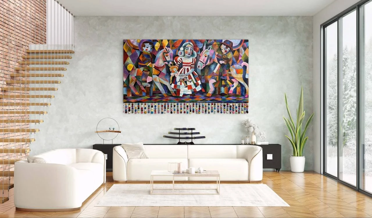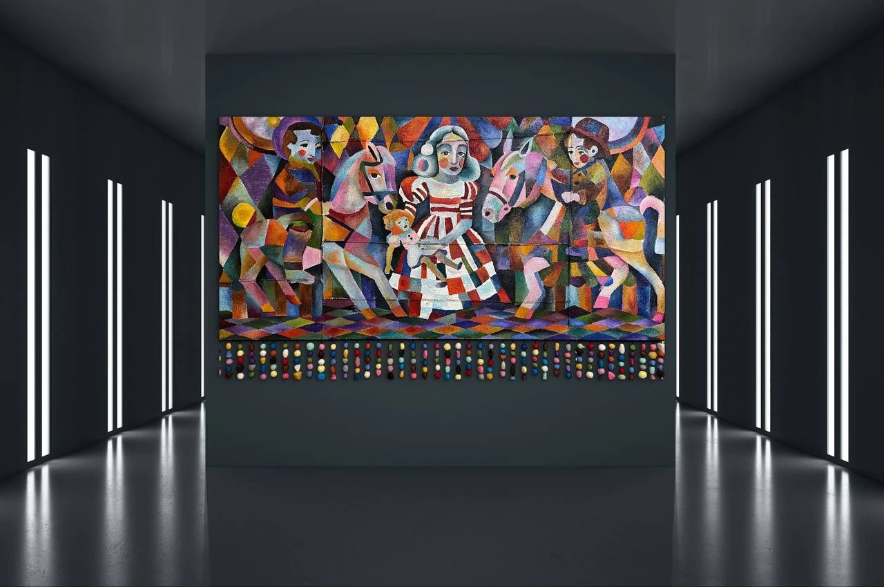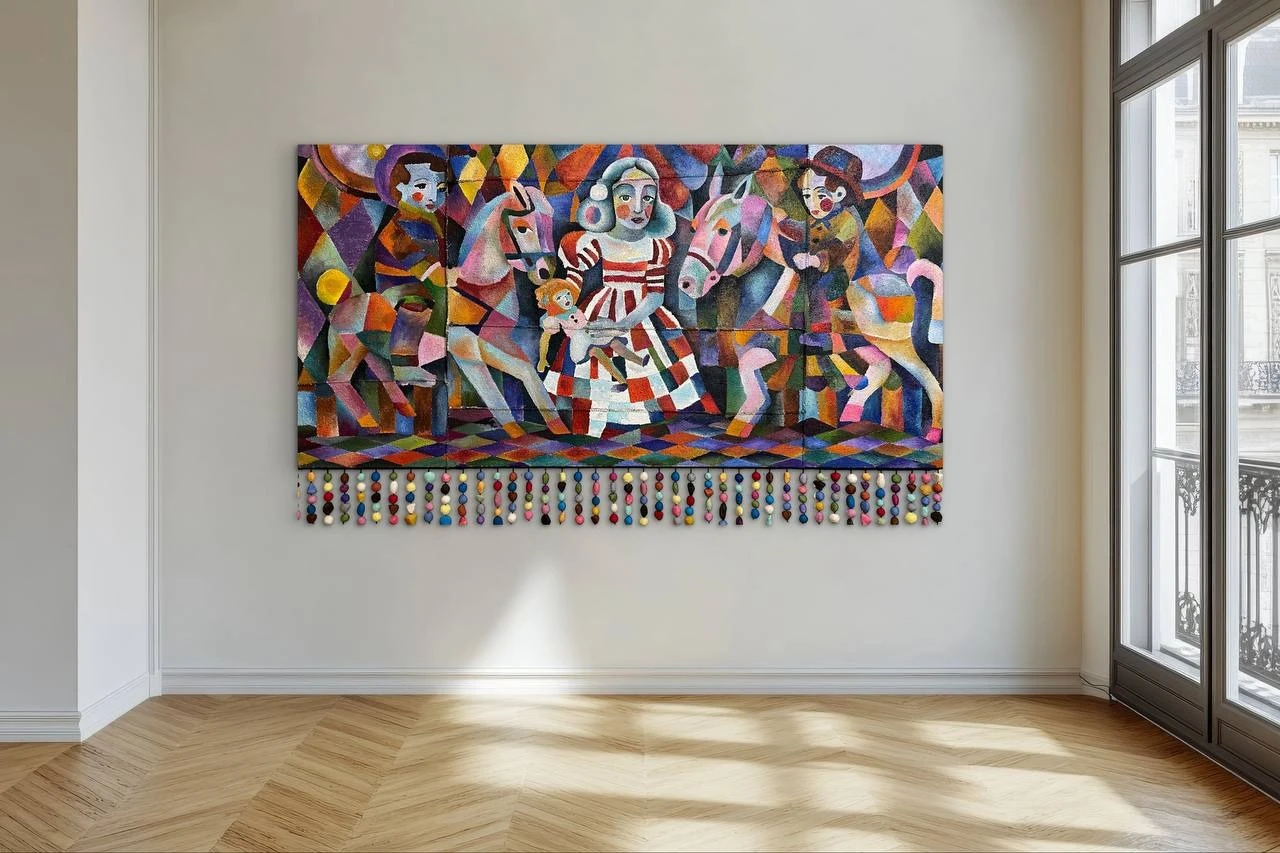 В центре — девочка в полосатом клоунском сарафане. Она стоит неподвижно, будто только что вышла из толпы, а вокруг неё взрывается розовый вихрь: лошади, жокеи-клоуны — всё сливается в сплошное радостное пятно. Формы нарочито угловатые, почти детские, цвета кричащие, как афиши. Это то, как запоминает ребёнок: слишком ярко, слишком громко, слишком много всего сразу.