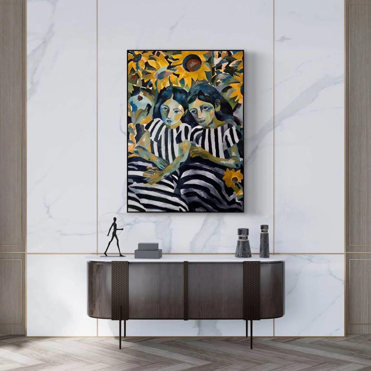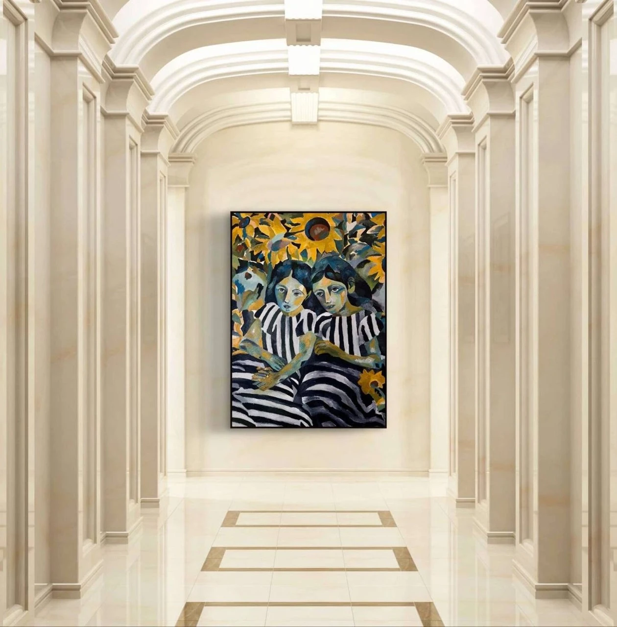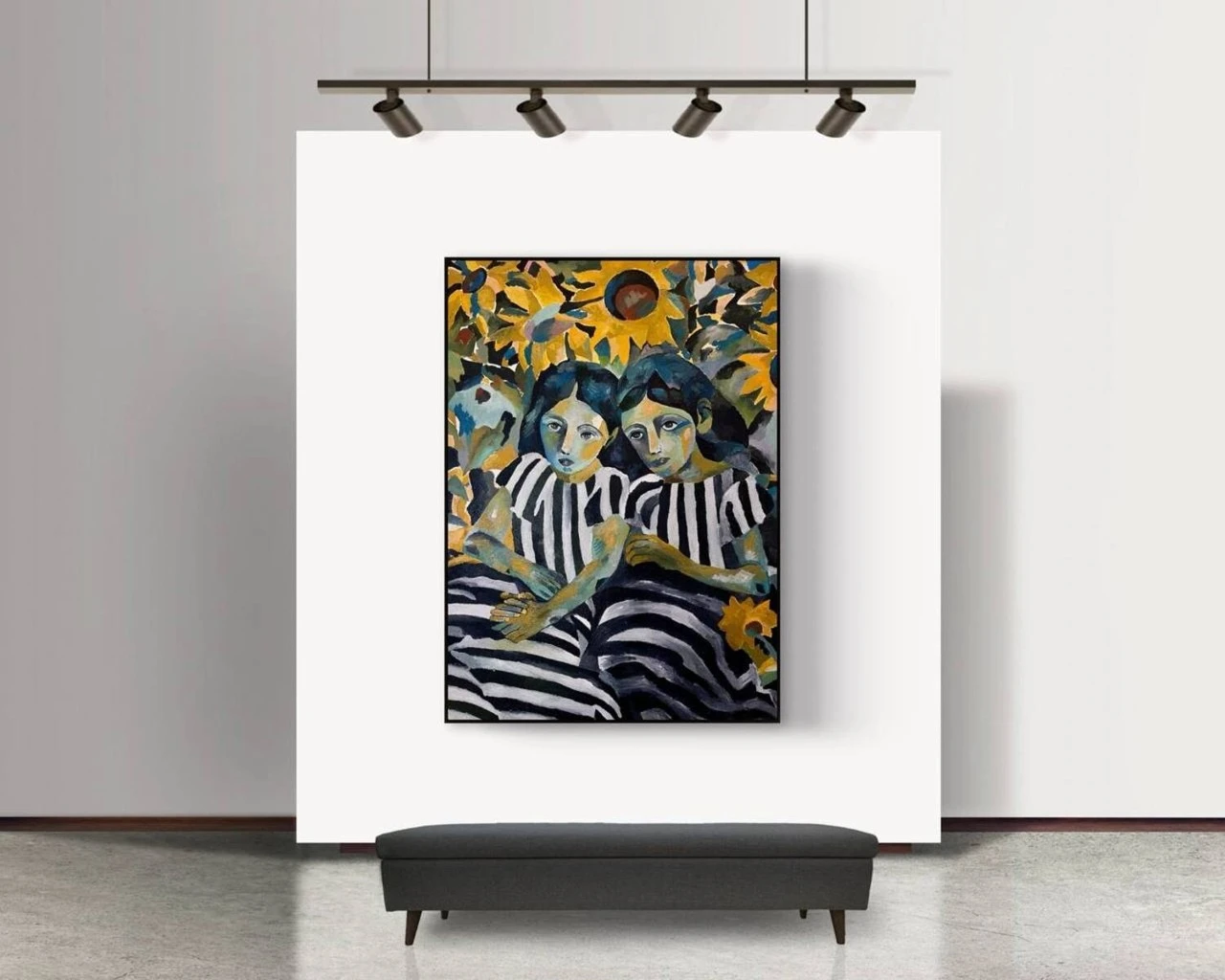 Работа «СОФА И ГЕСЯ — ПРЯТКИ» — это авторская картина маслом на холсте, выполненная в экспрессивной манере. На полотне изображены две фигуры, предположительно девочки, в полосатых платьях, окруженные стилизованными подсолнухами. Композиция построена на контрасте темных и светлых полос одежды, создающих ритмический рисунок. Лица персонажей выполнены в приглушенных тонах с акцентами голубого и желтого, что придает им загадочность и глубину. Использование песка в масляной живописи добавляет текстурности и тактильности изображению.