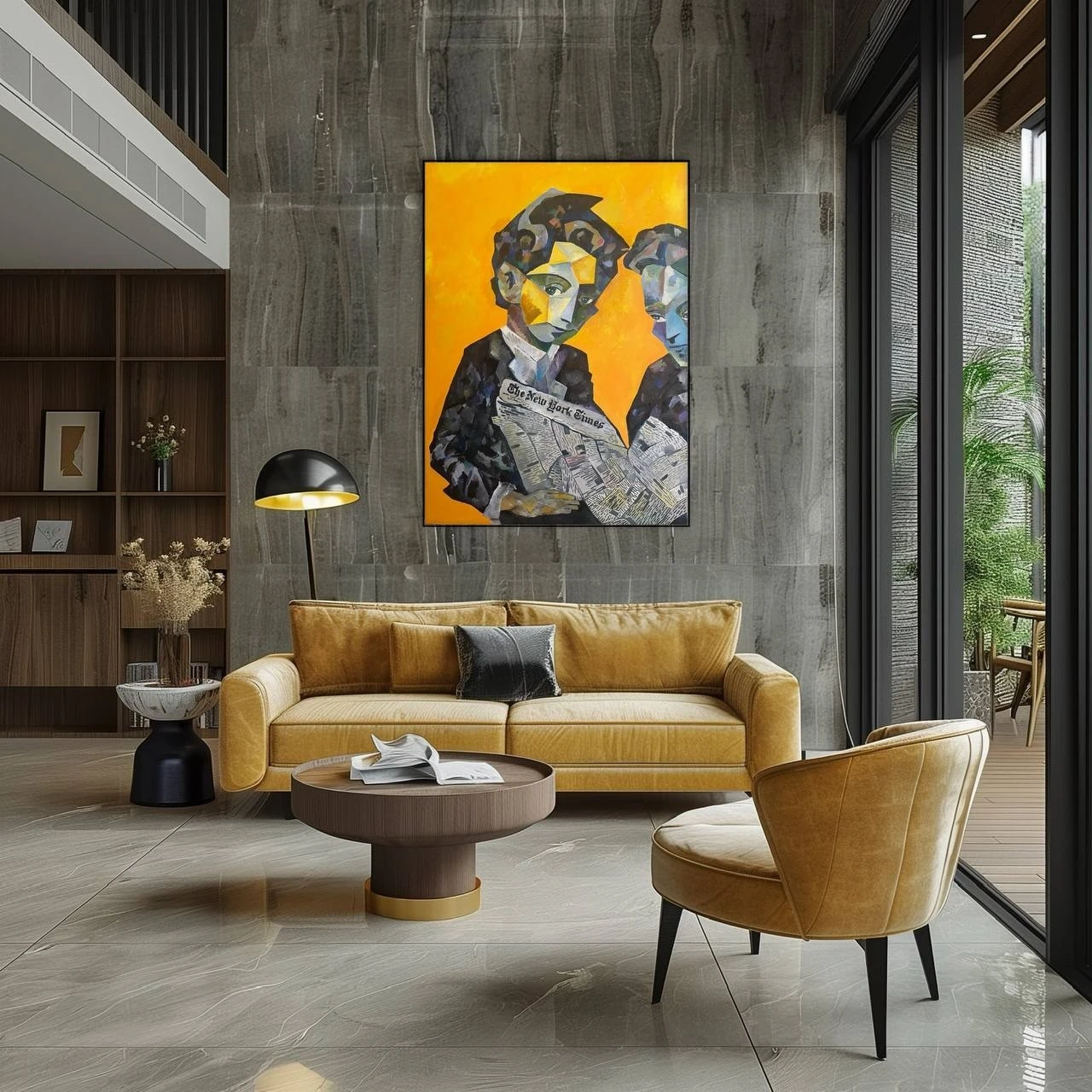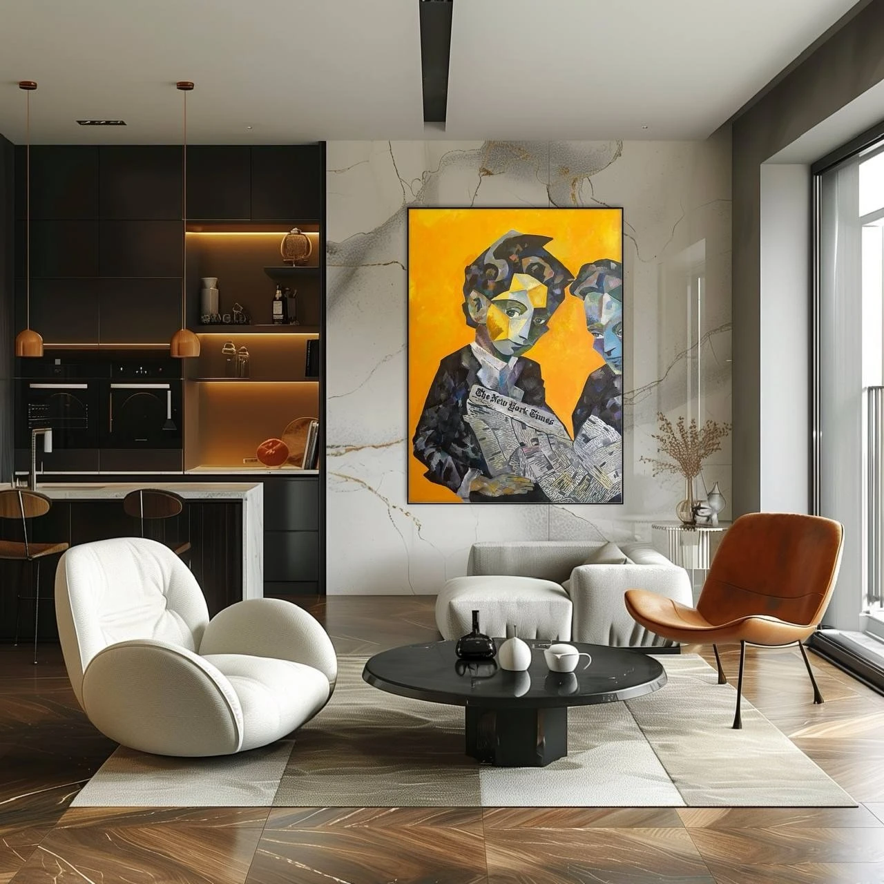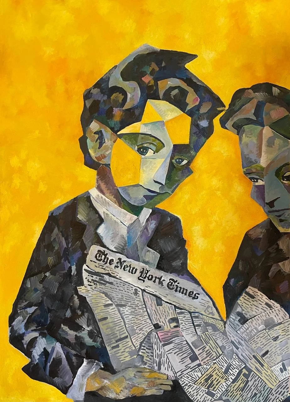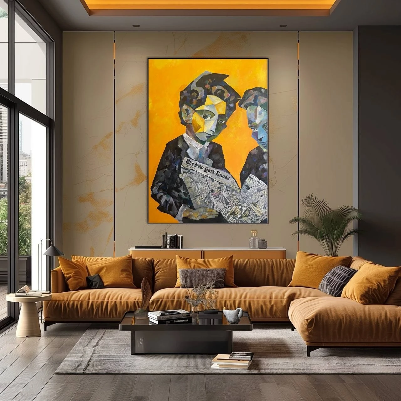 Яркий желтый фон контрастирует с приглушенными оттенками фигур и газеты, акцентируя внимание на сюжете. Детализация газетных полос и текстура одежды переданы через дробные мазки, придавая работе осязаемость. Авторская работа «СОЛОМОН ЧИТАЕТ БРАТУ» станет выразительным арт-объектом для интерьера, дополнит коллекцию современного искусства.
