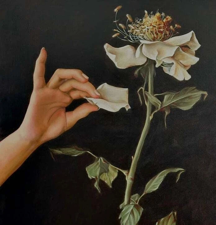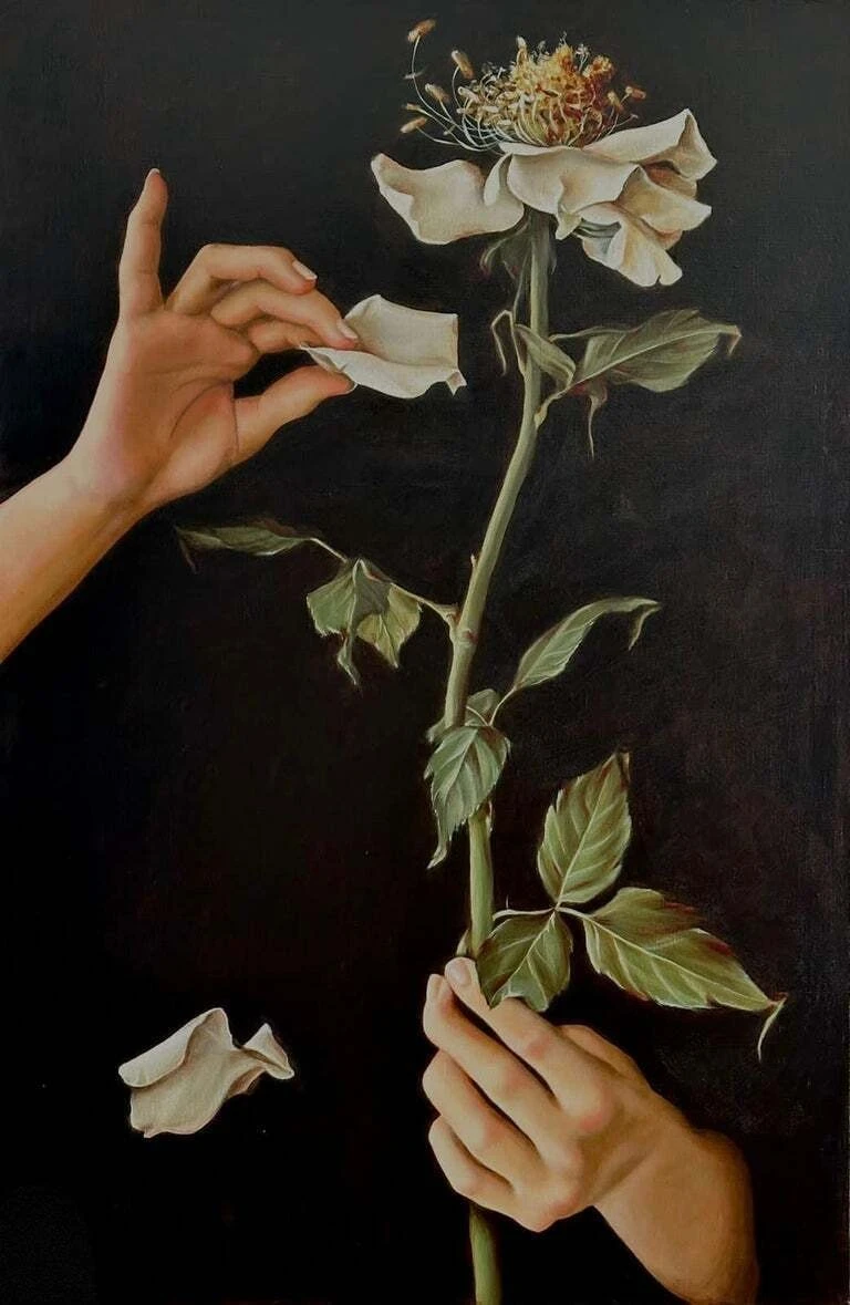 В этой работе роза — олицетворение личности человека, а руки-символ влияния общества на личность. Нарочито гиперувеличенные тычинки отображают красоту внутреннего мира и души , познать которую возможно со временем, все глубже и лучше узнавая человека , послойно и постепенно отрывая лепестки… А ведь порой сердцевина может оказаться едва заметной, а то и вовсе отсутствовать…