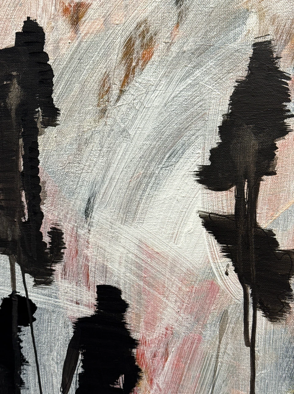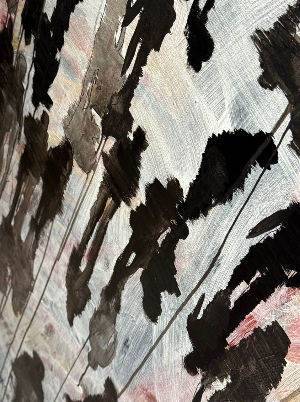 Мир людей, гуляющие по снегу тени создают ощущение единого пятна, в котором не видно индивидуальности. Картина входит в серию работ, где художница исследует взаимодействие людей, жизнь в городской среде и своё отношение к социуму.