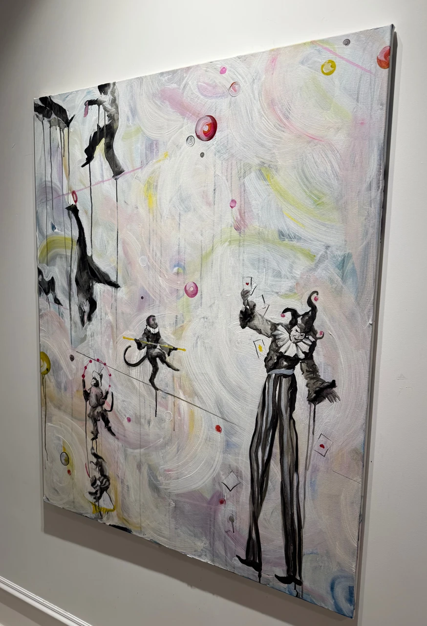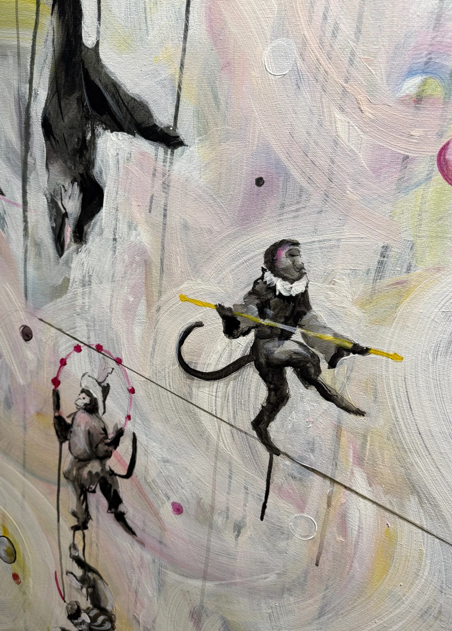 Цирковые образы и символы выбраны художницей для изображения времени в которое мы живем, зритель смотрит на представление, а артисты скрыты за масками, обезьяны - символ подражания и имитации, джокер - символ непредсказуемости и свободы