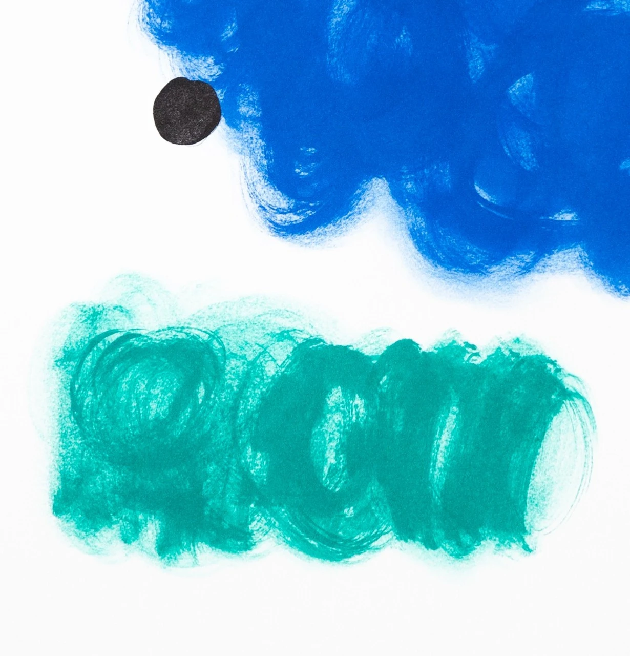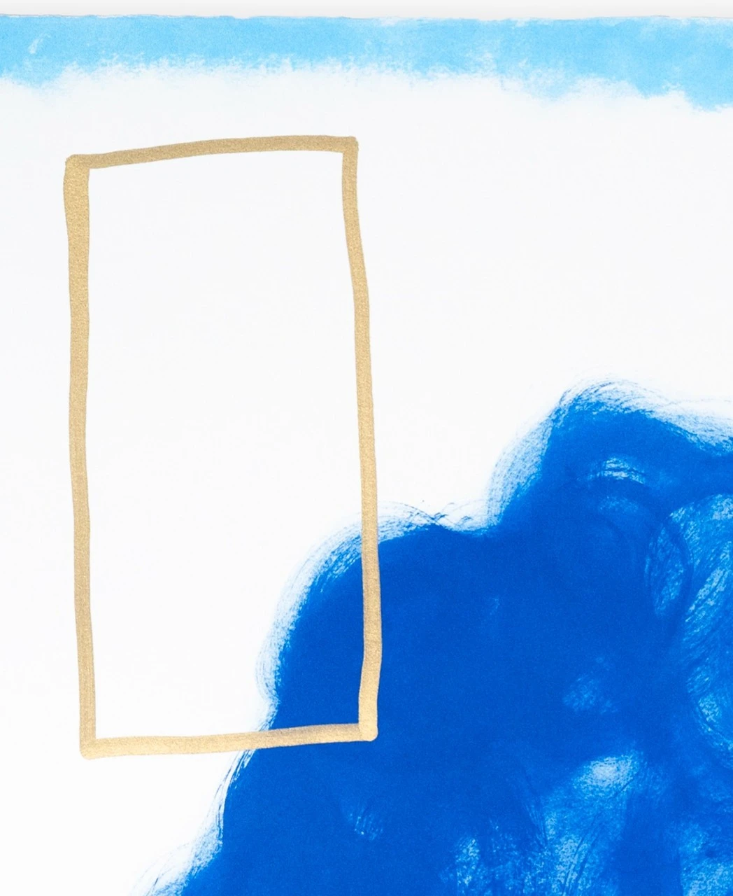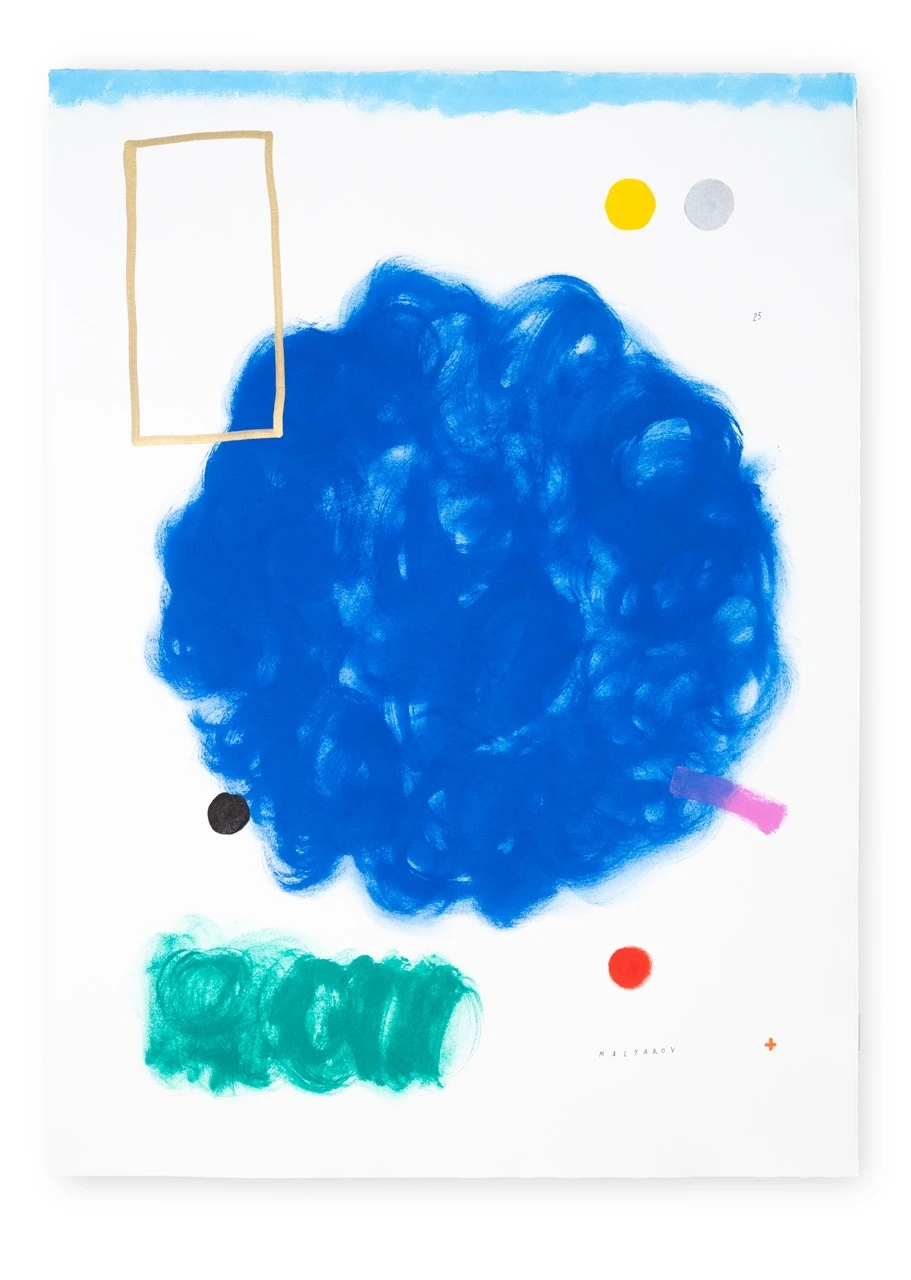Свободная и насыщенная синяя форма заполняет центр композиции, будто облако мысли или эмоциональный импульс. Вокруг неё — созвездие символов: золотой прямоугольник, красная и чёрная точки, полоска розового, пятно зелёного, следы жёлтого и серого. Все элементы словно парят в белом пространстве, удерживая равновесие между спонтанностью и точностью. Работа говорит языком жеста, цвета и внутреннего ритма, пробуждая ассоциации, но не навязывая смыслы.