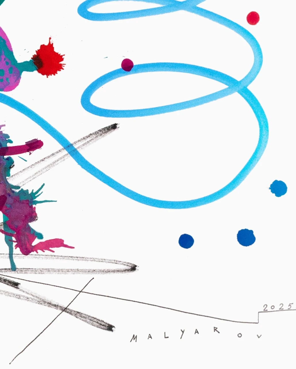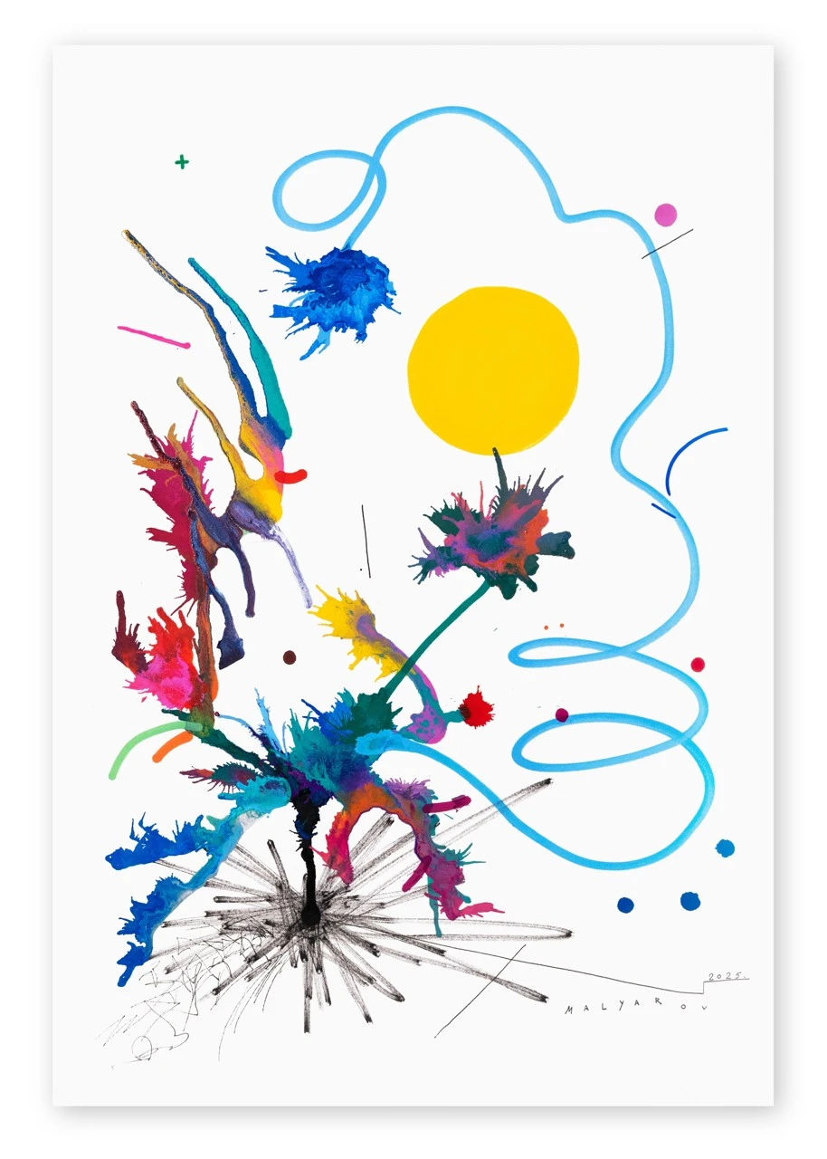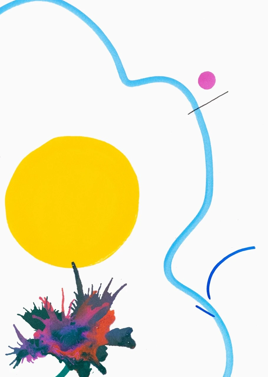 Оригинальная абстрактная картина, выполненная спиртовыми маркерами, тушью и акрилом на бумаге. В центре композиции — взрыв энергии: цветные всплески, органичные линии и динамичные пятна, словно отражающие внутреннее движение жизни. Над этим хаосом — чистый желтый круг, символ солнца, энергии и внутреннего света.