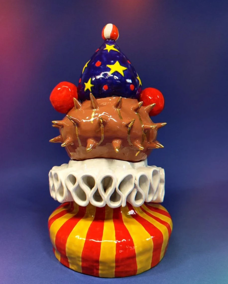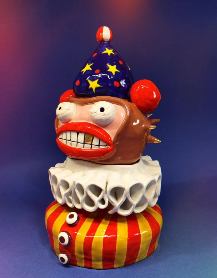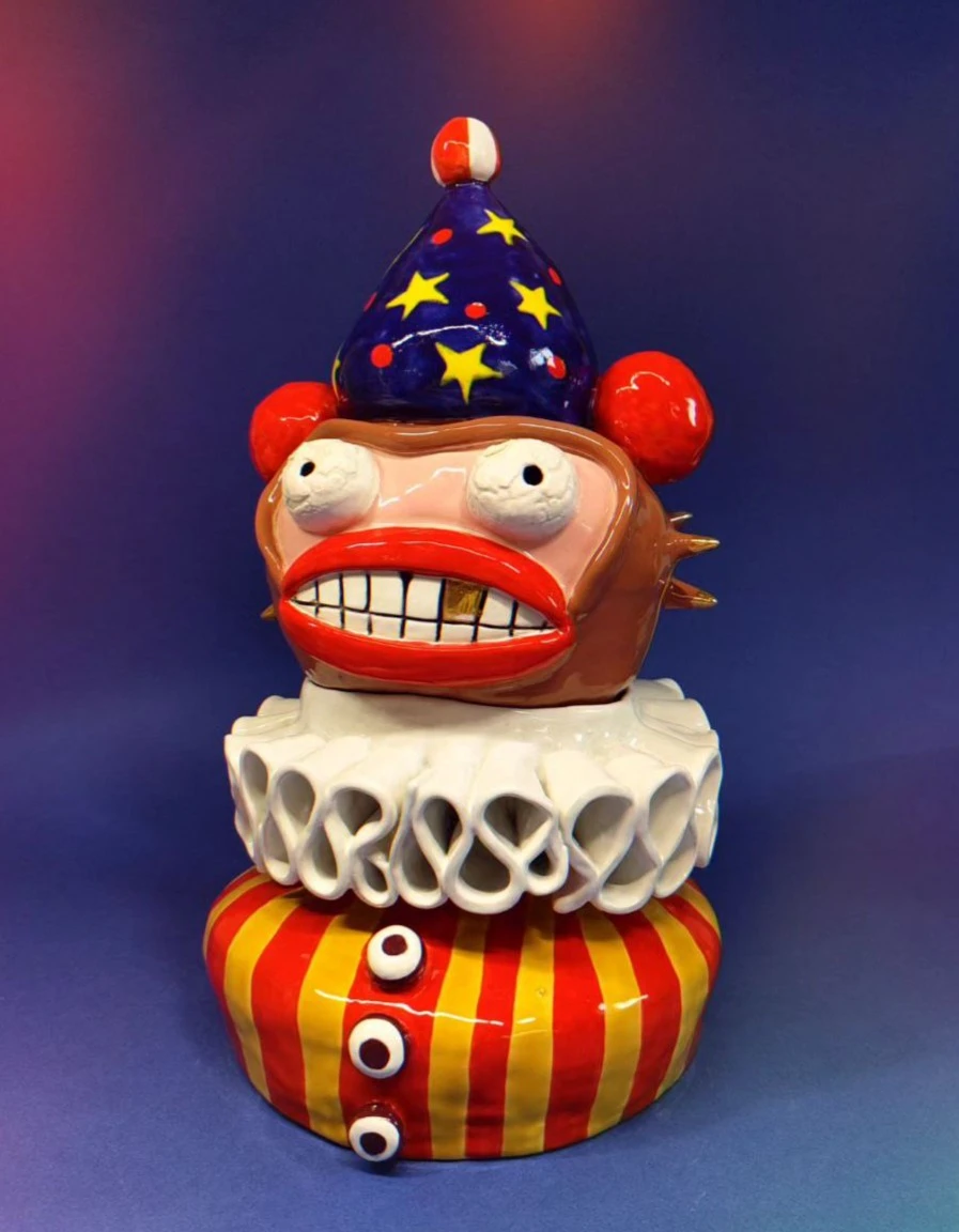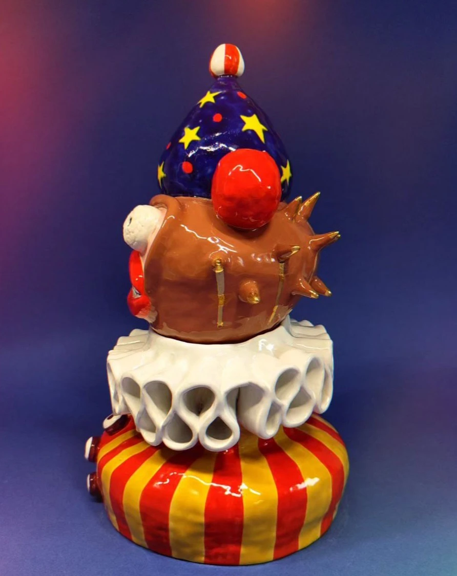 Обезьяна в жабо, ее голова снимается и она превращается в вазу. Это та самая обезьяна, которая бьет в тарелки и смотрит прямо в душу.