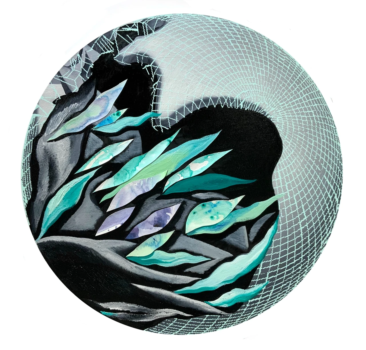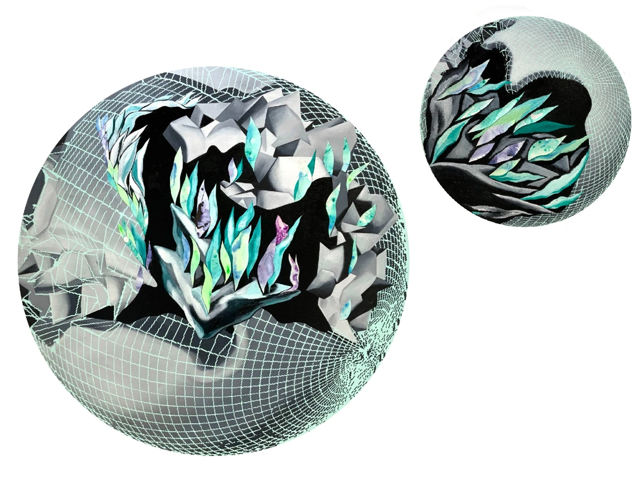 Каков мир сейчас и к какому миру мы идём? Эти вопросы я ставлю для себя и для зрителя как осознанная попытка взглянуть на процессы в которых мы находимся и которые выводят человека в новое пространство взаимодействия между миром живой жизни и технологическим прогрессом матричного мира. Данная абстрактная работа представляет собой образ где технический мир существует в сотворчестве с природой. При том каждый из них не существует в привычной форме нашего понимания, они сами собой видоизменяются и кристаллизуются при взаимодействии друг с другом, создавая нечто новое. На мой взгляд это истинная форма сотворчества и партнерства которая должна быть во всем как эквивалент жизни, без перекосов в одну или другую сторону. Сформированная сфера — это модель мира. Пиксельная сетка — матричная структура держащая мир. Форма сферы становится кристаллической и сквозь нее прорастают растения, как живая форма жизни в холодной матричной структуре.