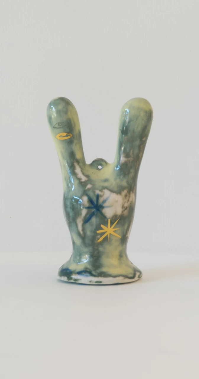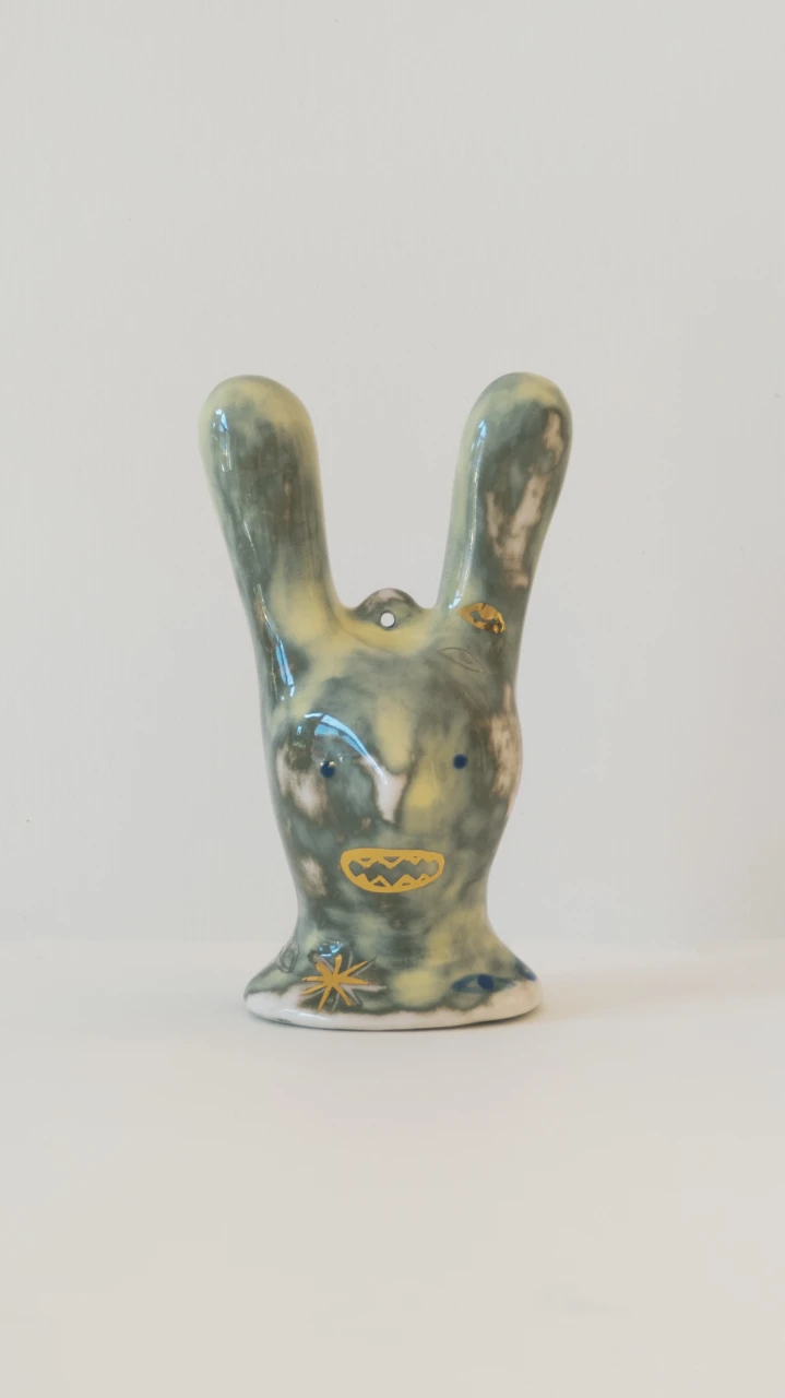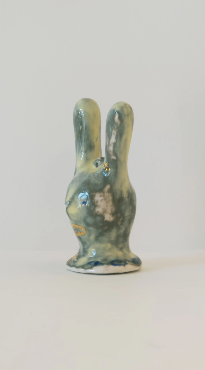 Серия ёлочных украшений, созданная в коллаборации художника Ульяны Пучеглазовой и керамистки Кати Ланчиковой. "Нам хотелось создать игрушку, которая сохранит дух зимних праздников и при этом будет авторской скульптурой, с читаемым почерком авторов." Катя создала форму абстрактного зайца и отлила тираж из полуфарфора, Ульяна расписывала зайцев подглазурными красками и позолотой.