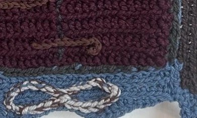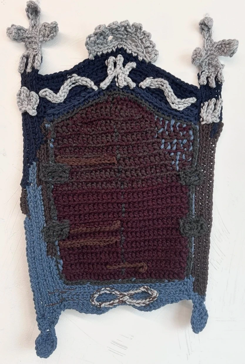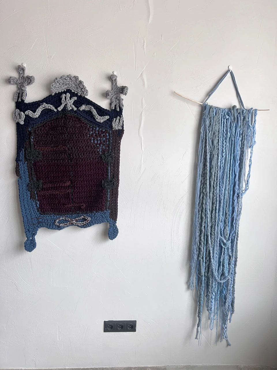 Работа из полушерсти, без твердой основы. Размещение работы возможно настенно и напольно. Оснащена вязаными петлями.