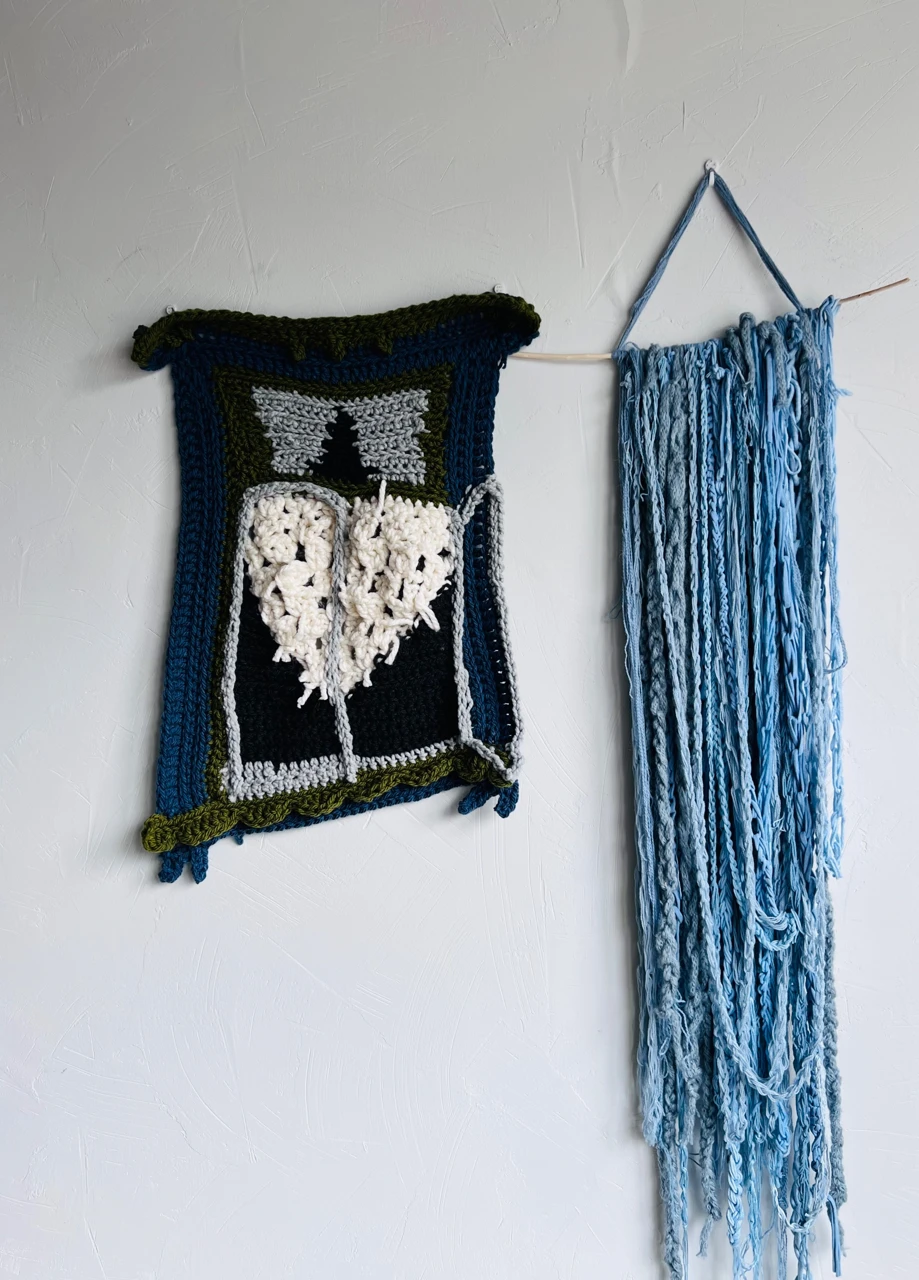 Работа из полушерсти, без твердой основы. Размещение работы возможно настенно и напольно. Оснащена вязаными петлями.