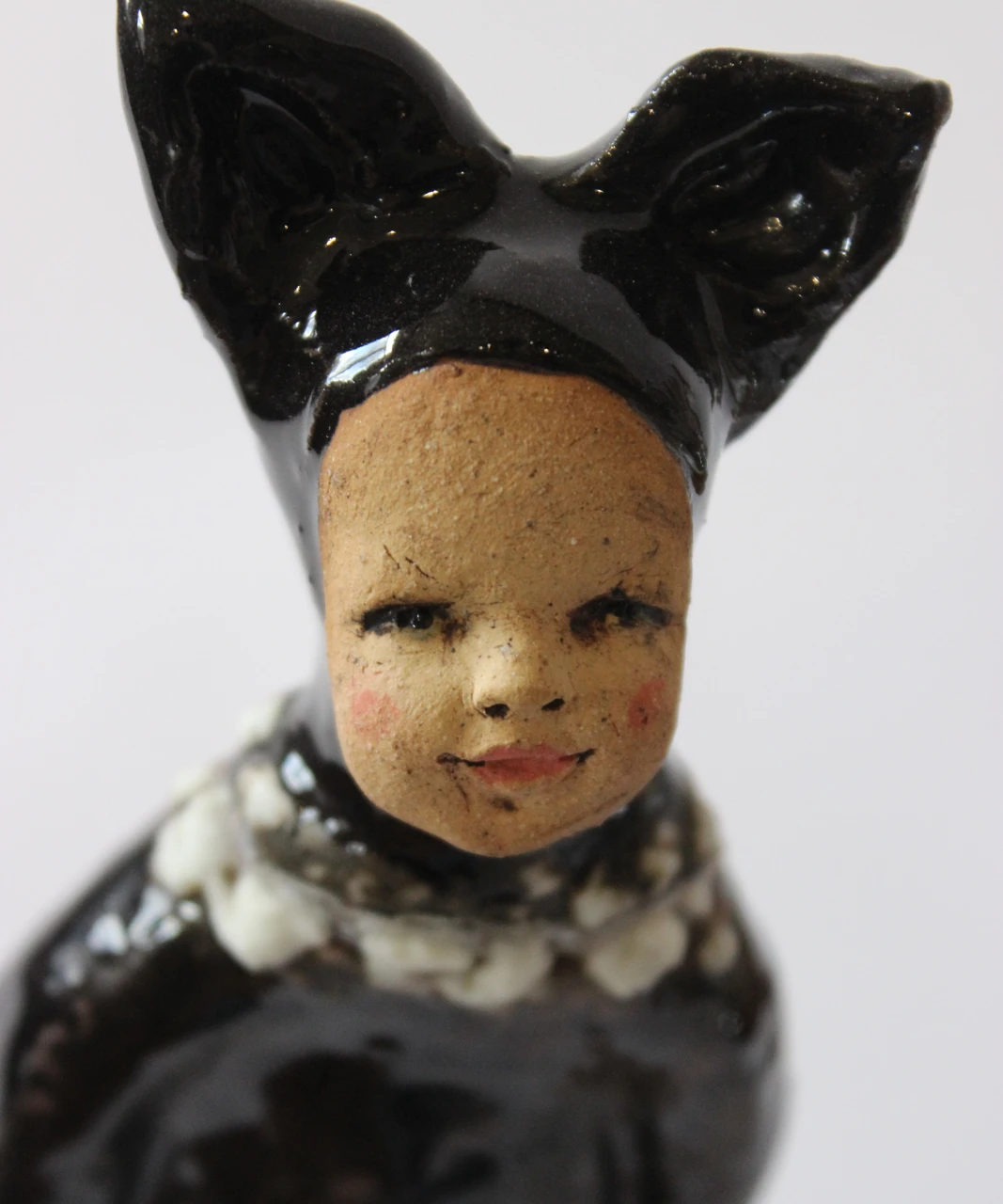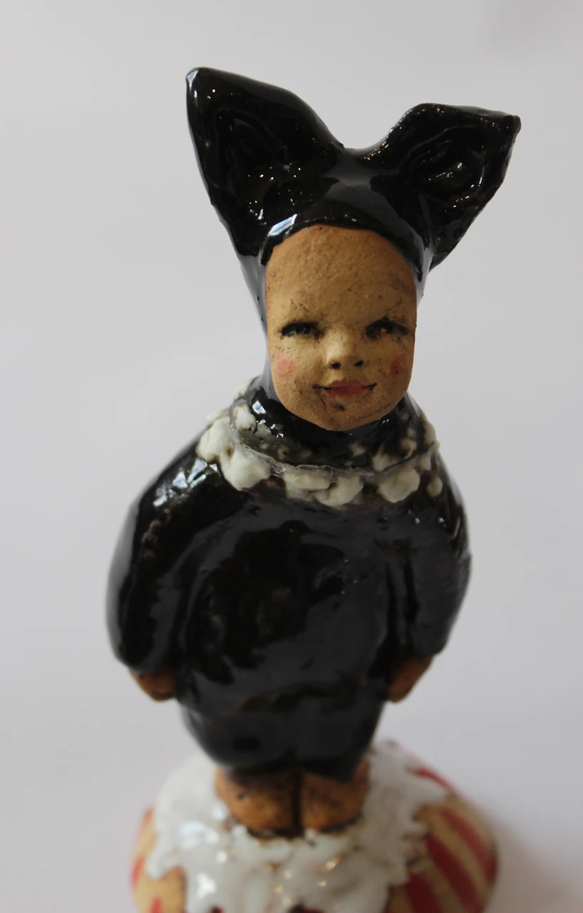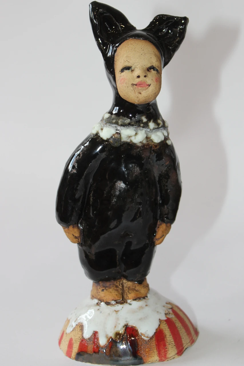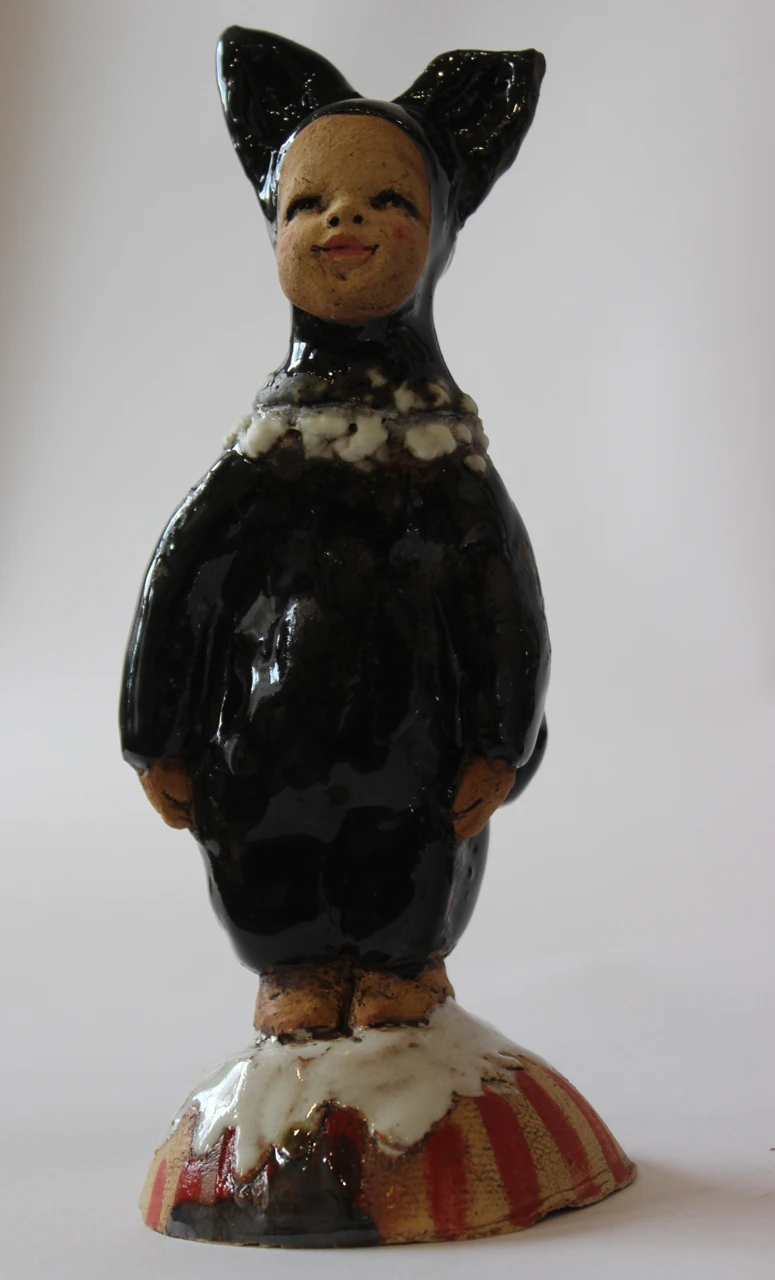 В этой работе я стремилась передать атмосферу наивности и искренности, присущей детям, которые с горящими глазами ждут праздника. Малыш, облаченный в костюм чёрного котёнка, с нежностью смотрит на мир, не думая ещё о том, кем он станет, когда вырастет. Этот момент “чистого листа” я хотела запечатлеть в своей работе. Эта скульптура приглашает зрителей поразмышлять о своих собственных детских переживаниях и напомнить о важности сохранять наивность и любопытство даже во взрослом мире.