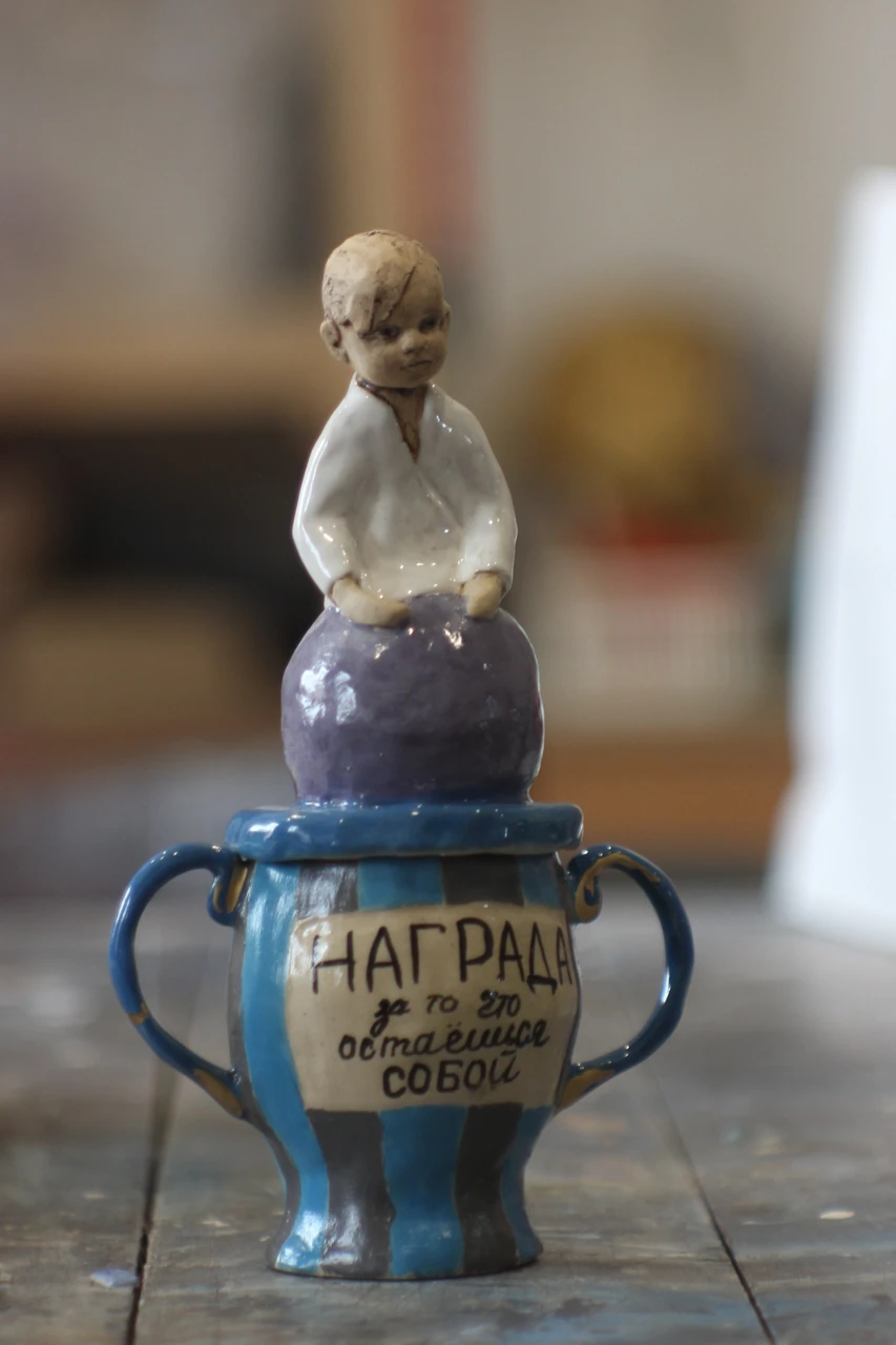 «Доска почёта» — это наградные кубки и вымпелы за заслуги, которые обычно не награждаются — за смелость, доброту, за умение мечтать и просто за то, что ты есть такая умничка на свете. Может быть, получив бы такие награды в детстве, кто-то из нас не стал бы во взрослом возрасте постоянным клиентом психотерапевта. Наградной кубок «Ты такой смелый» — это моя попытка создать пространство для размышлений о том, что значит быть ценным и значимым. Вдохновением для этой скульптуры послужила идея о том, что награды должны вручаться не только за достижения, но и за внутренние качества человека. Я надеюсь, что эта работа станет напоминанием каждому зрителю о его уникальности и важности в этом мире.
