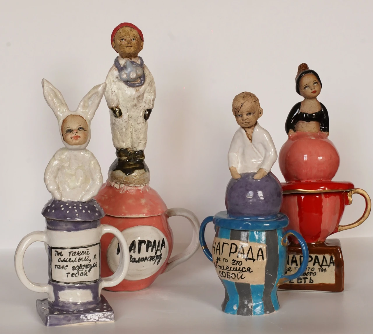 «Доска почёта» — это наградные кубки и вымпелы за заслуги, которые обычно не награждаются — за смелость, доброту, за умение мечтать и просто за то, что ты есть такая умничка на свете. Может быть, получив бы такие награды в детстве, кто-то из нас не стал бы во взрослом возрасте постоянным клиентом психотерапевта. Наградной кубок «Награда за то, что ты просто есть» — это моя попытка создать пространство для размышлений о том, что значит быть ценным и значимым. Вдохновением для этой скульптуры послужила идея о том, что награды должны вручаться не только за достижения, но и за внутренние качества человека.