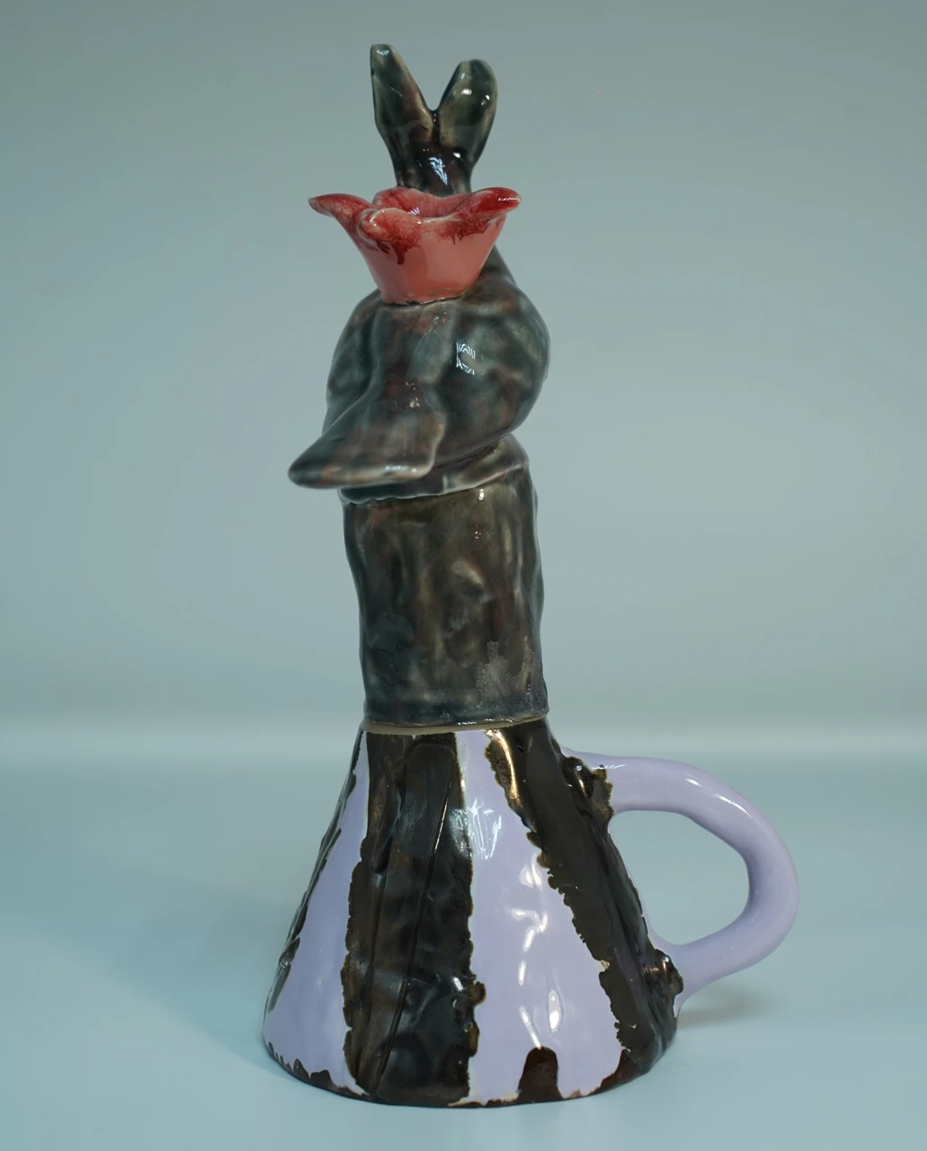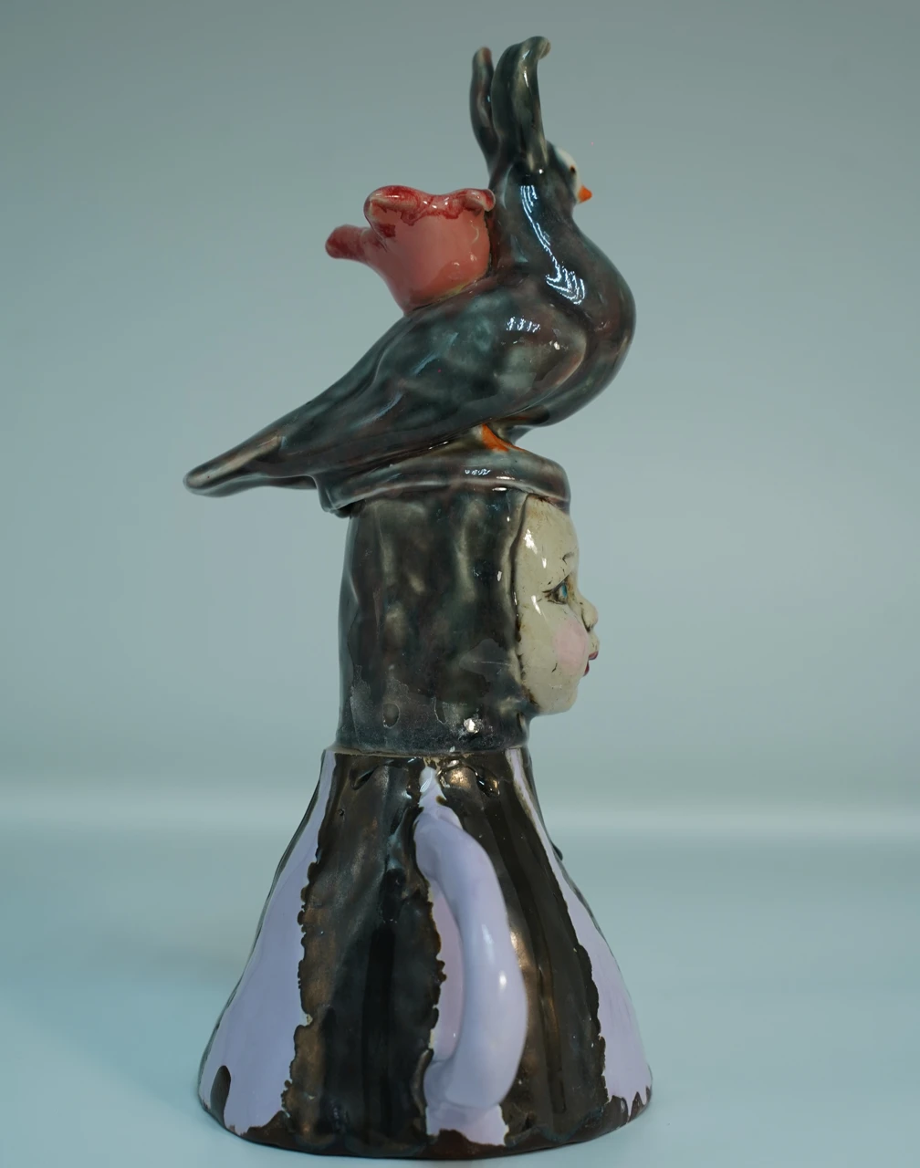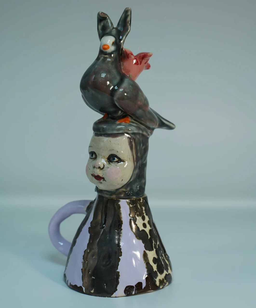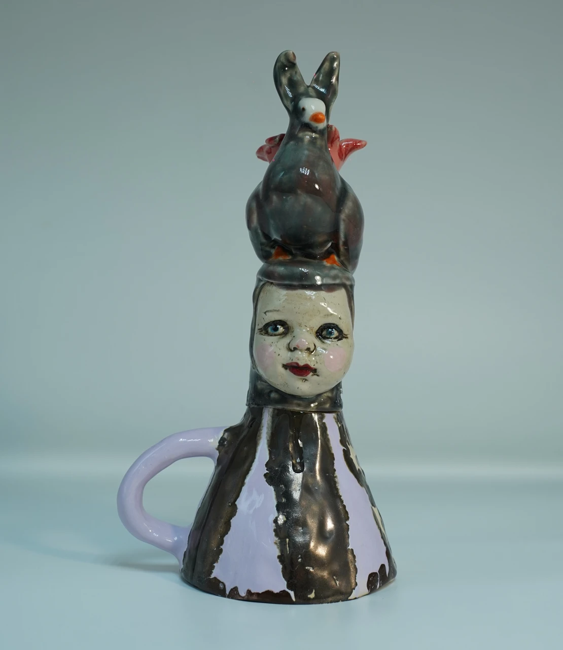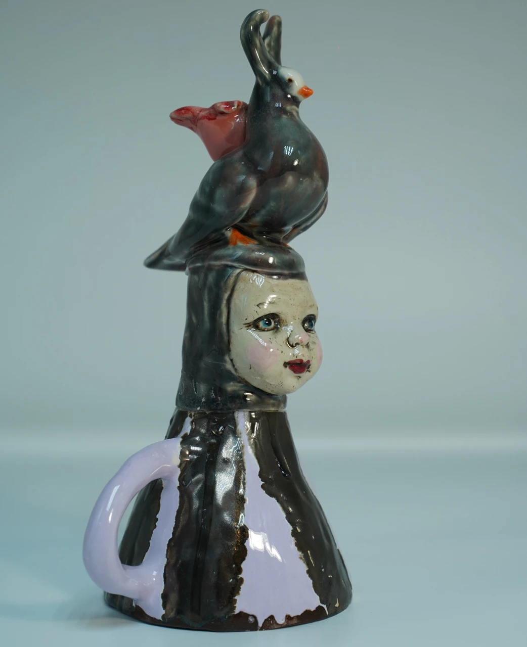 Работа «Перевёртыш» — это визуальная басня, выстроенная по законам хрупкого равновесия и тотальной ручной работы. Каждый её элемент — перевёрнутая чашка, голова куклы, гибридное существо — был слеплен отдельно, а затем соединён в иерархическую пирамиду, бросающую вызов логике. Голубь-заяц — не случайная причуда, а сознательное создание тотемного существа для личного мифа. Он олицетворяет синтез противоположных качеств: полёта и затаённости, мира и тревоги.
