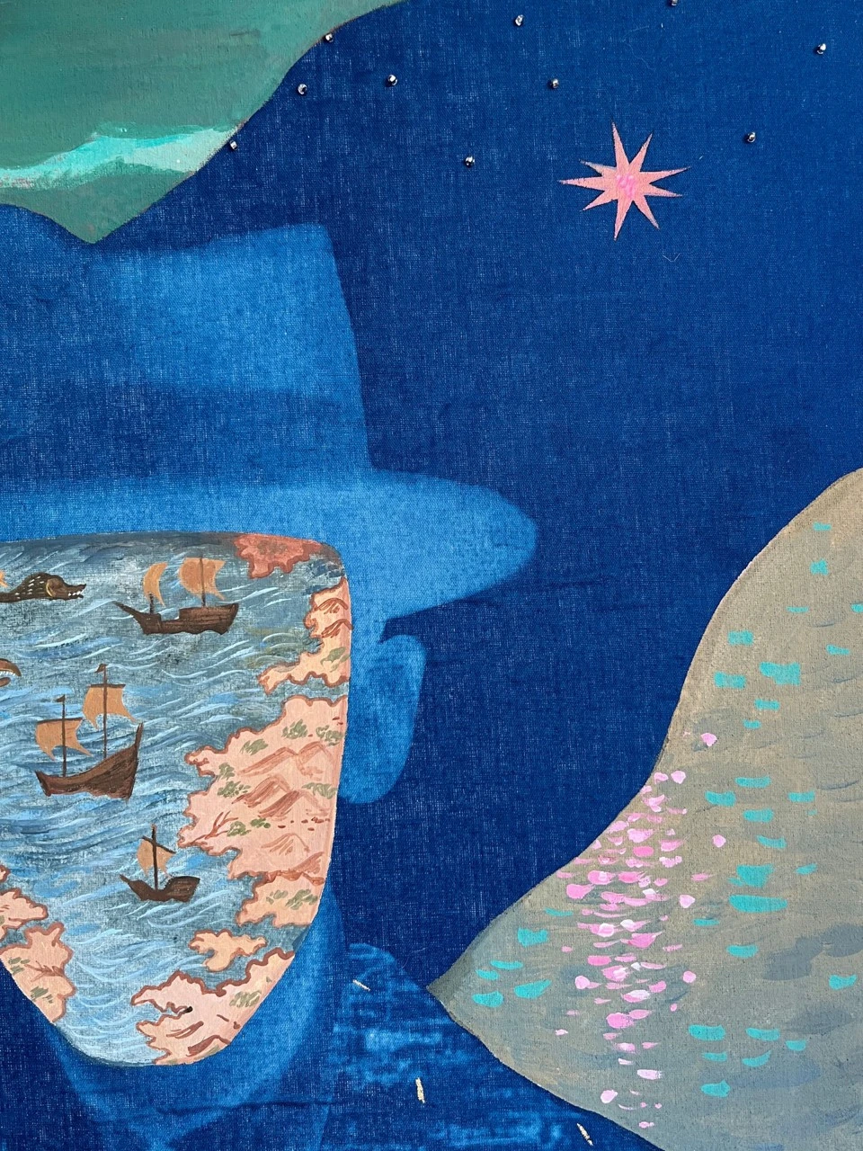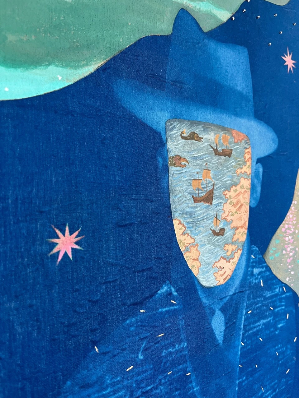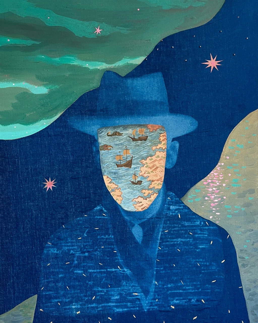 На картине изображен портрет человека, внутри лица которого мы видим карту. Наше лицо, как карта, запечатлевает пройденный маршрут, со всеми переживаниями, воспоминаниями и эмоциями, которые сформировали нашу психику. Внутри каждого из нас есть как «страшные зоны», которые представляют собой области душевных травм или тяжелых воспоминаний, о которых человек предпочел бы не вспоминать. Эти зоны кажутся заблокированными, словно окружены непроходимыми барьерами, демонстрируя, как наше подсознание защищает нас от боли и страха. А также внутри нас есть проторенные дорожки — знакомые пути и маршруты, которые человек проходит снова и снова. Эти тропинки символизируют привычные модели поведения и реакции, укоренившиеся в его жизни, намеченные на этом внутреннем плане. Картина подчеркивает, что каждый из нас носит в себе сложный и многослойный ландшафт, включающий как светлые, так и темные стороны. Она приглашает зрителя задуматься о глубинах своей психики, о том, что, как и у этого человека, внутри каждого из нас есть карта, полная неизведанных и потерянных частей, а также извивающихся троп, которые ведут к пониманию и самопринятию.