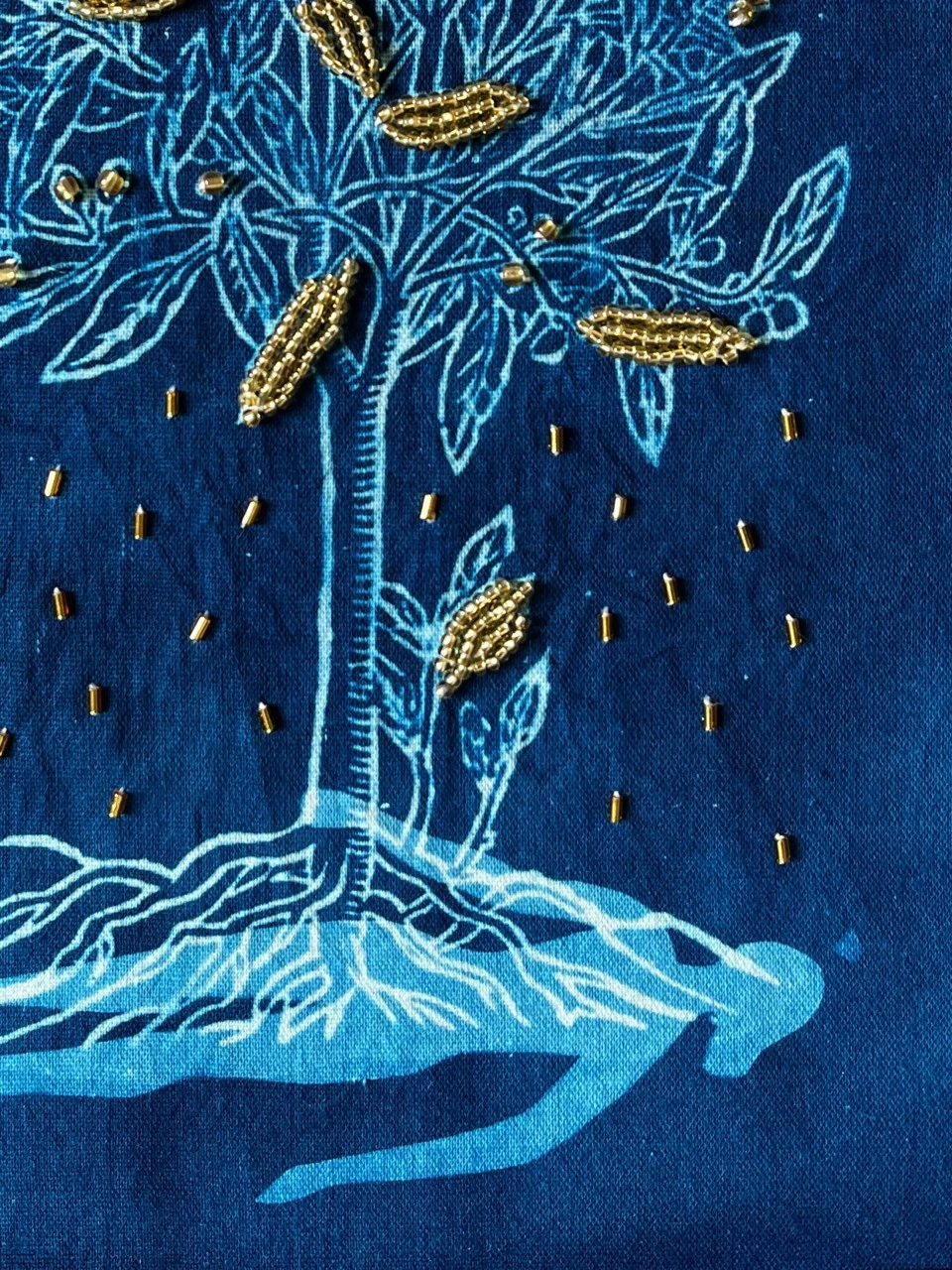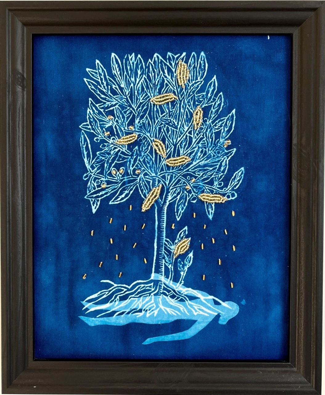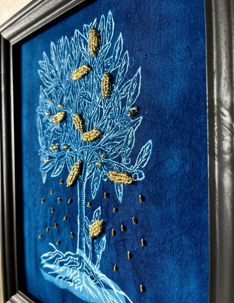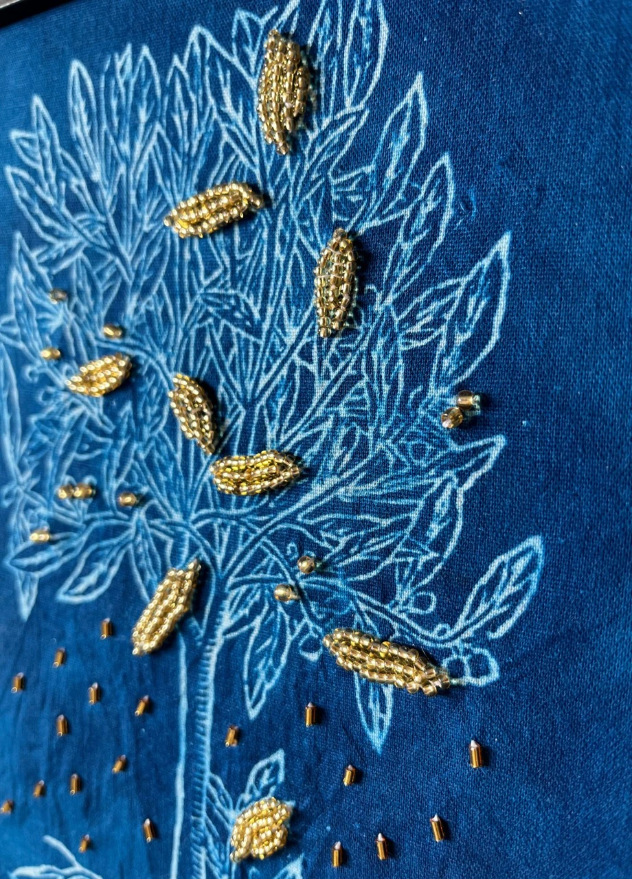 Это цианотипия с вышивкой из серии работ о чуде и красоте жизни, о том, насколько жизнь хрупка и уязвима, о её нежности и о том, как хочется её беречь и ценить, о том, что «мы висим над бездной на тонкой ниточке, которую держит Бог». Золотой стеклярус мерцает на тёмном фоне, напоминая звёздное небо, создавая ощущение тайны и предвкушения разгадки непостижимых проявлений жизни: таинства зачатия, природы вдохновения, рождения нового опыта из страдания, одухотворения материи.