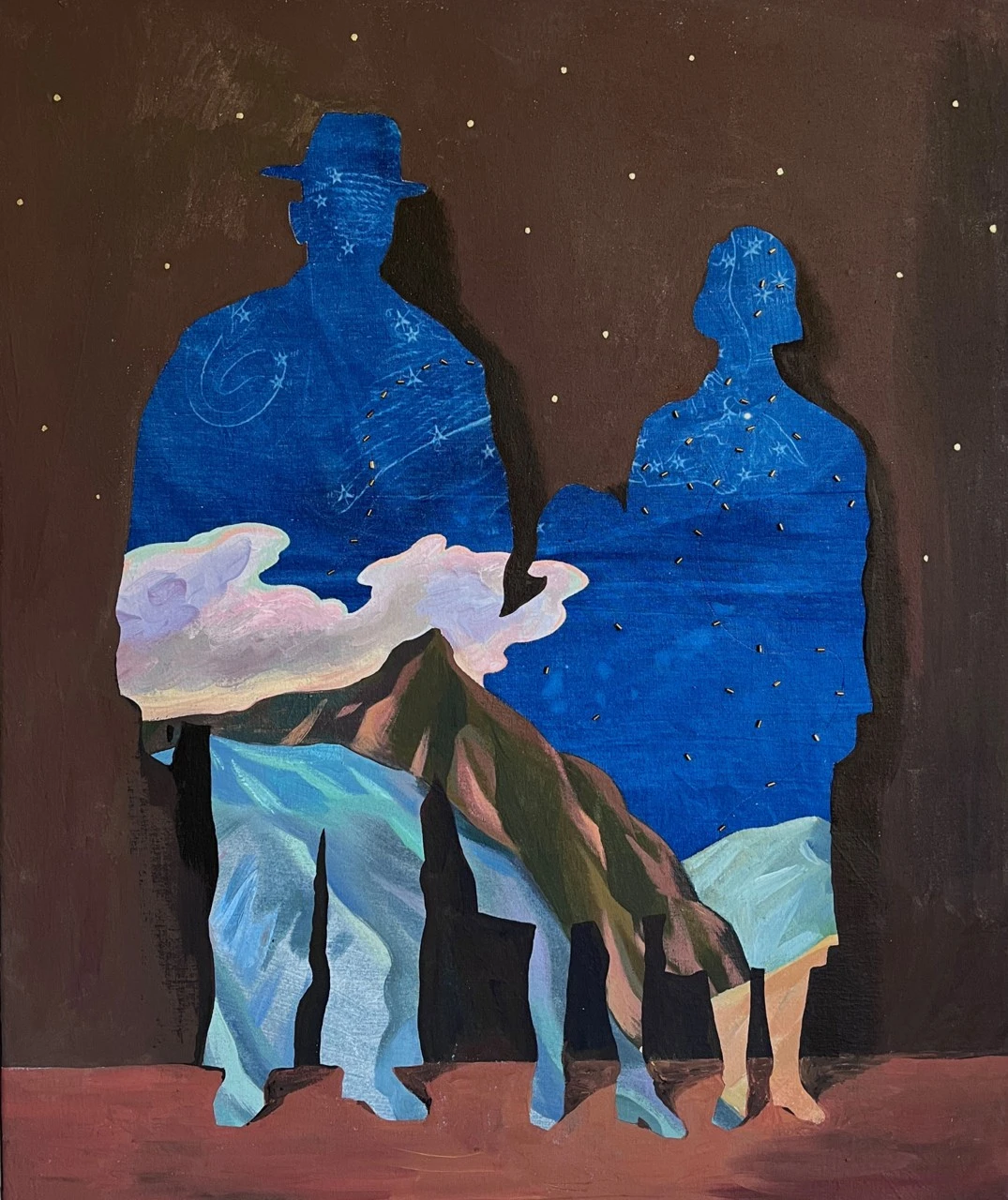 На картине изображен силуэт семьи, внутри которого раскрывается пейзаж: горы под звездным небом. Так, каждая семья имеет свой уникальный пейзаж — у кого-то это величественное спокойное море, у кого-то бурный шторм , а может -тихий лес. Каждая семья имеет свой собственный, неповторимый мир, который резонирует с их историей и опытом. Горы могут символизировать преодоление трудностей, море — умиротворение и гармонию, шторм — испытания и вызовы, а лес — спокойствие. Эта картина приглашает зрителя задуматься о том, что объединяет людей, подчеркивая, что каждый пейзаж уникален и отражает индивидуальность той связи, которая существует между ними.