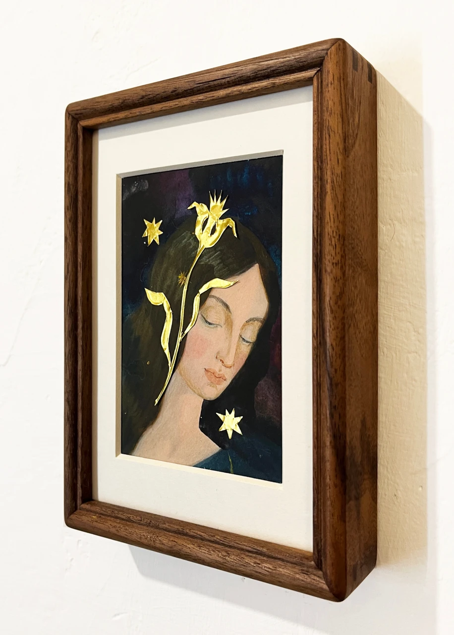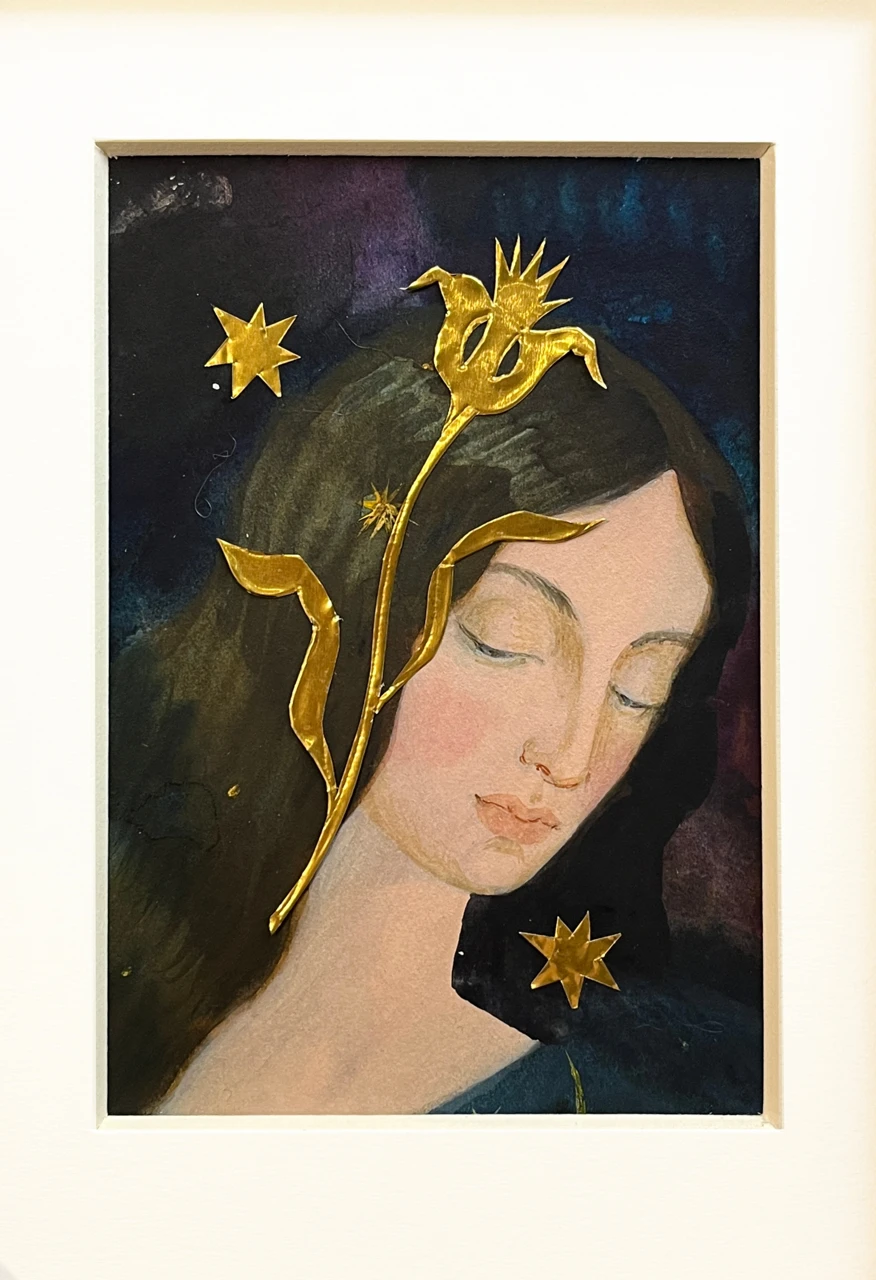 На картине мы видим девушку, в чьих волосах находится золотой цветок, своими формами и плавными линиями символизирующий нежность и изящество женщины. Рядом рассеяны сияющие звёзды, создавая магическую и таинственную атмосферу. Мои работы зачастую — это ода Женственности с её нежностью и силой, гармонией и загадкой, красотой и таинственностью.