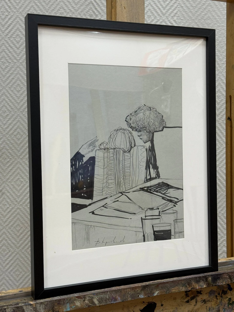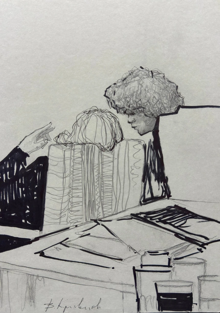 Это графичный набросок, выполненный в лаконичной, экспрессивной манере. На рисунке запечатлён фрагмент сцены в интерьере бара — изображены два человека, сидящие за столом.