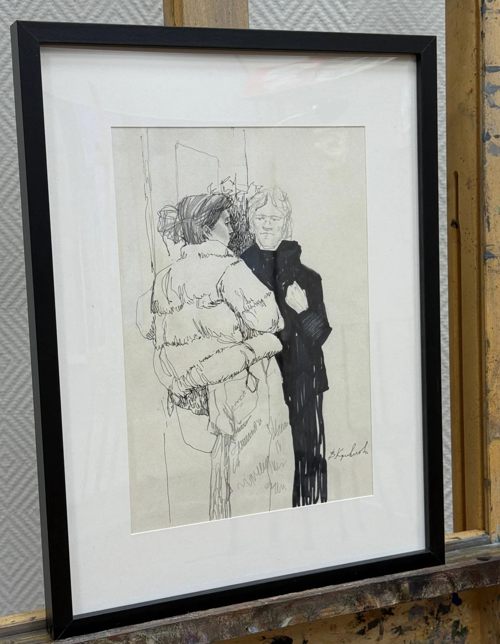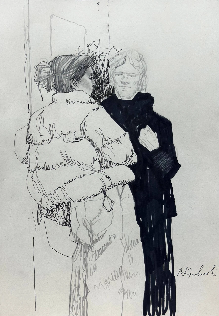Это графическая зарисовка, выполненная в экспрессивной, лаконичной манере. Композиция представляет собой сцену с двумя людьми, стоящими близко друг к другу, в общественном месте.