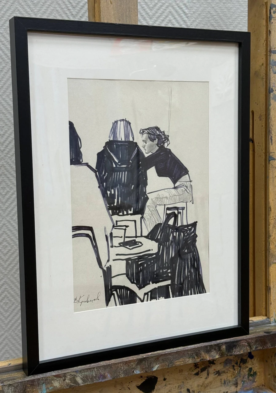 Перед нами графическая зарисовка. Композиция передаёт фрагмент повседневной жизни — сцену с тремя людьми, сидящими за столом. Работа отличается экспрессивной, немного небрежной манерой письма, которая придаёт ей живость и динамику.