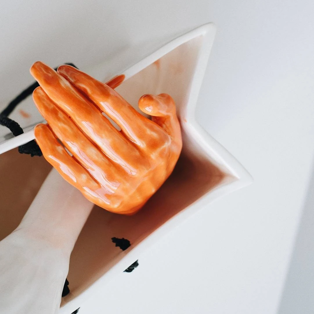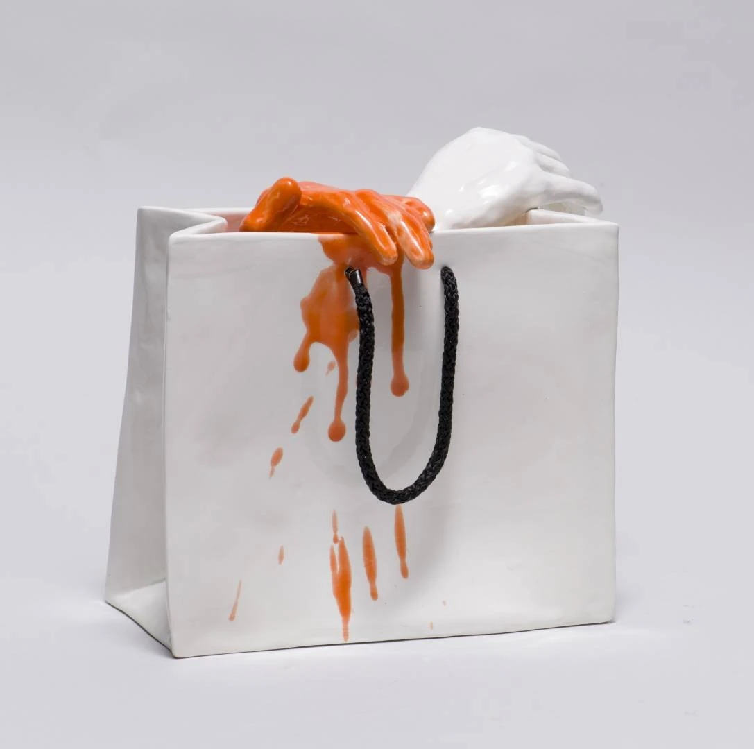 Я решила не привязываться в работе к конкретным брендам, но при этом хотела вызвать ассоциативный ряд с миром моды. Я выбрала яркий оранжевый цвет, который отсылает к фирменному пакету ЦУМ. Необъяснимый ажиотаж вокруг этих пакетов вызывает много вопросов.