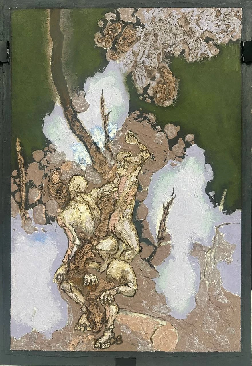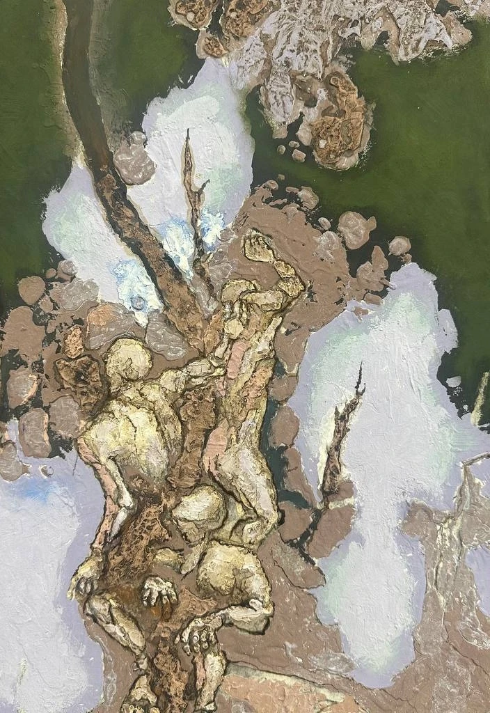 Работа «Мы уходим» — это авторская живопись на бумаге, выполненная акрилом на оргалите. Композиция изображает группу фигур, сплетенных в динамичном, но напряженном взаимодействии. Палитра работы построена на контрасте землистых, коричневых и бежевых тонов с участками приглушенного зеленого и сиреневого, создавая ощущение тревоги и неопределенности. Текстура материала подчеркивает осязаемость форм, придавая им объем и вес. Фигуры, словно борющиеся или поддерживающие друг друга, передают ощущение движения и ухода, что соответствует названию произведения.
