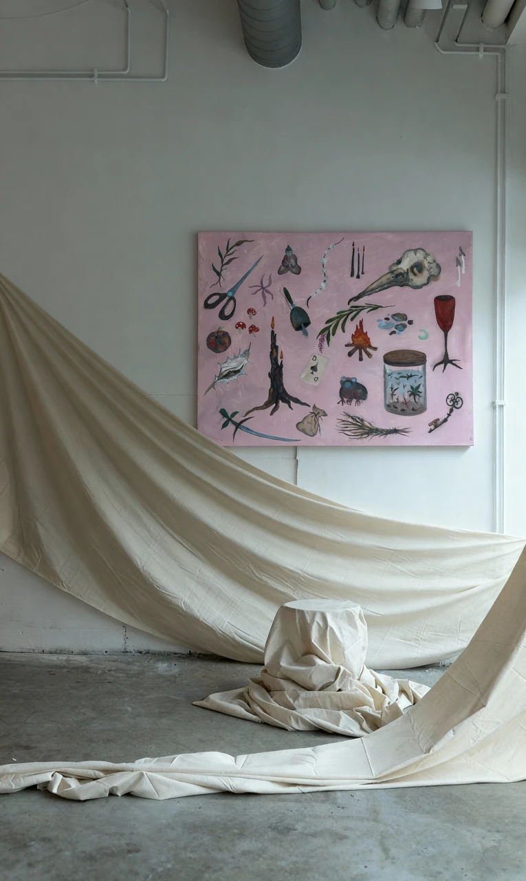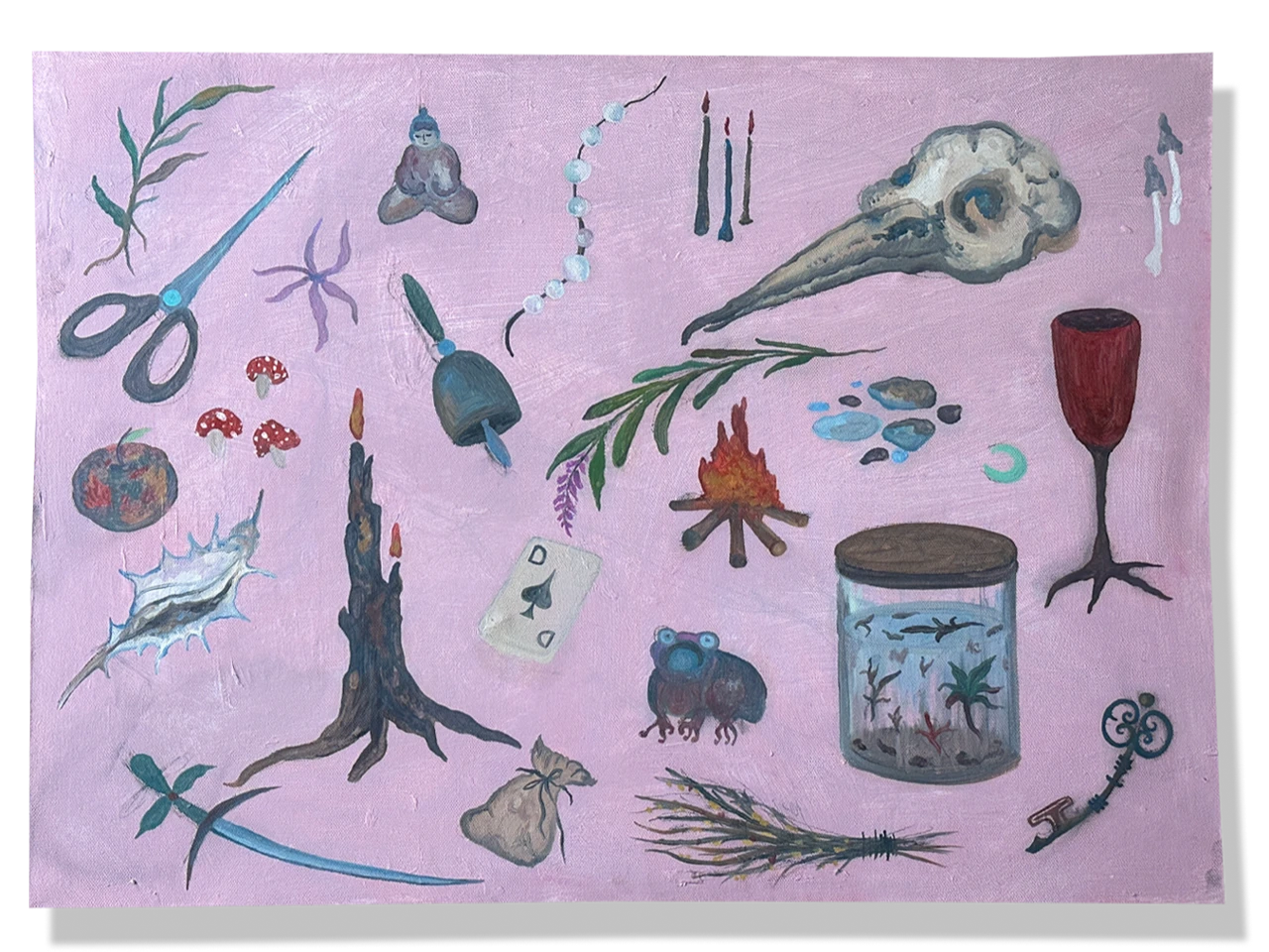 Собирая ритуальные предметы воедино, расставляя их и награждая значением и действованием — я задумалась: «Что располагается на алтаре у других людей? Можем ли мы наделить любой предмет магическим свойством? Как рациональность вплетается в мир объектов и вытаскивает их оттуда с помощью магии?». Работа об атрибутах, помогающих в сонастройке и чувствовании при проведении ритуального события, будь то медитация, диалог с собой внутри, колдование или настраивание на новые цели.