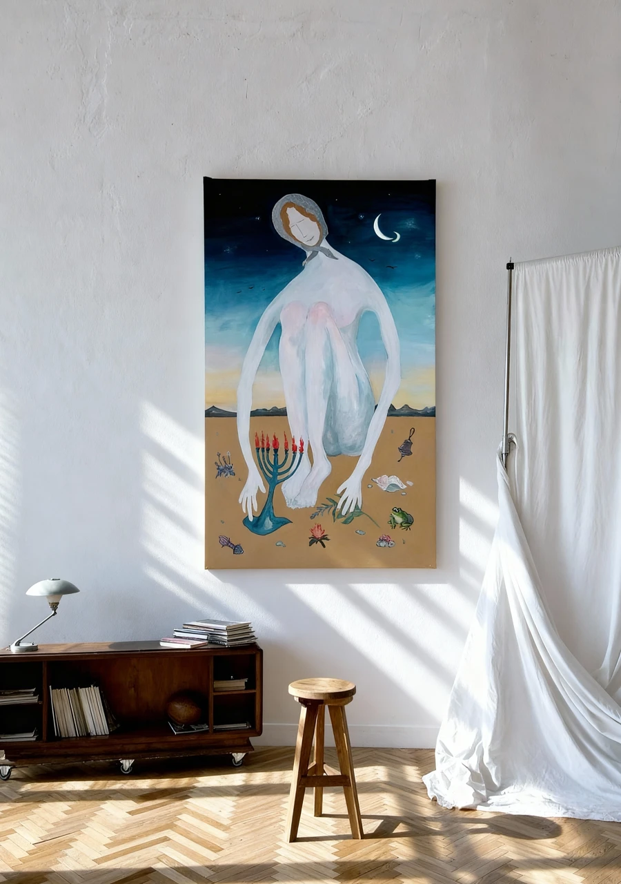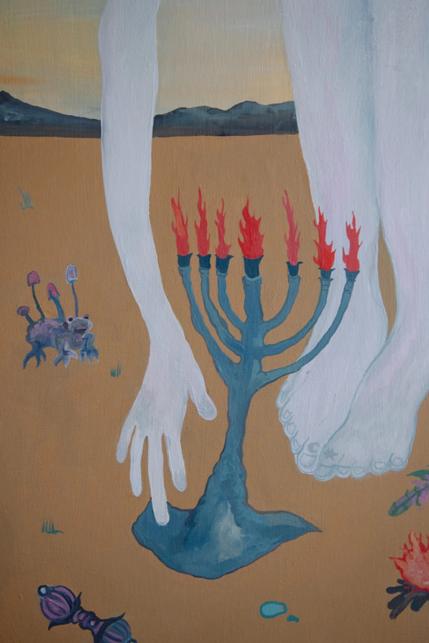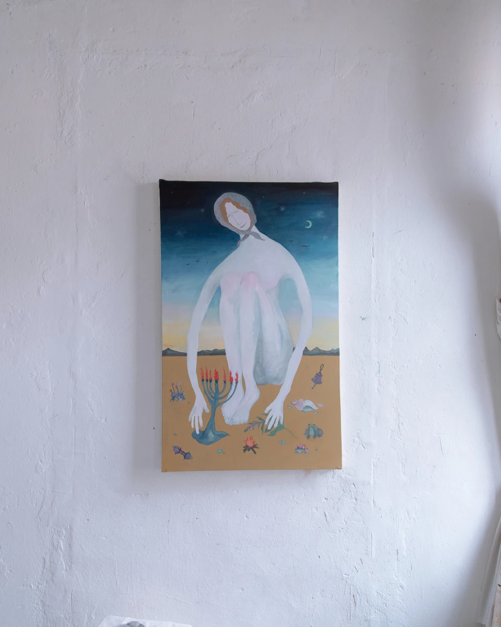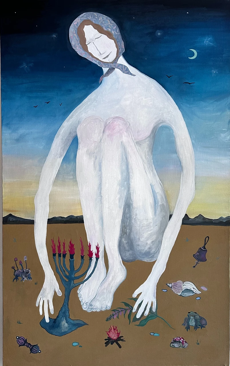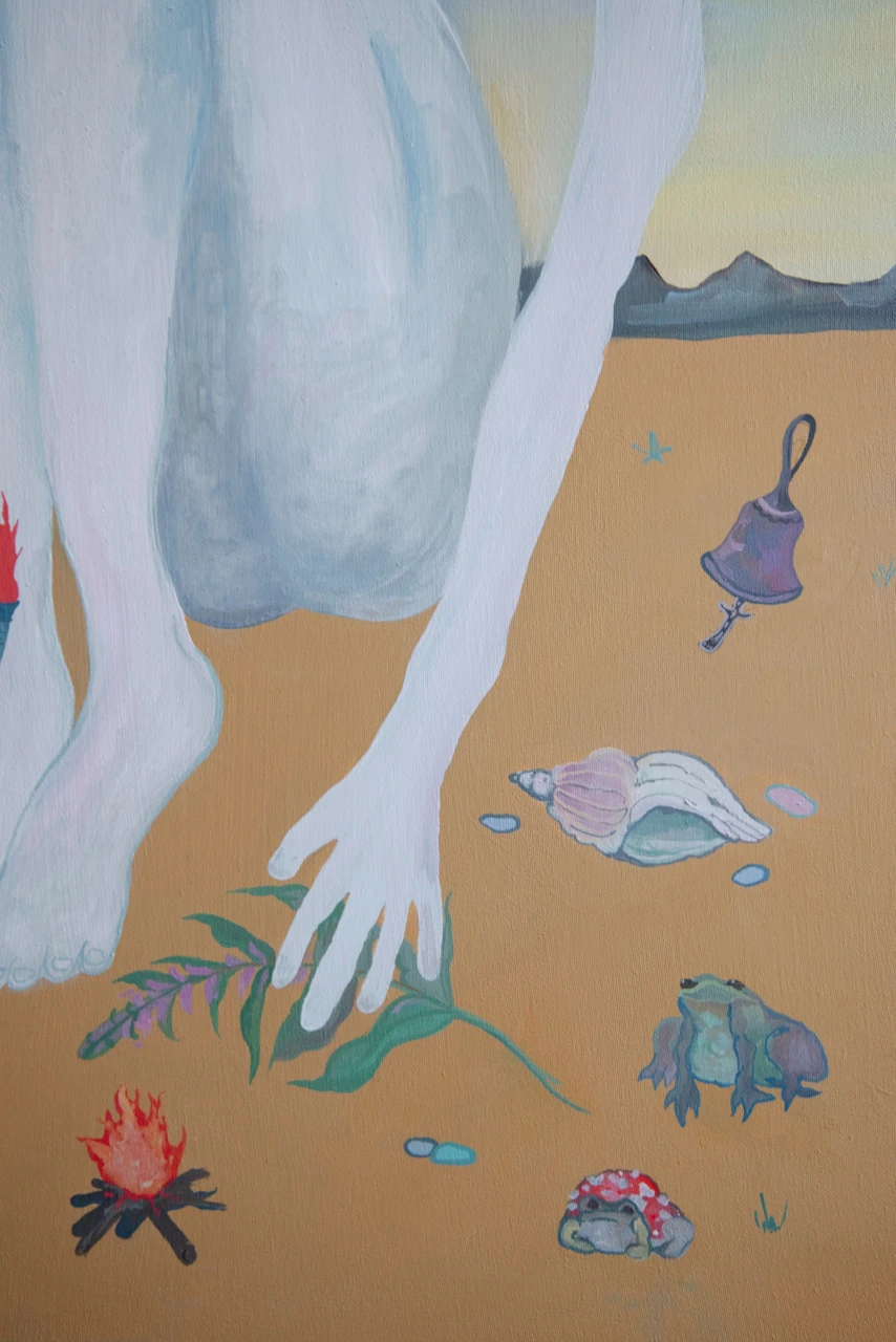 Предрассветное время касается едва заметным светом картины, разбросанные ритуальные предметы на холсте символизируют колдовство, но она, сидящая у обрыва реки играет, всего лишь детская игра, сопровождающая ее везде, как игрушки разбежавшиеся в разных направлениях.
