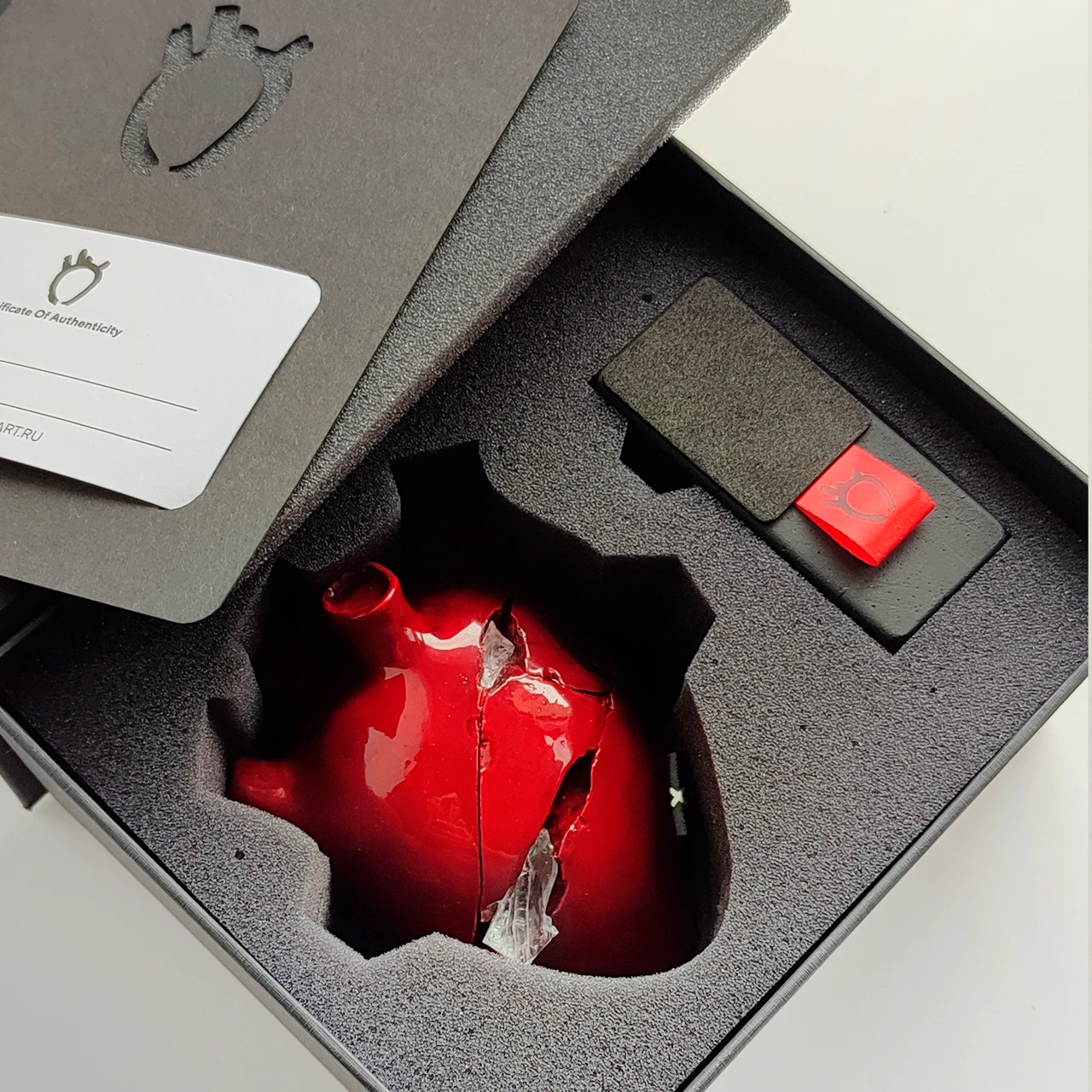 Сердце упаковано в фирменную подарочную коробочку с подставкой, имеет встроенный магнит для постановки в вертикальном положении на подставку.