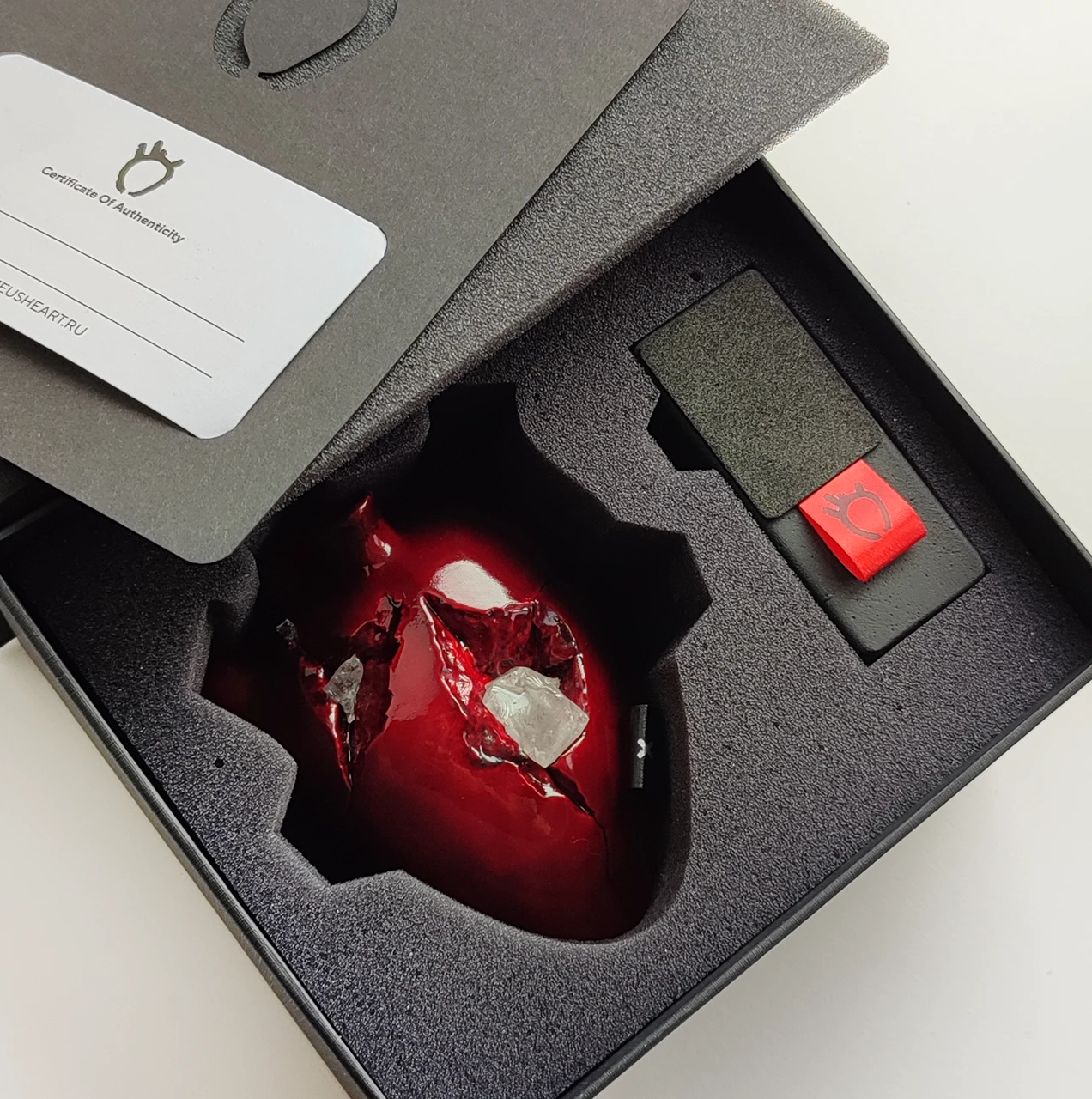 Сердце упаковано в фирменную подарочную коробочку с подставкой, имеет встроенный магнит для постановки в вертикальном положении на подставку.