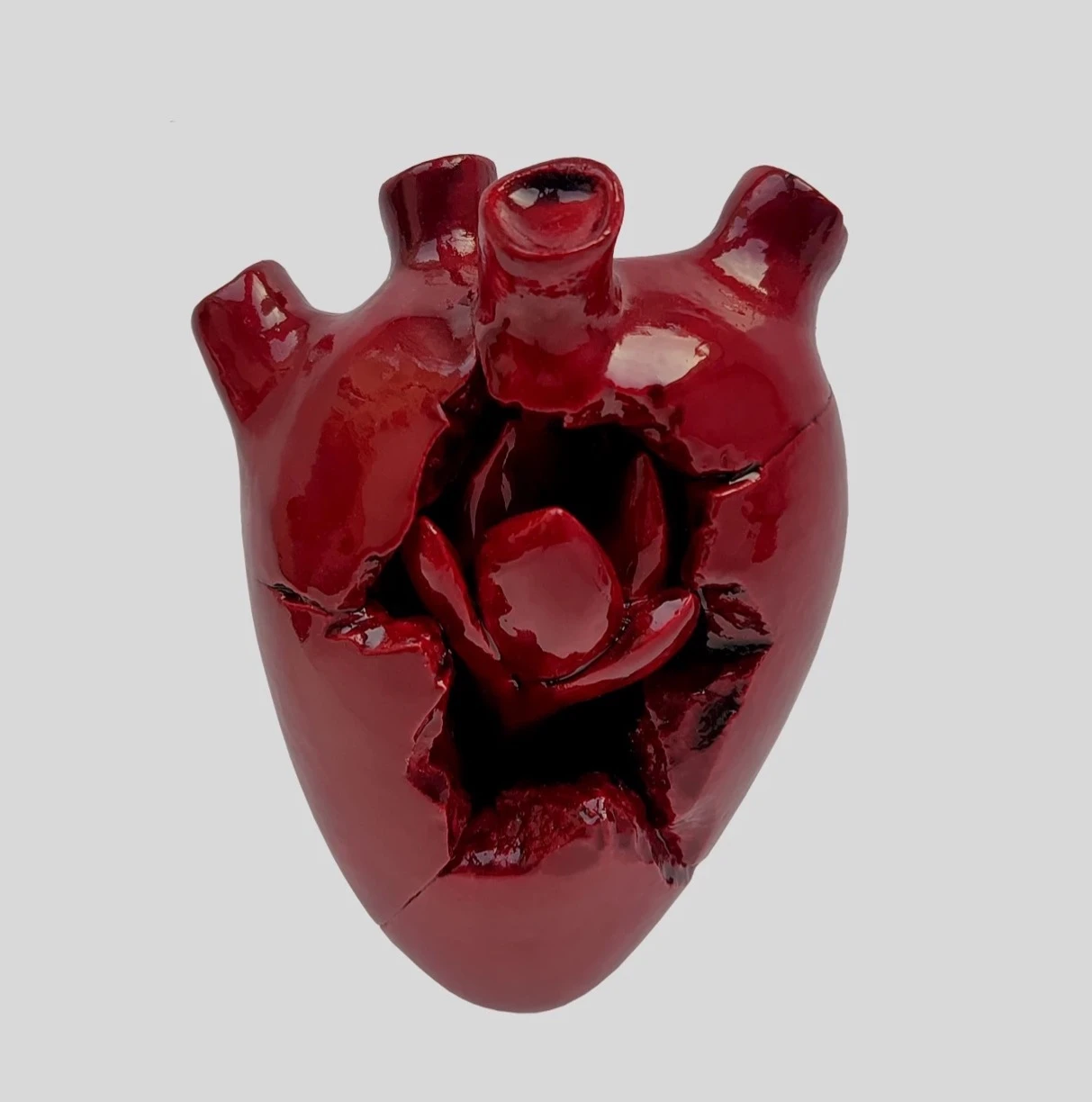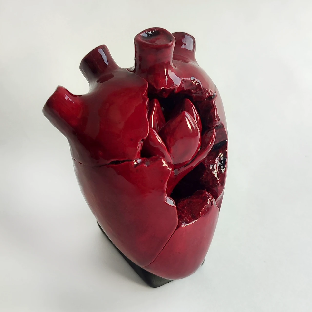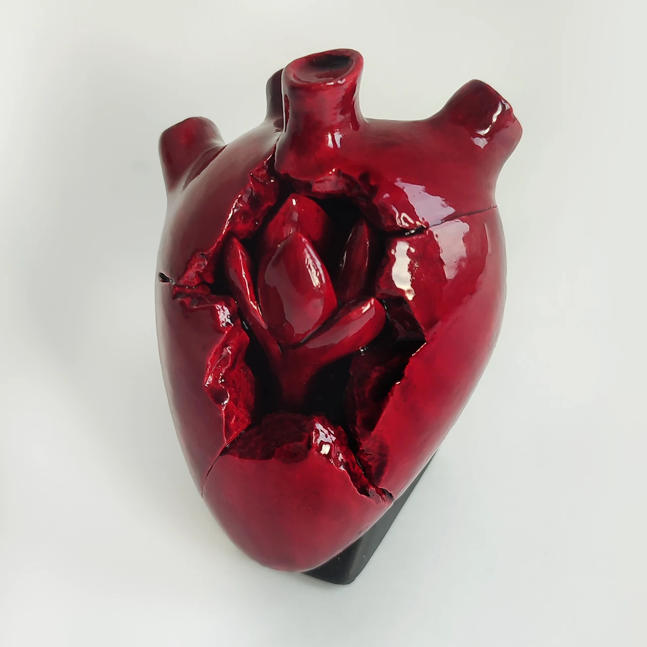 Арт-объект выполнен из гипсобетона, окрашен сольвентными эмалями, имеет основание из коры пробкового дерева. Сердце упаковано в бетонную коробку в единственном экземпляре, идет в комплекте с подставкой, имеет встроенный магнит для постановки сердца в вертикальном положении.