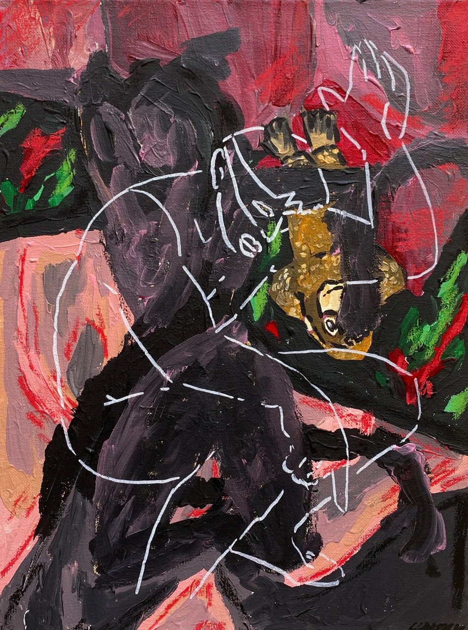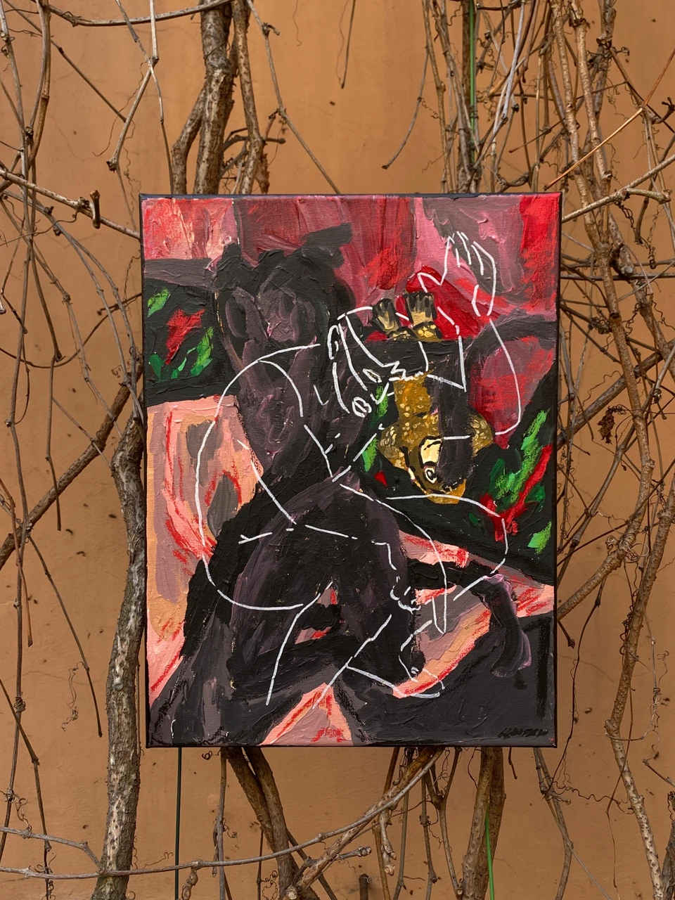 Работа «Франс и обезьянка» — это авторская живописная композиция, где центральным элементом является стилизованное изображение обезьянки, выполненное в золотистых и коричневых тонах, с выразительными черными глазами. Колорит работы строится на контрасте глубокого черного, насыщенного красного и нежных розовых оттенков, дополненных зелеными вкраплениями, создавая динамичное и эмоциональное пространство. Текстура мазков акрила придает изображению объем и тактильность.