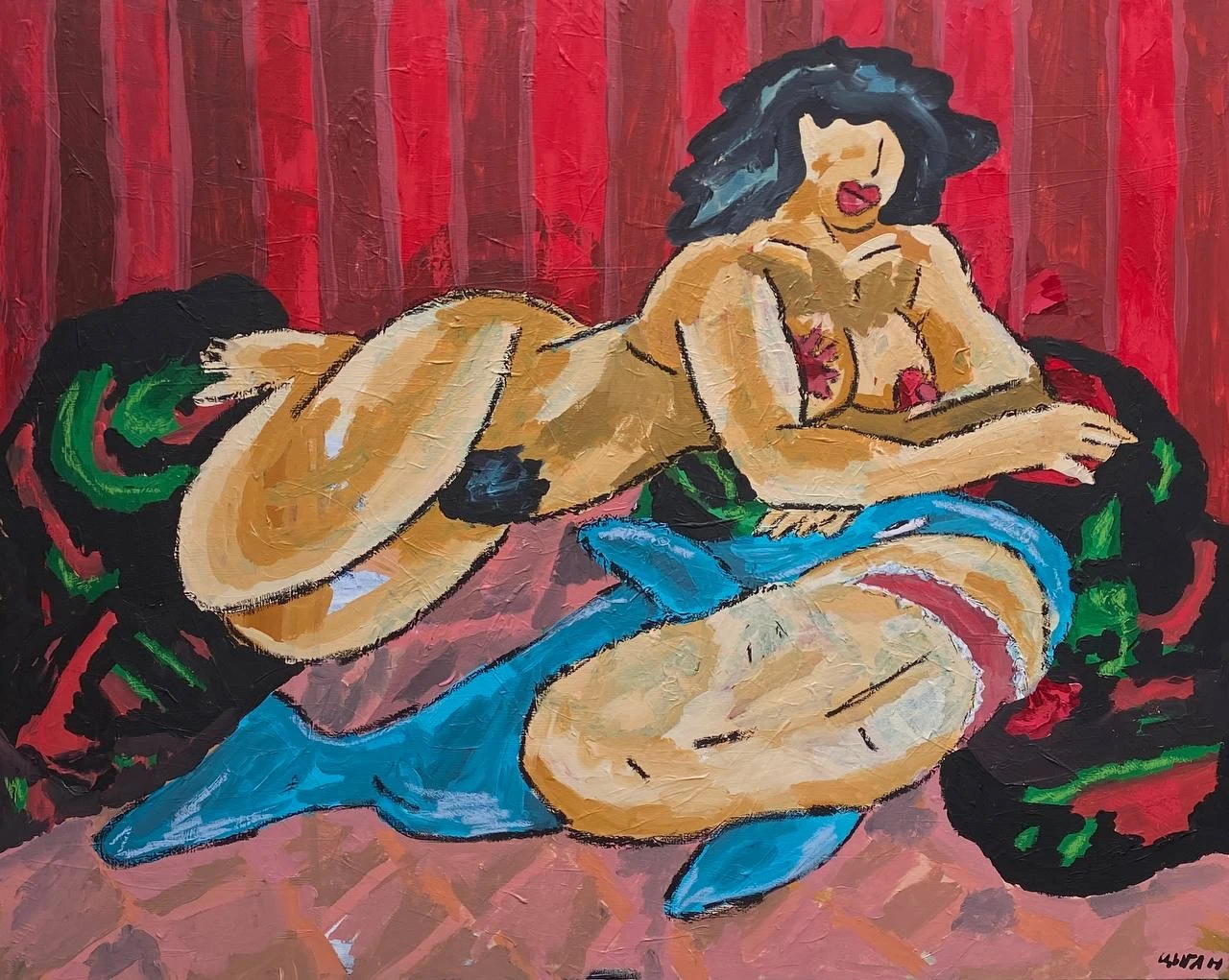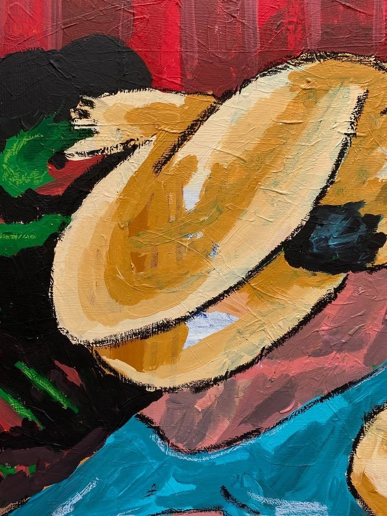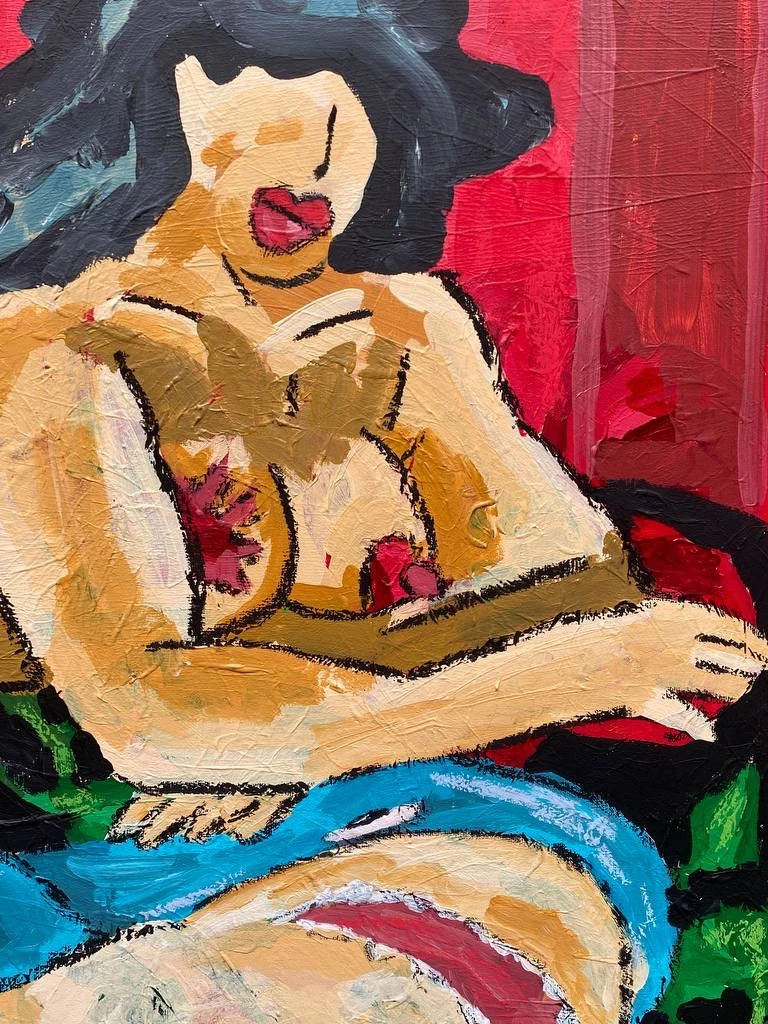 Яркая, насыщенная палитра с преобладанием красных, золотистых и синих оттенков создает выразительный визуальный ряд. Грубые, экспрессивные мазки кисти и пастели придают работе особую текстуру и динамику, подчеркивая фигуративность изображения. Это смелое сочетание реалистичных элементов с элементами стилизации изображения женского тела и акулы выполнено придает работе характерный для современного искусства, смелый, вид.