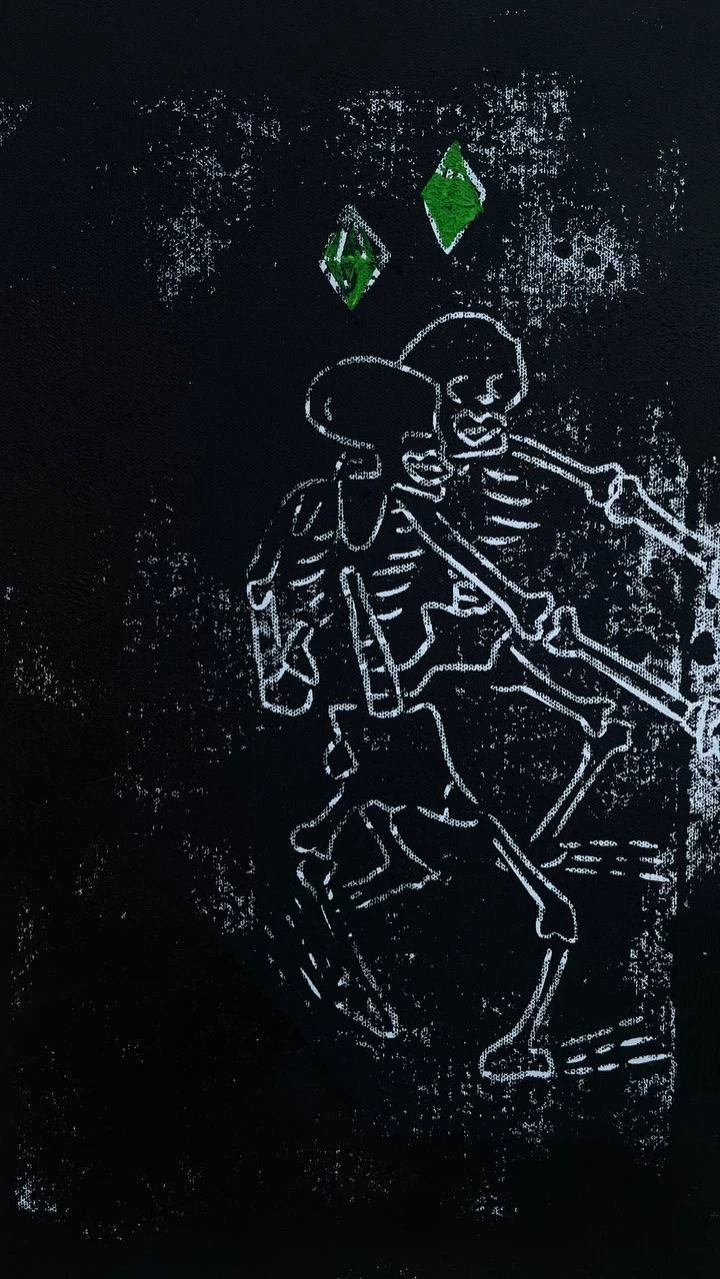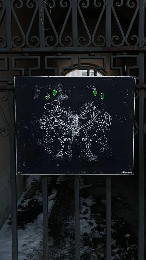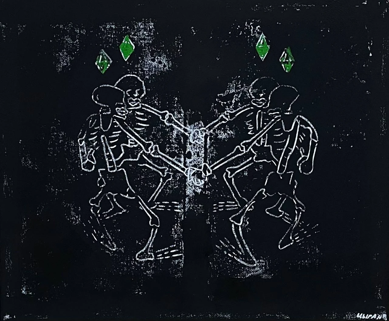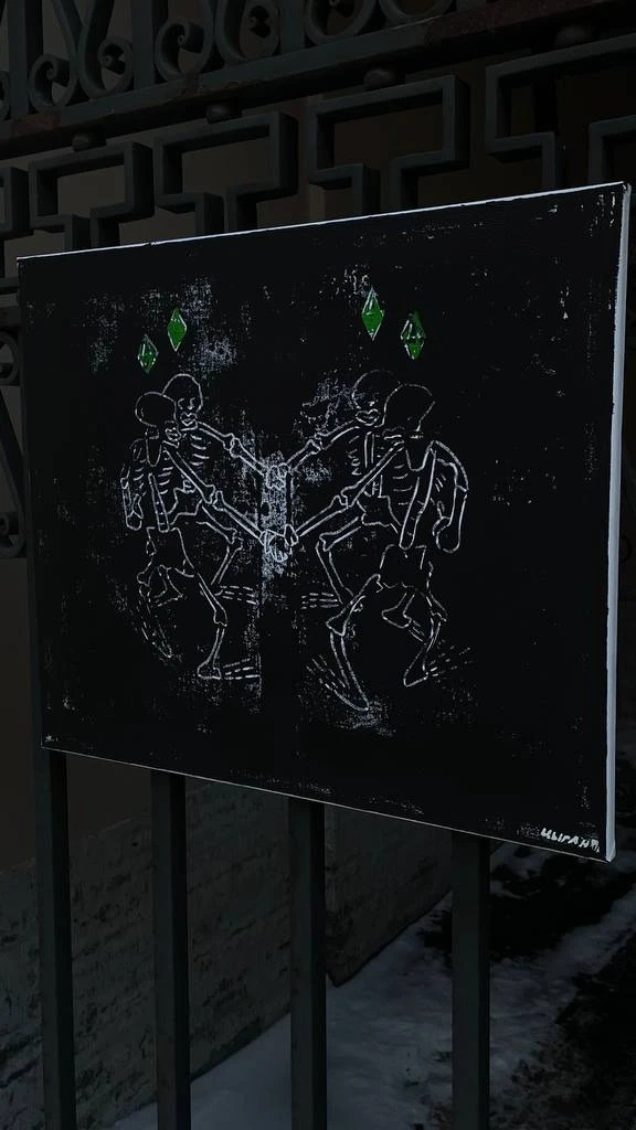 Эта работа о дружбе, которая не заканчивается со смертью. Даже когда тела исчезают, связь остаётся. Четыре скелета продолжают движение, похожее на танец. Они взаимодействуют спокойно и естественно, как будто это привычный жест, который не требует объяснений. Зелёные ромбики над головами — отсылка к The Sims. Обычно они обозначают активного персонажа, здесь же становятся знаком личности и характера, которые сохраняются за пределами физической формы. В композиции есть отсылка к «Танцу» Матисса. Повторяющееся движение и ритм создают ощущение цикла и непрерывности. Работа говорит прямо и без украшений. Дружба может продолжаться даже после смерти.