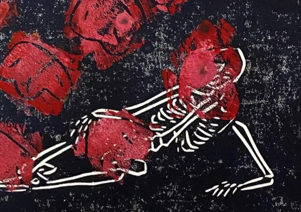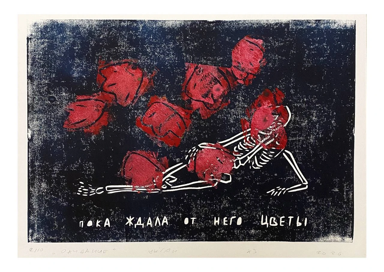 Эта работа о женщине, которая немного переборщила с ожиданием. Она ждала внимания, отношений, цветов — и дождалась только времени. Поэтому фигура здесь уже скелет: ожидание затянулось. Цветок внизу аккуратно прикрывает интимную зону — всё то, что всё время откладывалось «на потом». Цветок на лице — про желание наконец почувствовать запах цветов, но момент, кажется, снова не самый удачный. Работа фиксирует простую мысль: если ждать слишком долго, можно дождаться чего угодно — кроме того, ради чего всё начиналось.