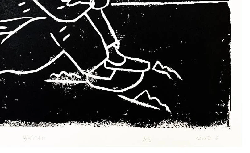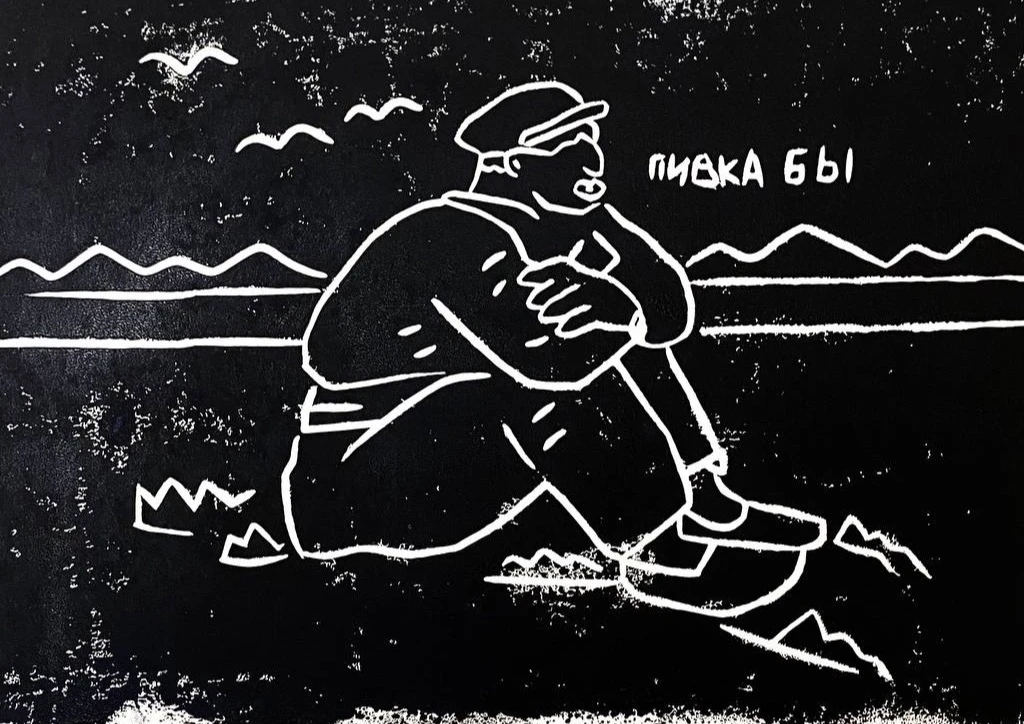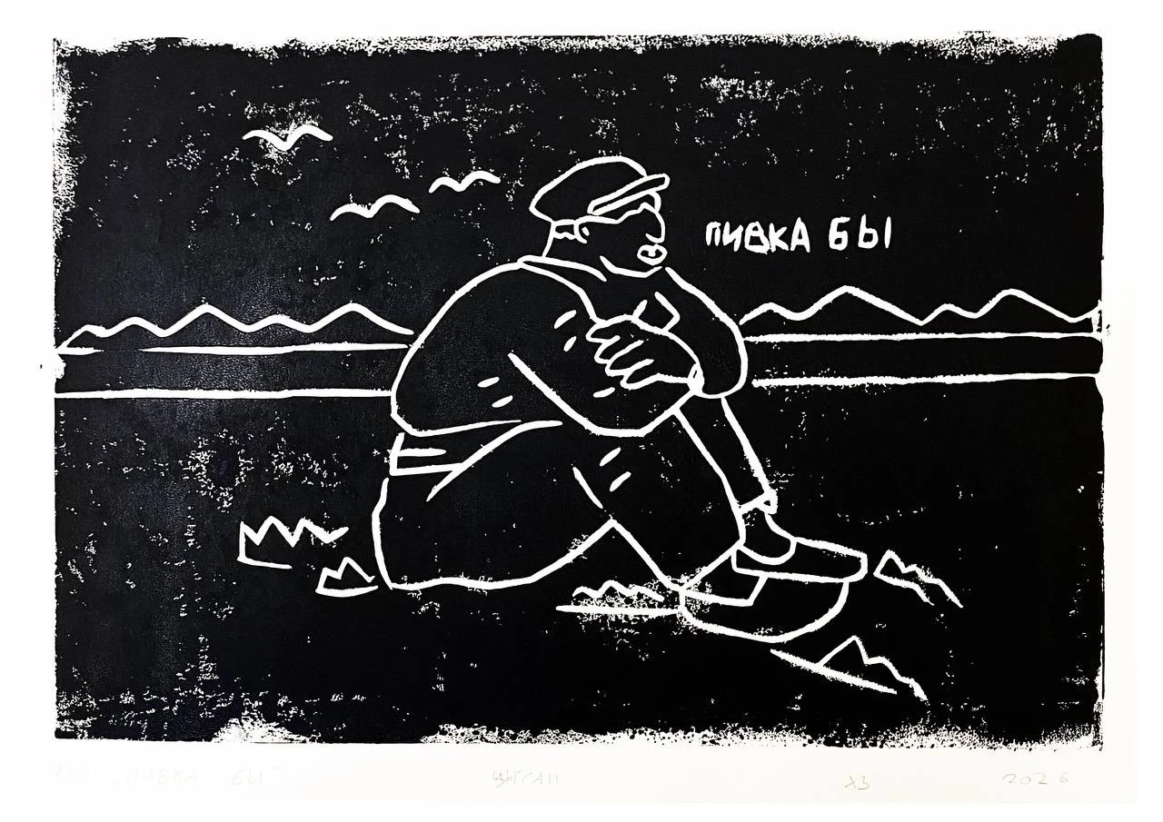 В представленной графике героем выступает задумчивый человек, сидящий на берегу воды. Сама работа являет ироничный характер, при этом изображенный пейзаж в ней намечен упрощенными волнистыми линиями, символизирующими водную гладь и берег, вызывающие чувства меланхолии и умиротворения.