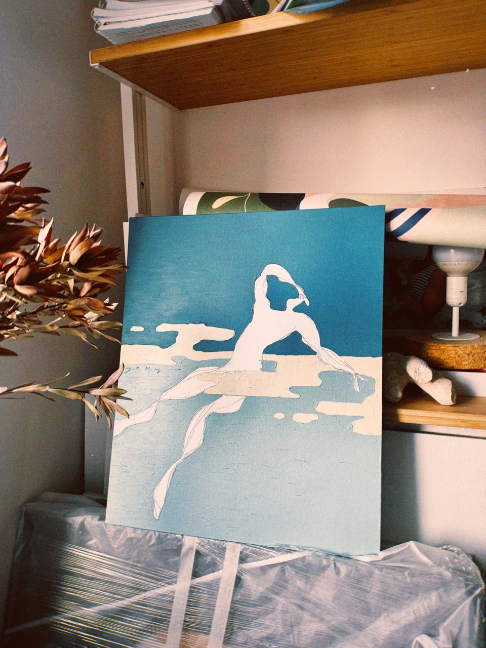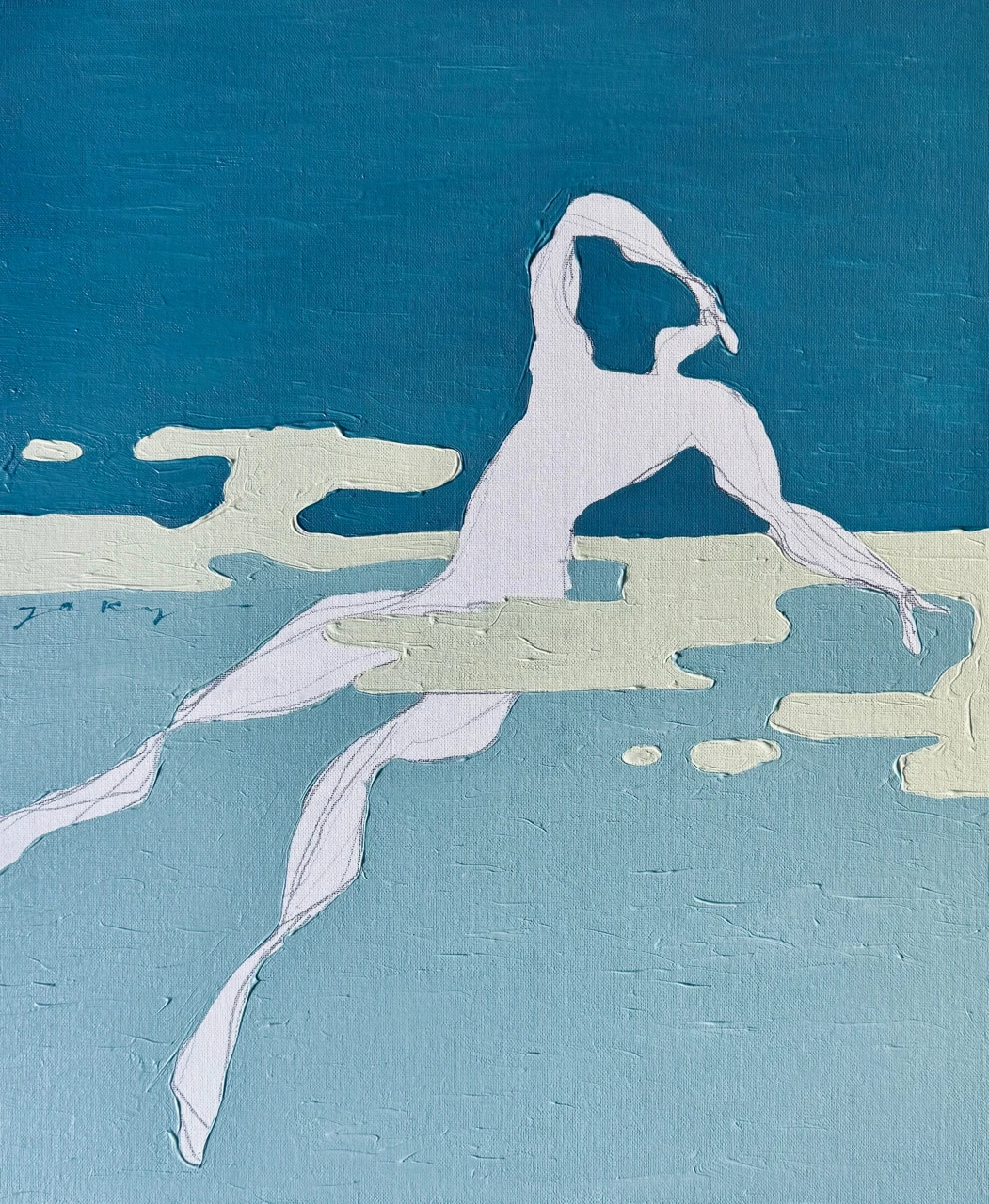 Автор так описывает рождение картины: "Бумага и вода с одной стороны материалы несовместимые, один изменяет другой. Но здесь автору хотелось показать их единую природу переменчивости и адаптивности. Ровно как пловец на картине то ли плывёт в облаках, то ли купается в морских волнах."