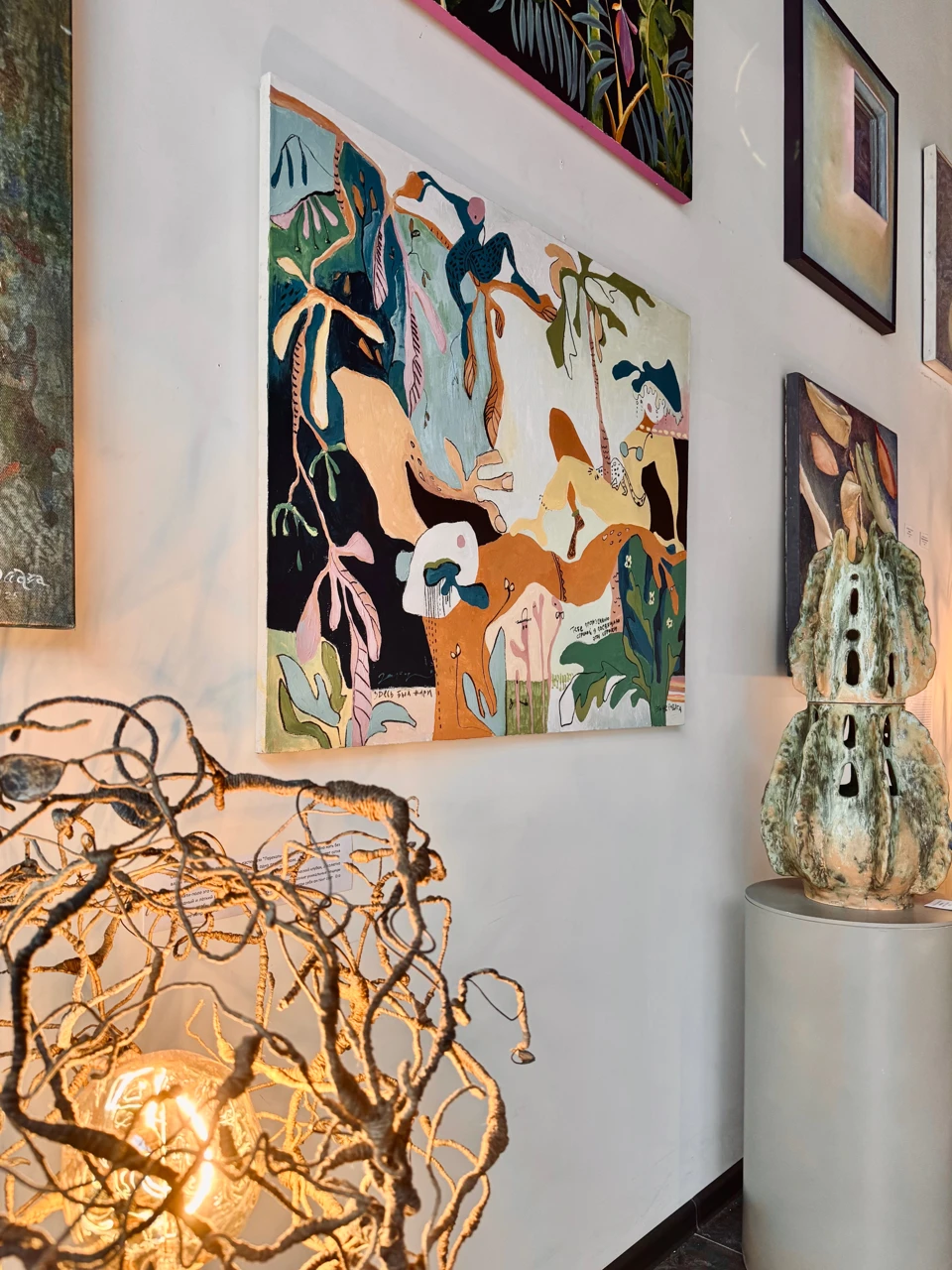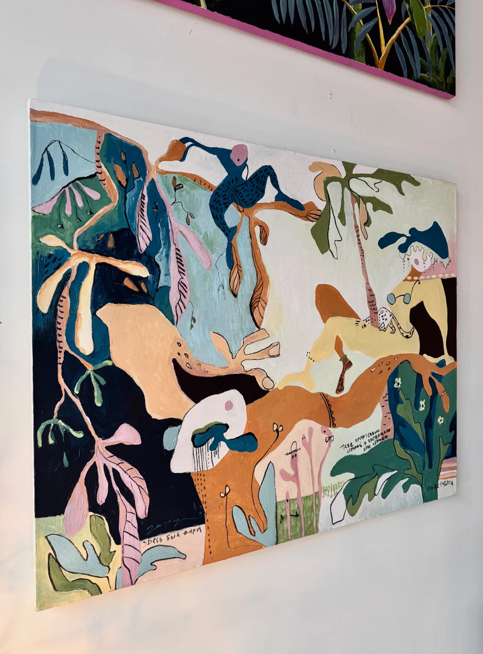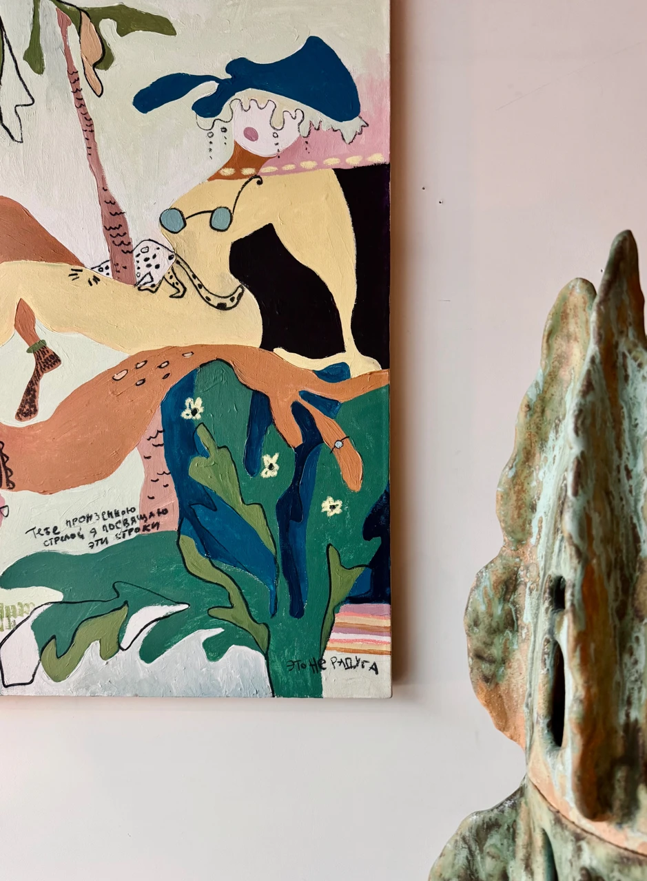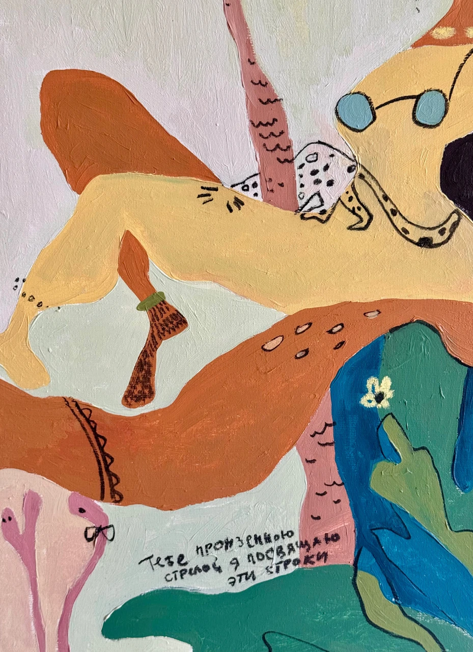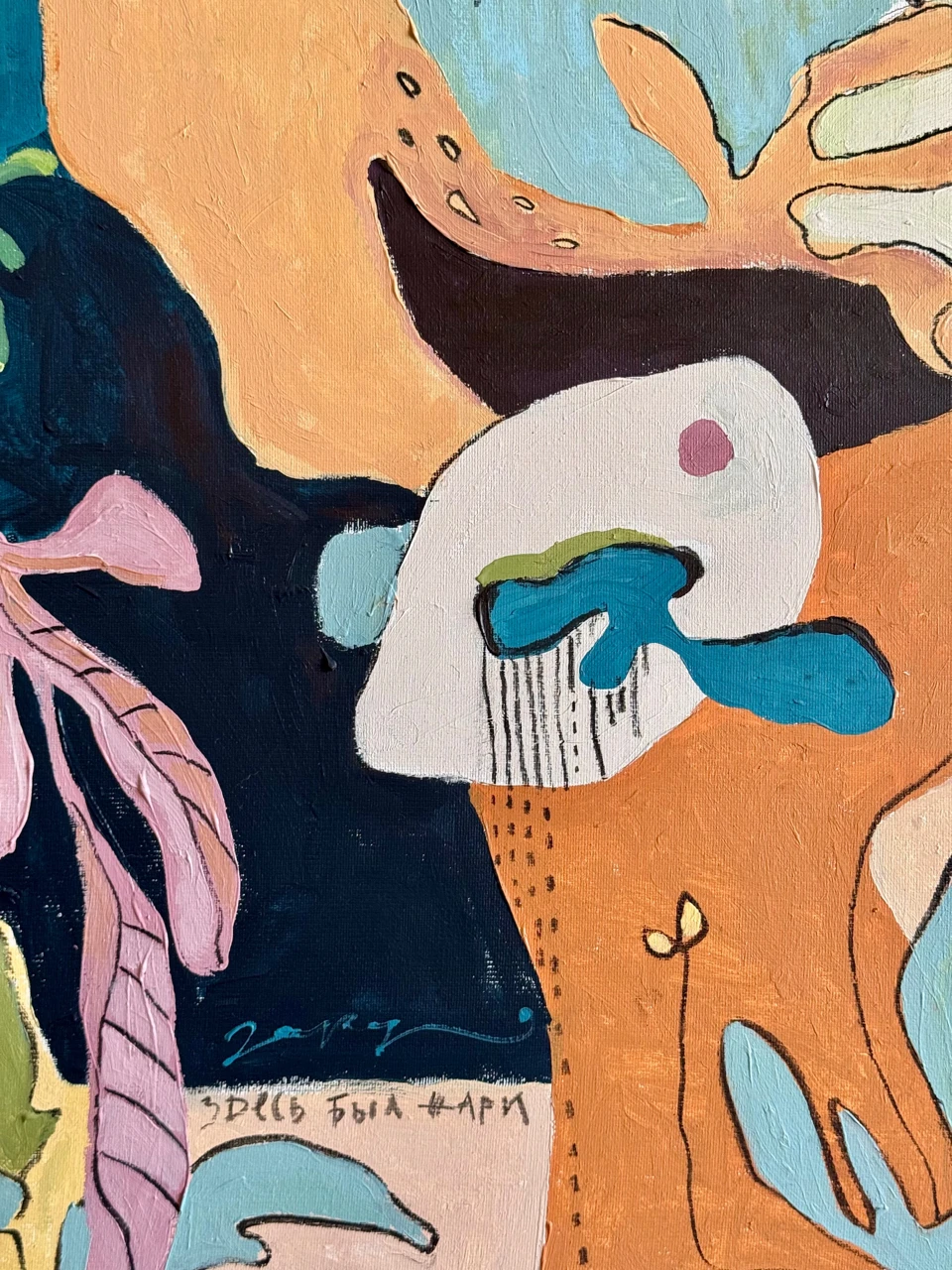 Узнаваемые работы Жени Жари (псевдоним по родной нанайской деревне на Дальнем Востоке) отсылают к коллажам Матисса, цветам Гогена и Хокни, плоские абстрактные изображения автора стилистически ведут диалог с такими направлениями как Hard-edge painting, SuperFlat Мураками в их наивной интерпретации.