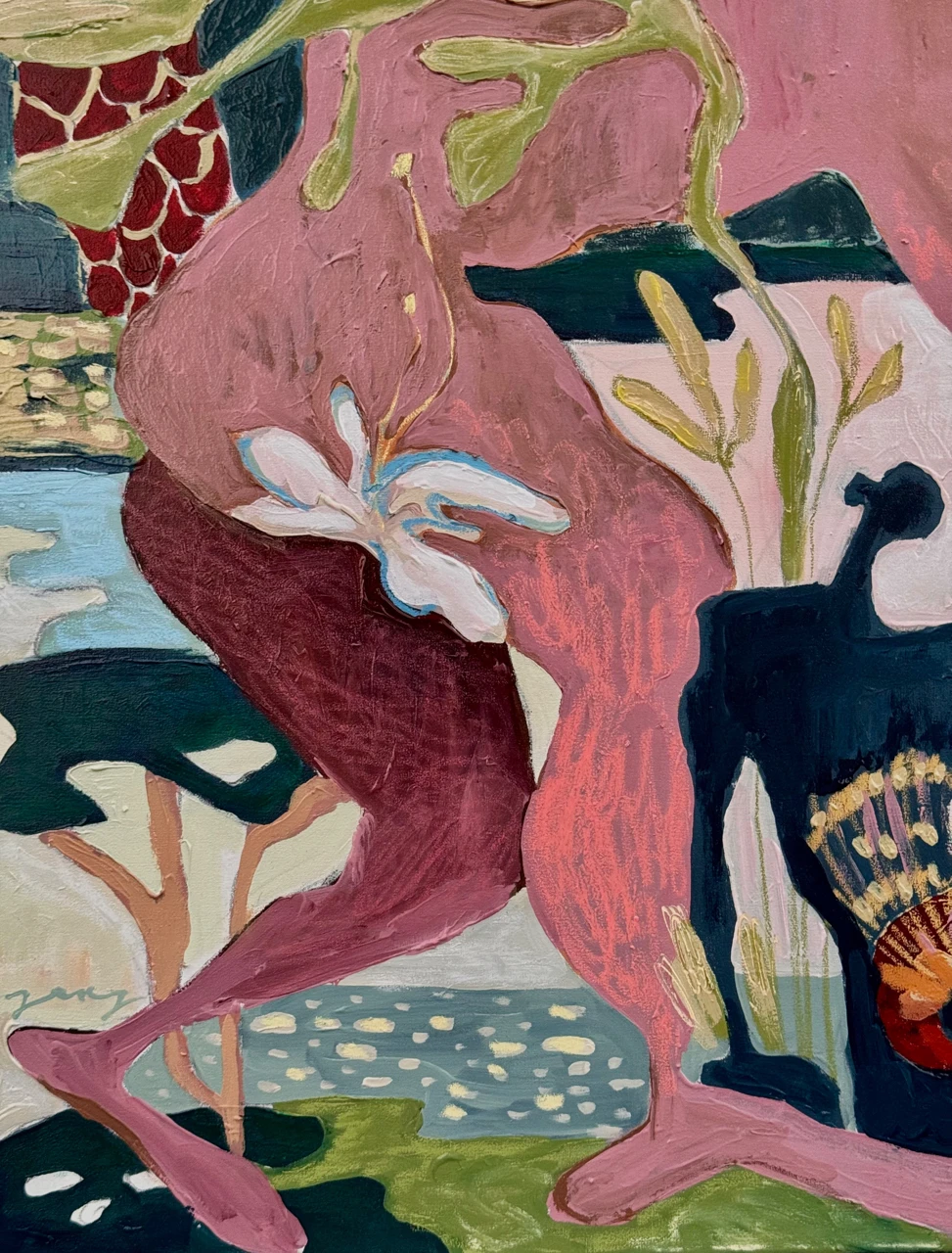 Узнаваемые работы Жени Жари (псевдоним по родной нанайской деревне на Дальнем Востоке) отсылают к коллажам Матисса, цветам Гогена и Хокни, плоские абстрактные изображения автора стилистически ведут диалог с такими направлениями как Hard-edge painting, SuperFlat Мураками в их наивной интерпретации.