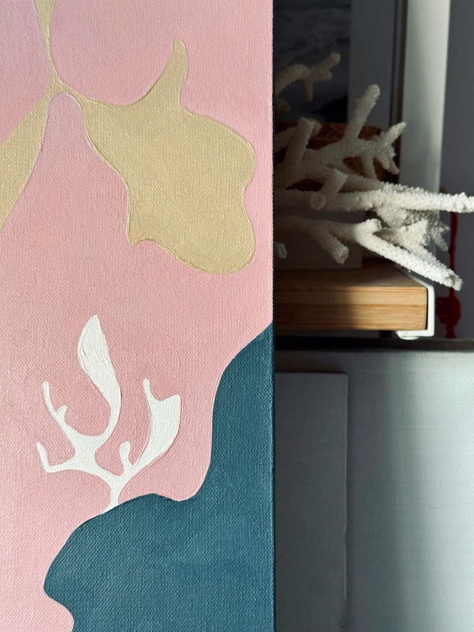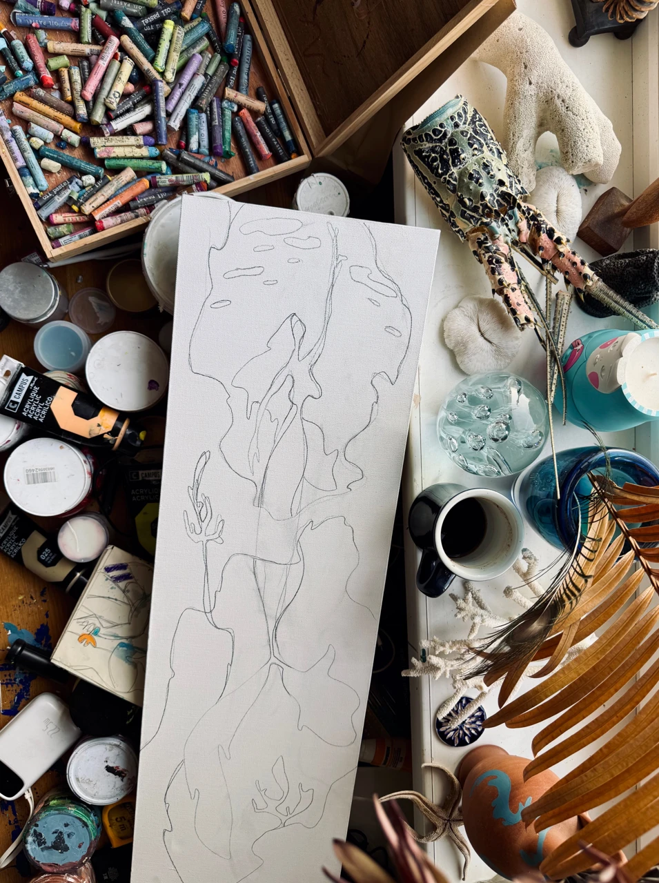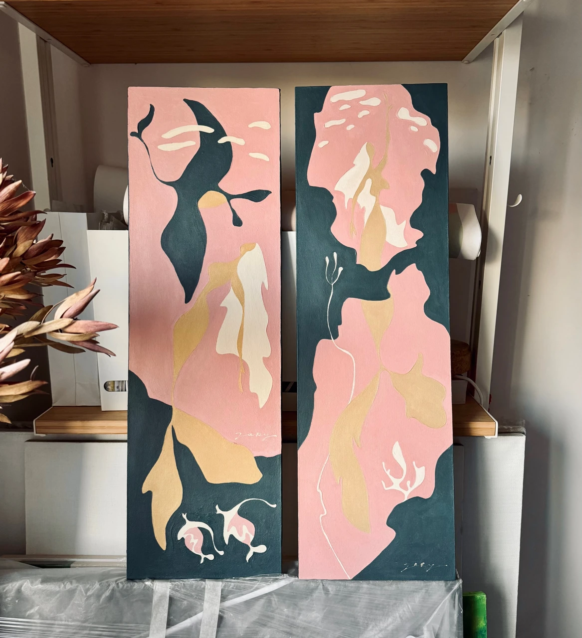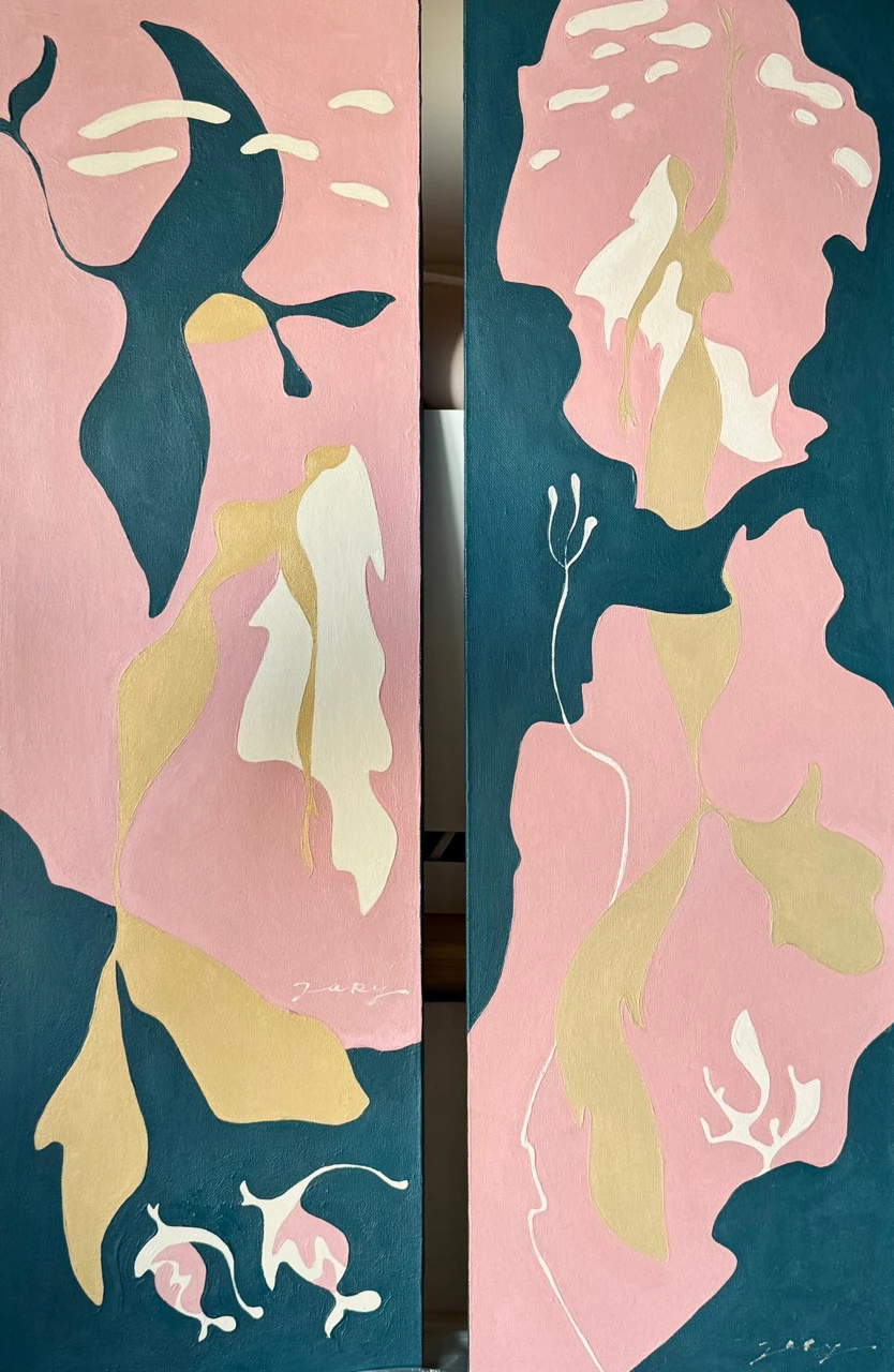 Диптих новой серии "Подводные люди". Страсть и увлечение Жени Жари — фридайвинг. Будучи сертифицированным ныряльщиком, в своей художественной практике переосмысляет полученный под водой опыт и воплощает подводные переживания на холст. Первый диптих в этой серии показывает русалку то ли с белокурыми развивающимися в танце волосами, то ли фату невесты.