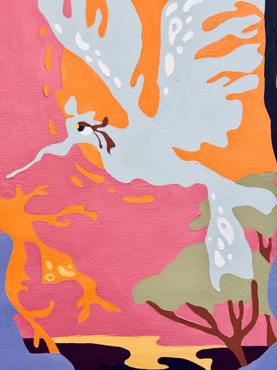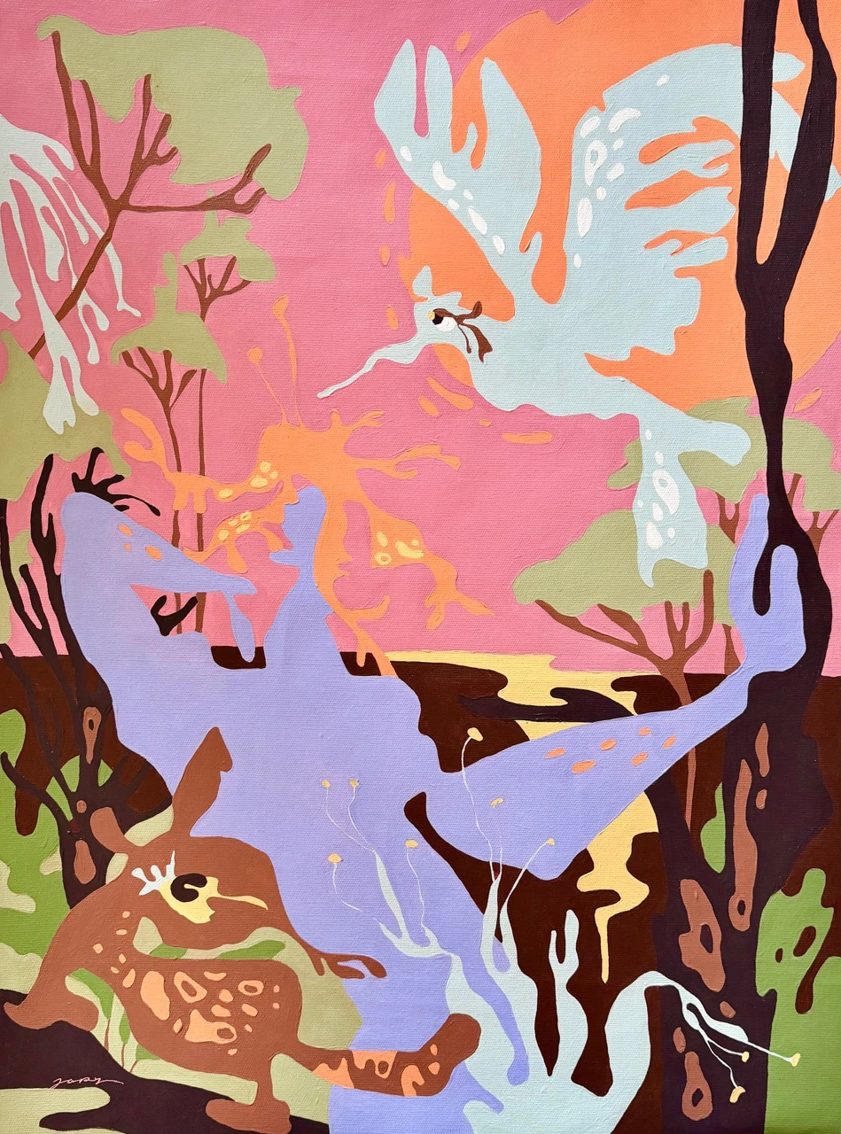 В таких биоморфных линиях моё стремление отразить плавучесть природных форм, я морской человек и даже в надводных ландшафтах все мои персонажи как будто плывут, мерно покачиваясь в толще воды. То ли растения, то ли кораллы, то ли оленёнок, то ли морской конёк, орнаменты на шёрстке то ли от леопарда, то ли голожаберного моллюска, а птичьи перья как ламинария... Для меня в линиях важна эта плавность, кажется любые резкие углы будут резать меня и зрителя, а мне важен комфорт и включённость в процессы на полотне, мир кораллов и рыб, растений и птиц, мир странностей — мой придуманный сюрриалистичный мир, явленных в цвете.