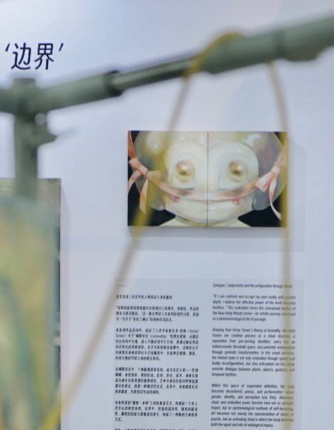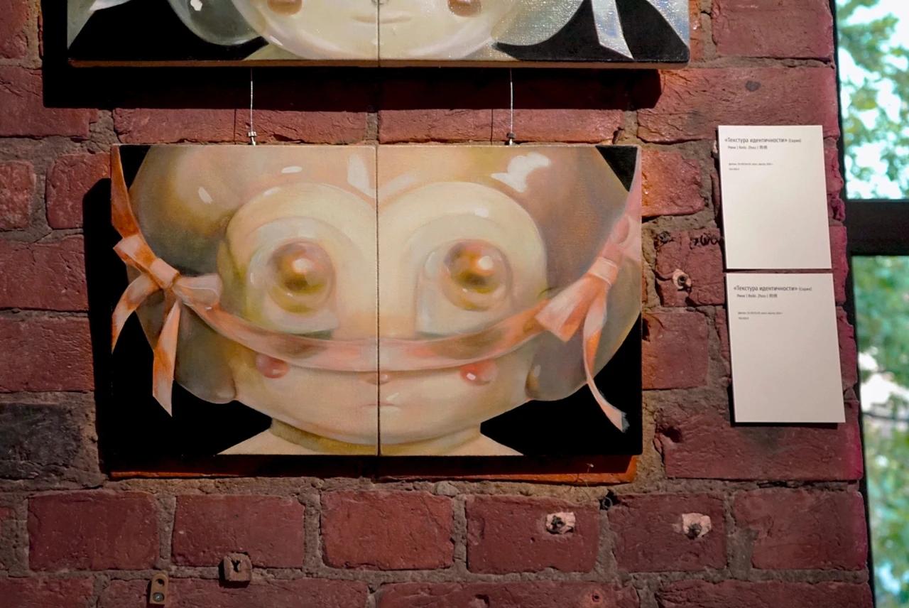Блеск и структура тела отсылают к визуальному языку традиционной китайской керамики, символизируя историчность и материальность культурного тела. Поверхность фигуры украшена орнаментами, заимствованными из китайской традиции, нанесёнными трафаретной техникой уже после завершения живописи. Используя ракель, я наслаивала эти узоры на поверхность, вводя дополнительный уровень культурной текстуры и телесной памяти. Этот процесс — на грани между ручной работой и механическим воспроизведением — подчёркивает взаимодействие между орнаментом и кожей, подобно тому, как идентичность постоянно вплетена в систему символов и кодов.