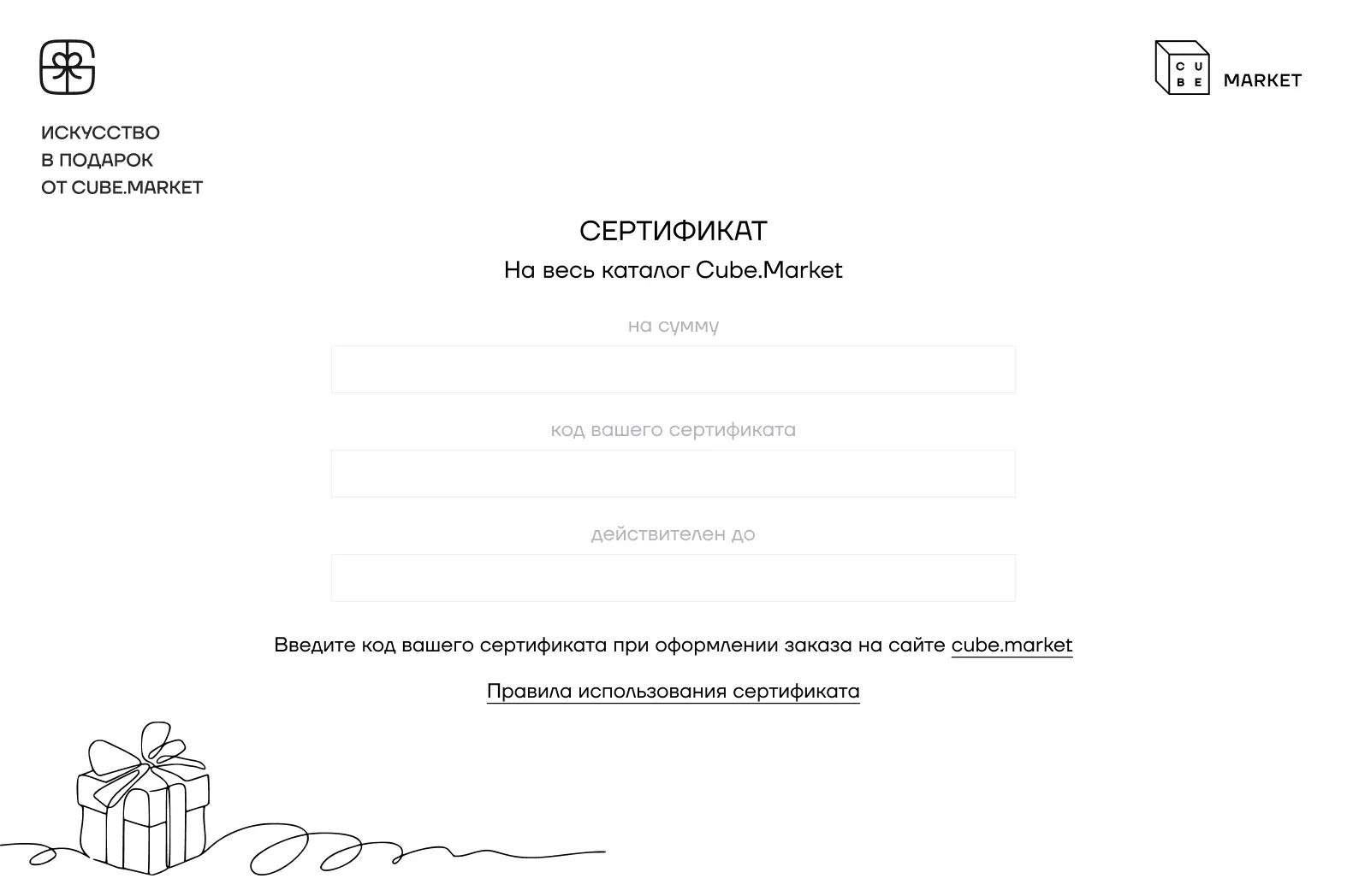 Подарочный сертификат Cube.Market — это возможность подарить искусство, которое точно понравится. Сертификат распространяется только на искусство, представленное онлайн на сайте. Для своего подарка вы можете выбрать любую сумму от 1000 до 100 000 рублей.
