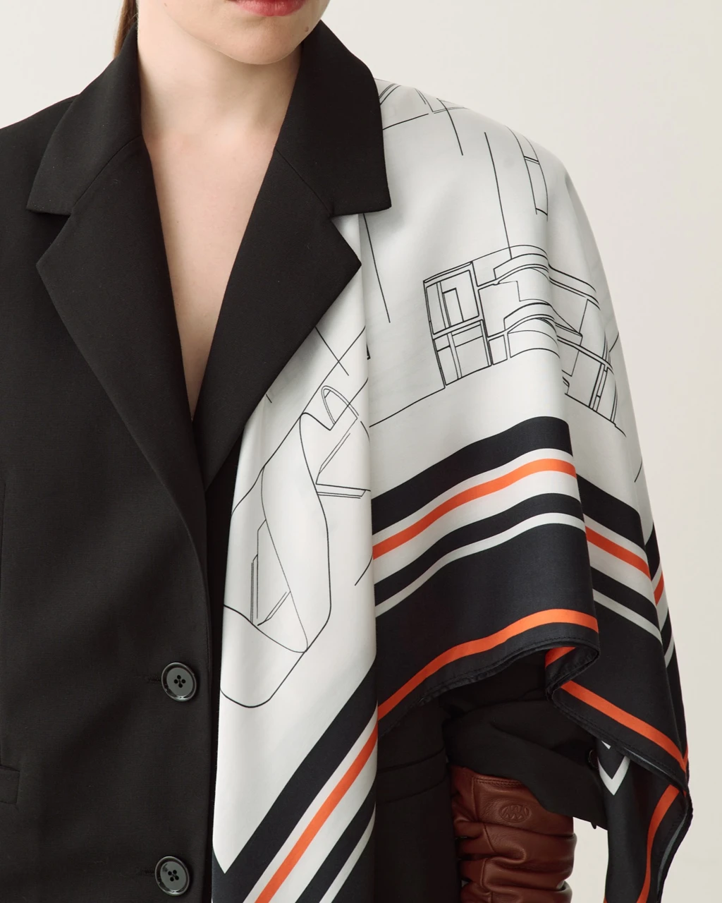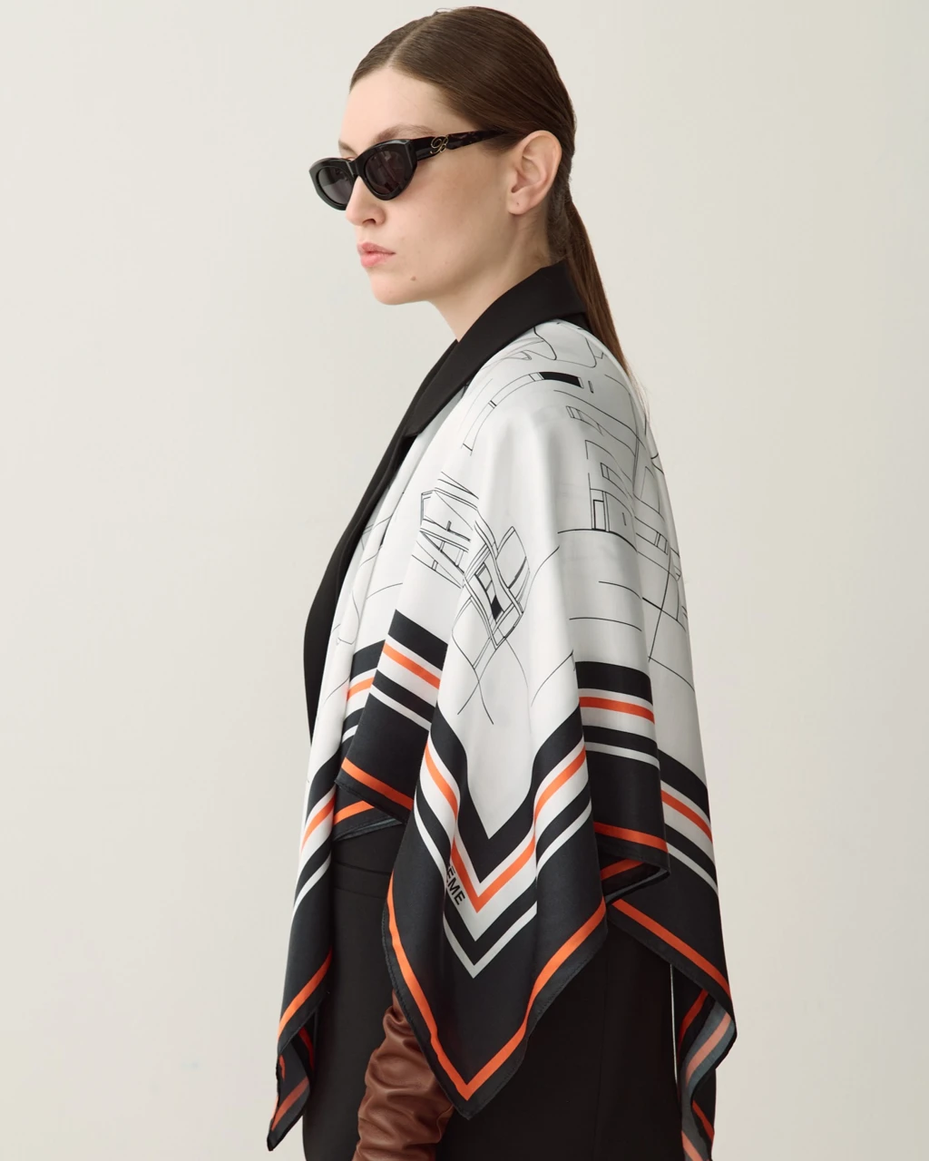 Лимитированная серия платков ZOTĒME посвящена Ле Корбюзье и его культовому проекту Вилле Савой — объекту архитектуры, опередившему время. Винтовая лестница, протяжённые горизонтали, минималистичные проекции и акцентные цвета — чёрный и красный — стали основой образа, где ткань превращается в диалог архитектуры и искусства. В нашем изделии чёткая архитектурная геометрия встречается с тактильностью шелка. Это не просто аксессуар, а манифест минимализму и любви к архитектуре. Стилизуйте по настроению: завяжите на шее, используйте как пояс или превратите в топ.