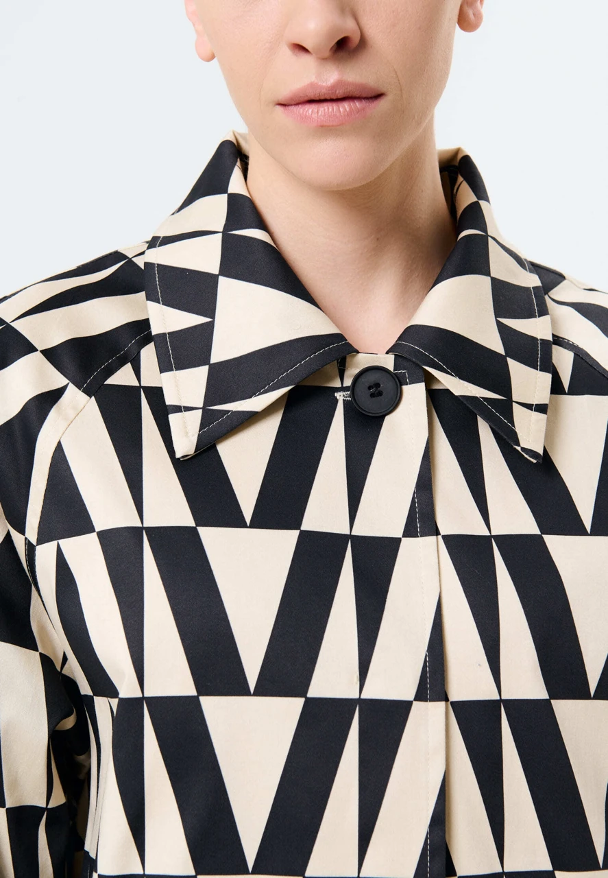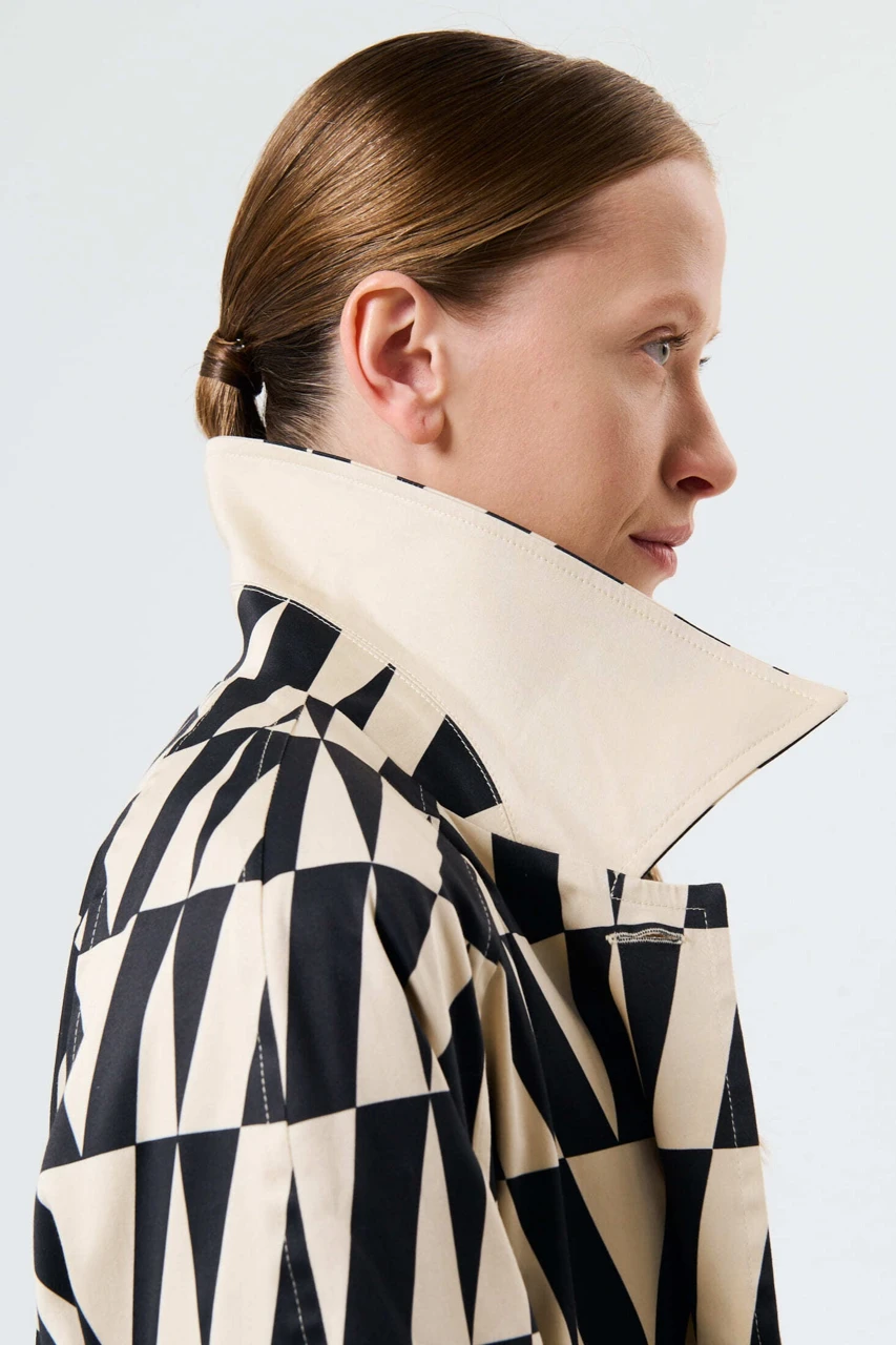 Геометрическая основа рисунка авторства Любови Поповой (1923), которую мы перенесли на хлопковую ткань тренча, универсальна и позволяет составлять множество стилистических комбинаций, несмотря на яркость изделия. Шелковистая подкладка делает тренч более комфортным. Застегивается на пуговицу и кнопки.