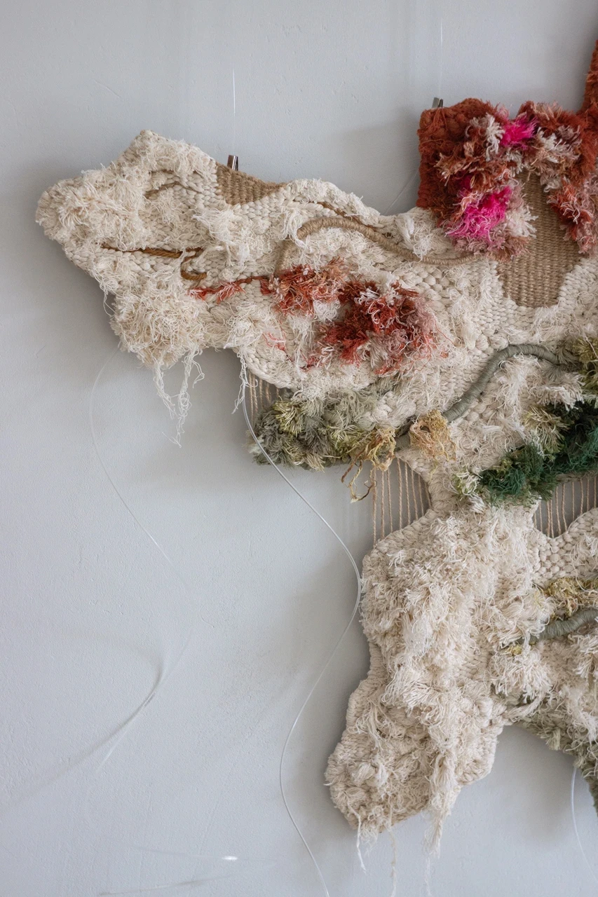Это важная для меня работа, и я рассматриваю ее как первую для будущей серии. Визуально она объединяет все мои любимые приемы в ткачестве: биоморфный контур, апсайкл-материалы, добавление нетканых элементов, пропуски в ткачестве и фактуры, напоминающие природные поверхности.