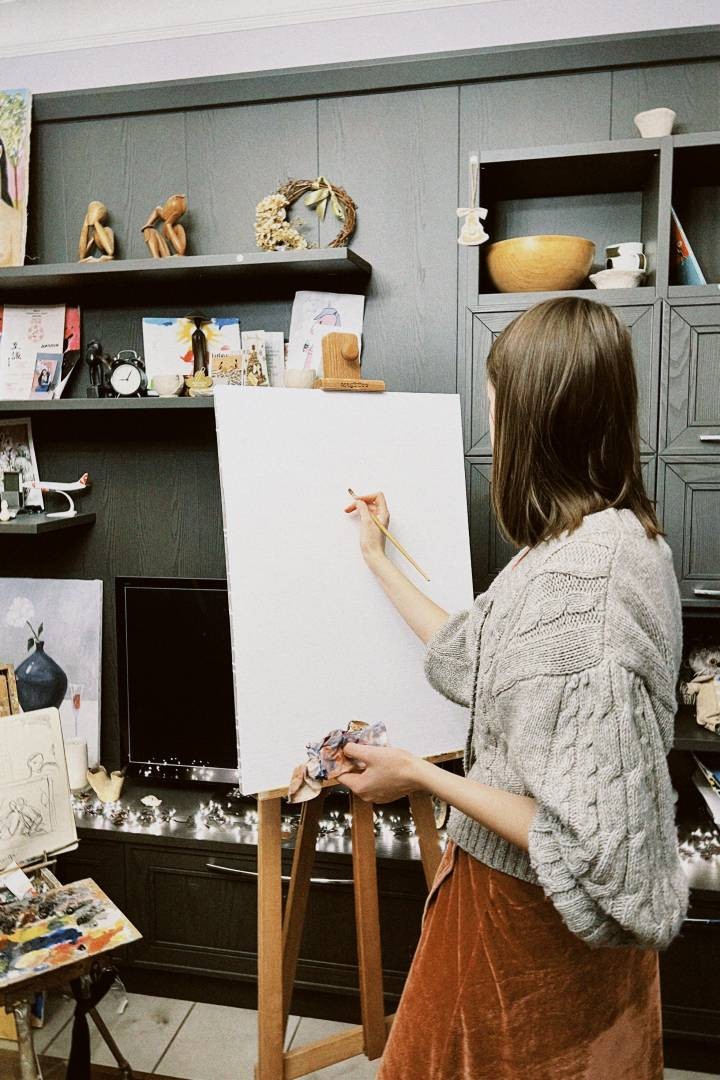 Мой рабочий день начинается не слишком рано, чему я безумно рада. Перед тем как начать работать над картинами или эскизами, я практикую медитации. Мне очень важно разгрузить мозг и настроиться. Я очень люблю наряжаться, да, я знаю, что может испачкаться одежда, но мне все равно это нужно. Дальше я много сижу за мольбертом и пишу картины, кстати, работаю я дома, поэтому обычно у меня на руках (скорее это обязательный процесс) сидит мой песик Марципан. Включаю музыку, она у меня очень разная. Также мой день это, конечно, не только картины: очень часто слежу за объявлениями на open call, отправляю заявки, со стороны наверное похоже больше на работу офисного сотрудника, но это тоже часть работы художника.