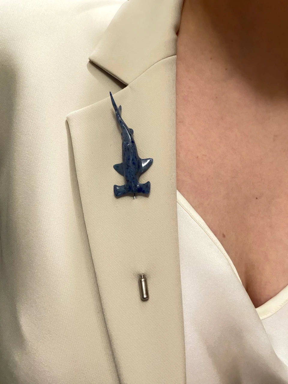 Брошь на шляпочной булавке «Акула-молот» навеяна образом сильной личности. Сама пластика и повадки акулы говорят о её силе и уме. Взяв данную форму мы увидели плавность и в то же время её неумолимость.